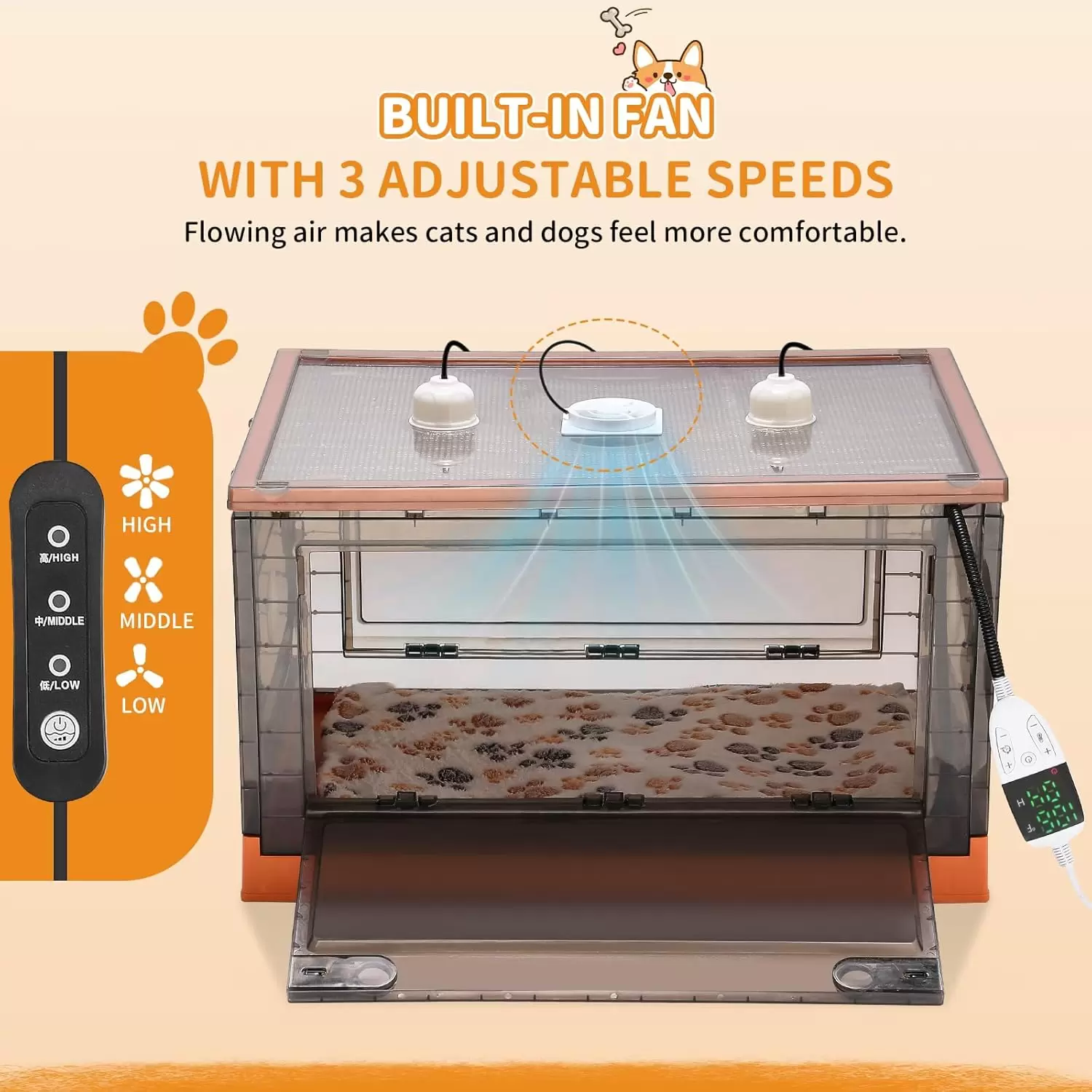 Ventilador ajustable de 3 velocidades: el diseño del ventilador mejora la circulación del aire dentro de la caja, asegurando comodidad para mascotas de cualquier tamaño. La velocidad del ventilador se puede ajustar de acuerdo a la temperatura interior, por lo que es adecuado para todas las estaciones, ya sea primavera, verano, otoño o invierno.