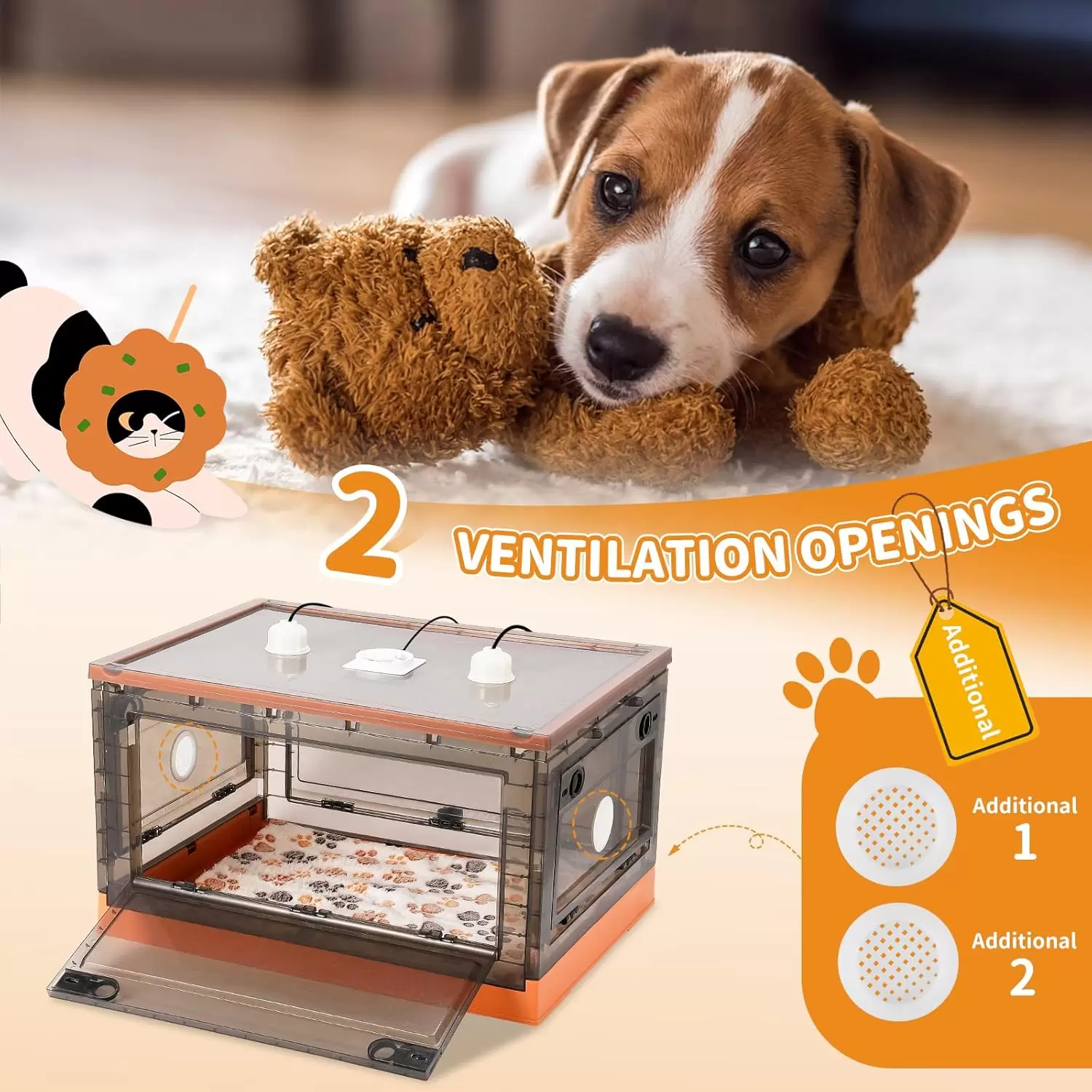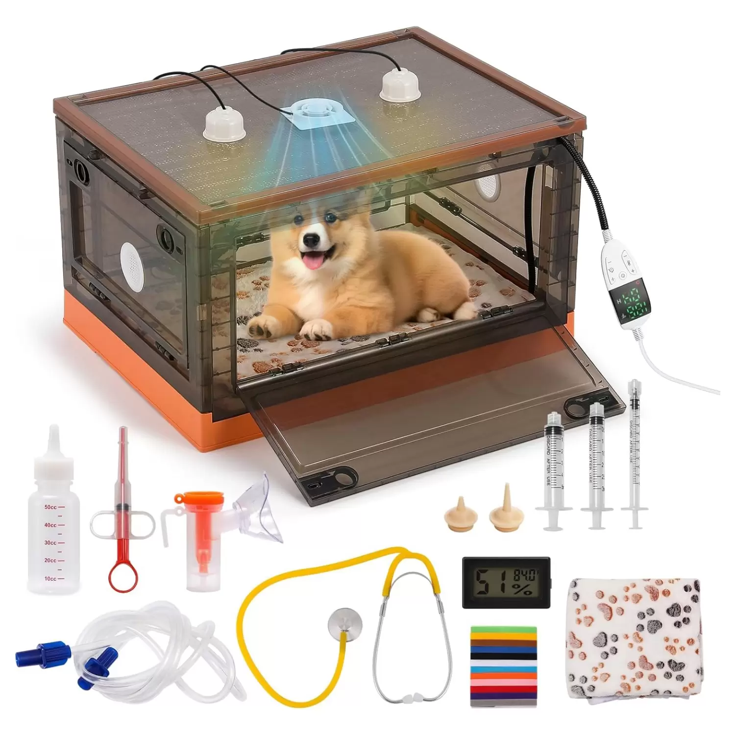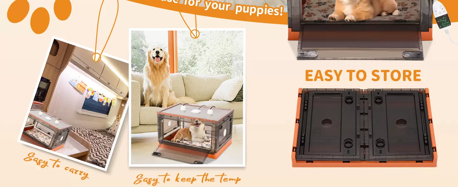 Lo que obtienes: recibirás 1 incubadora de cachorros, 1 almohadilla térmica con control de temperatura y tiempo, 1 termómetro, 1 manta, 2 lámparas de calefacción de 50 W, 1 estetoscopio para mascotas, 1 biberón de 1.7 fl oz, 1 atomizador, 1 alimentador, 3 comederos de leche con 3 pezones, 12 collares y 1 ventilador.