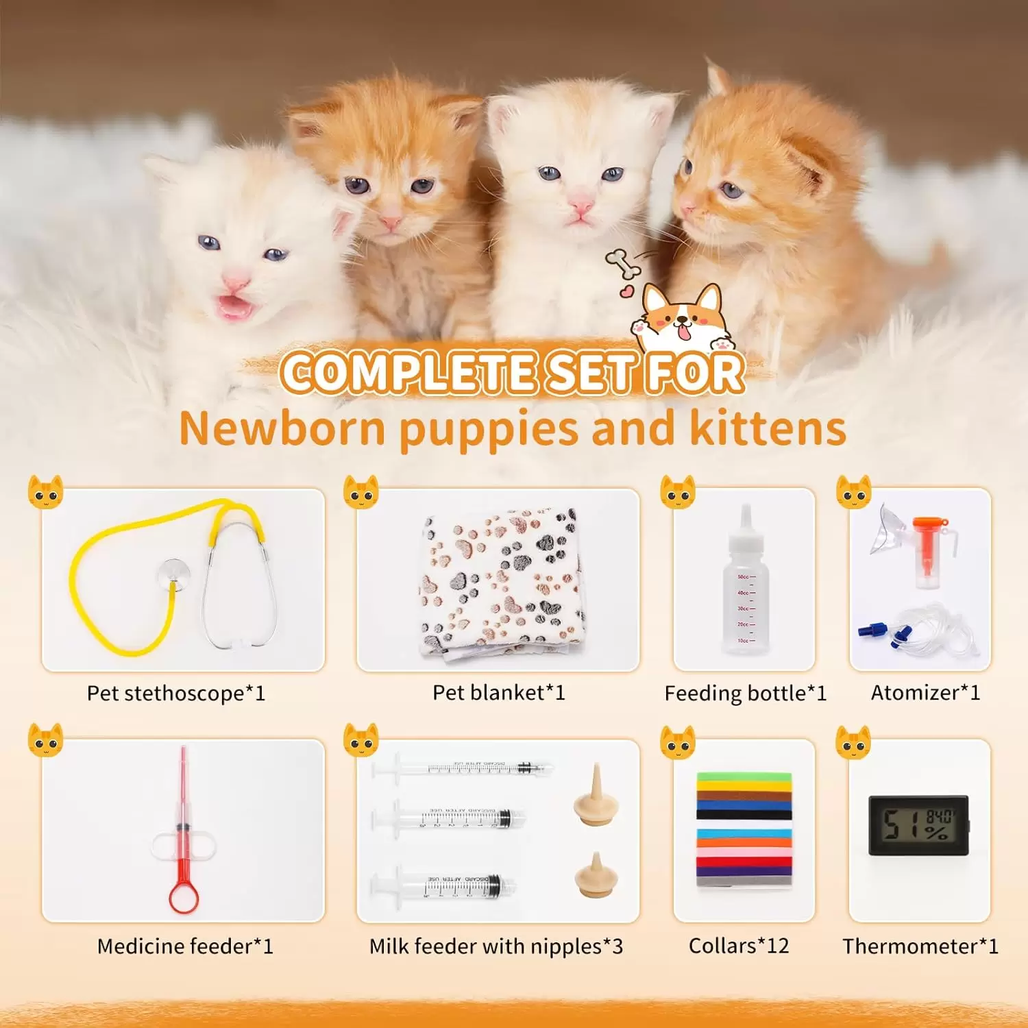 Accesorios completos: equipamos al usuario con todas las herramientas necesarias para criar un gatito o cachorro. Tanto si eres un novato como un veterano, puedes utilizar nuestros productos inmediatamente una vez que los recibas.