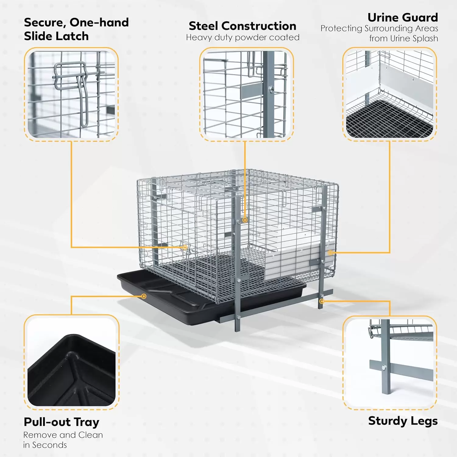 Olvídese del desorden. Esta jaula-corral hace que el mantenimiento sea rápido y cómodo gracias a su bandeja extraíble de limpieza que se desliza fácilmente. Además, incluye un protector/deflector de orina para mantener las áreas circundantes de su hogar completamente limpias. ¡Menos tiempo limpiando y más tiempo jugando!
