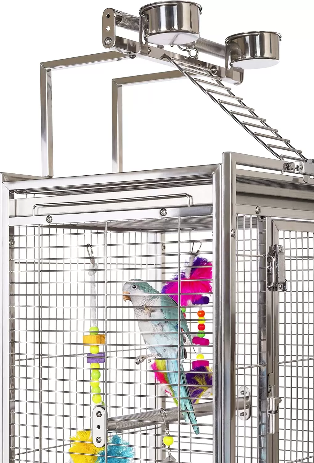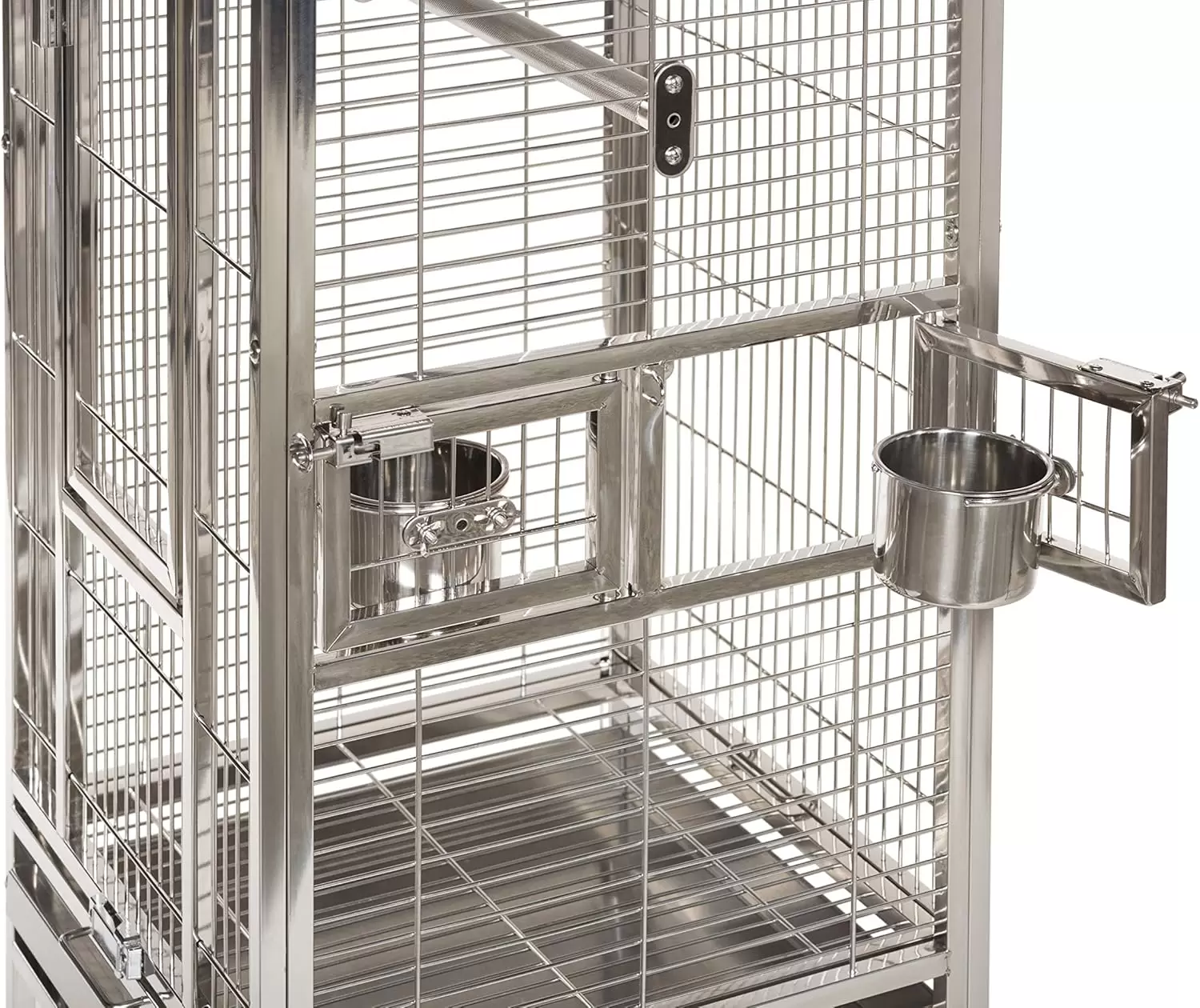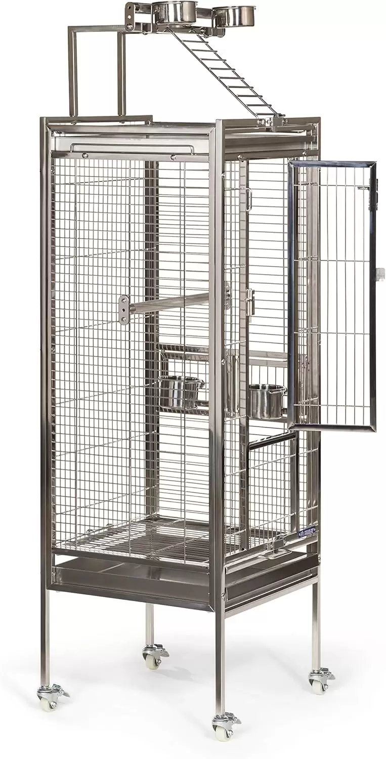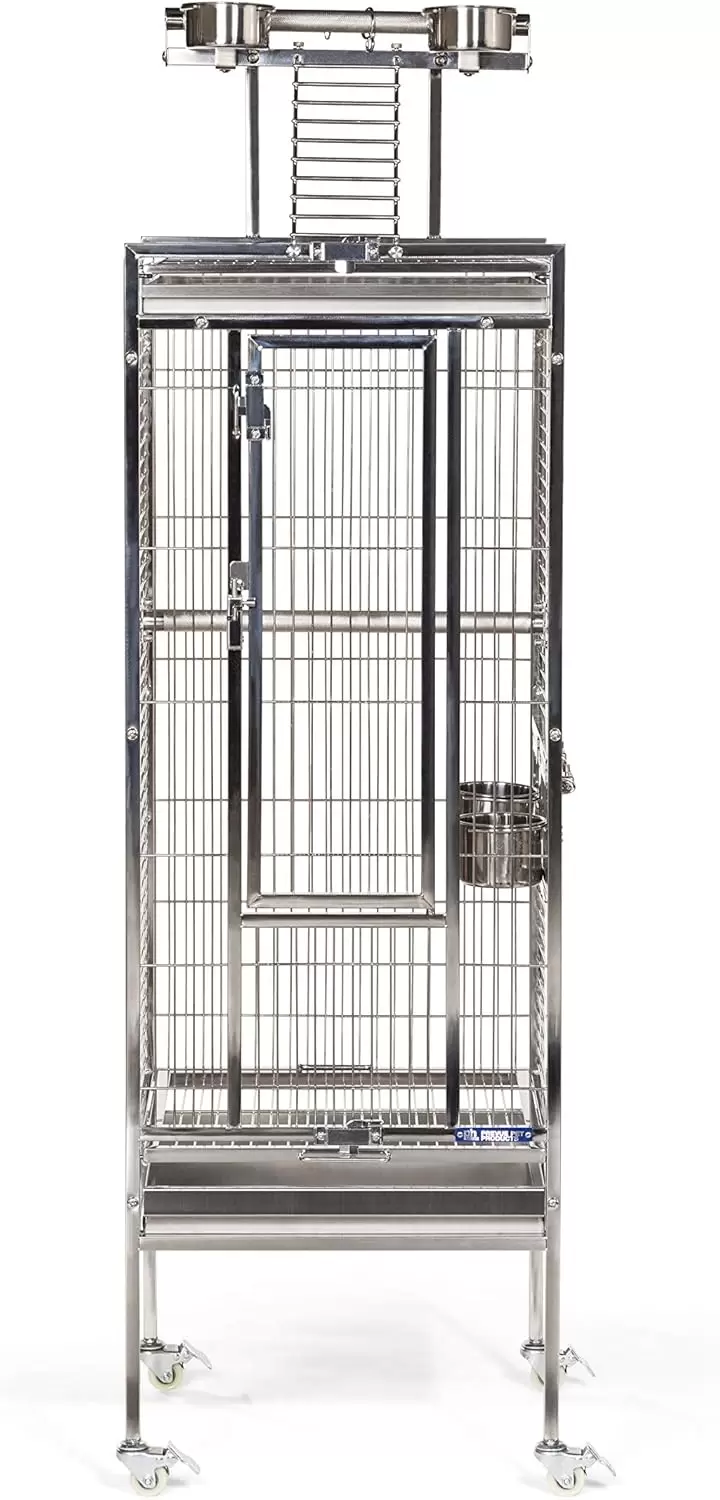 Jaula de acero inoxidable con perchas y vasos. Cuenta con doble cerradura para seguridad. Incluye bandejas extraíbles, perfecta para loros y cacatúas.