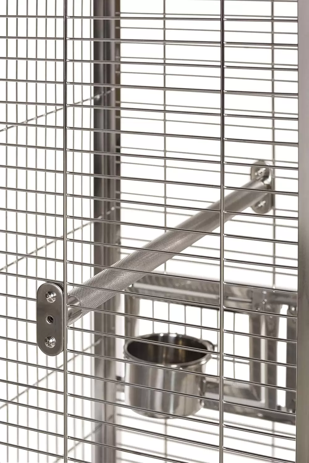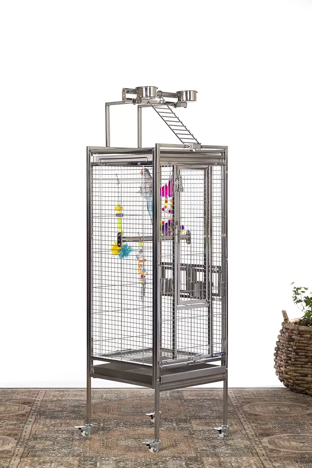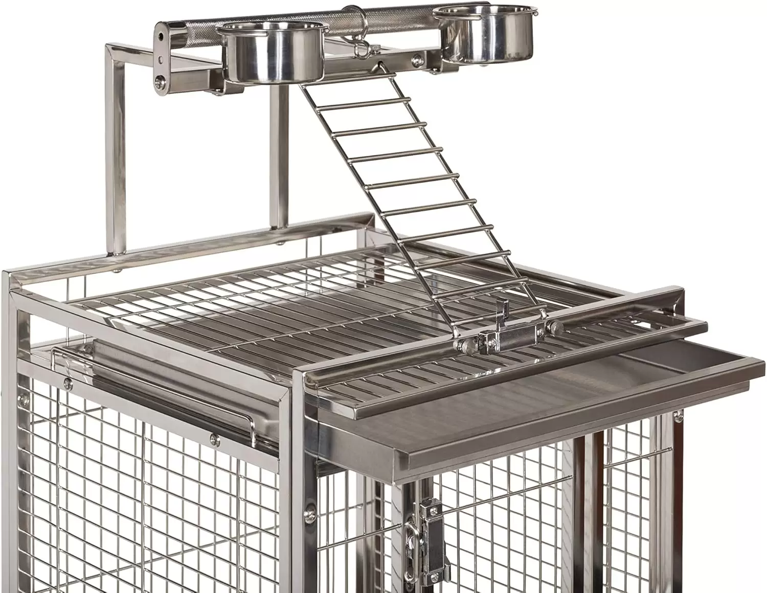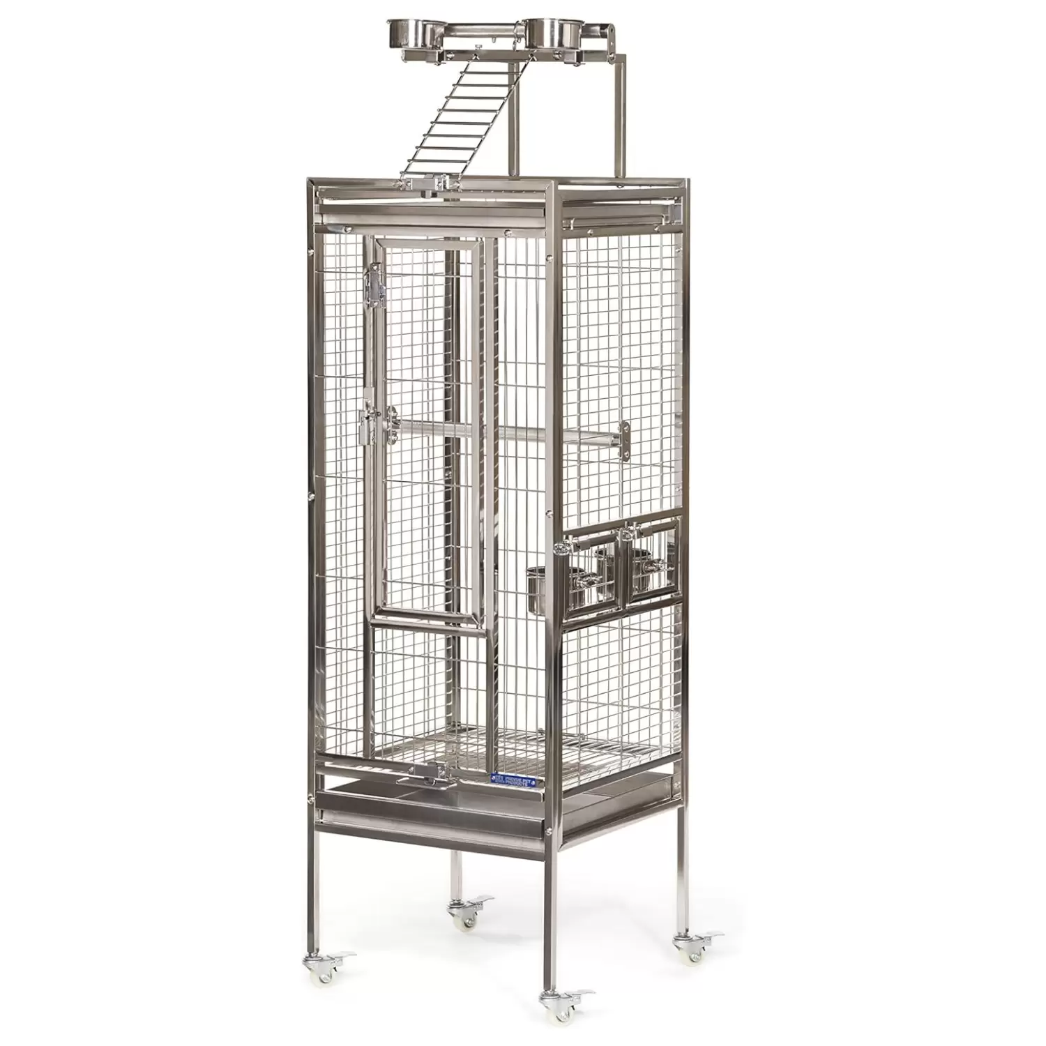 Jaula de acero inoxidable con perchas y vasos. Cuenta con doble cerradura para seguridad. Incluye bandejas extraíbles, perfecta para loros y cacatúas.
