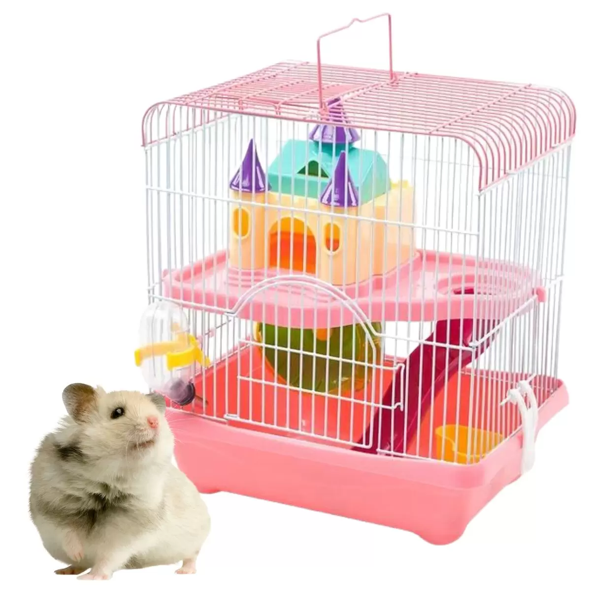 jaula de dos pisos para hámster o roedores pequeños, equipada con una casa con forma de castillo, una rueda de ejercicio, un bebedero y una rampa.