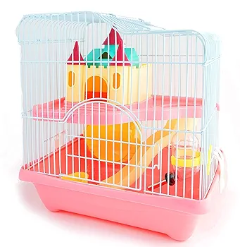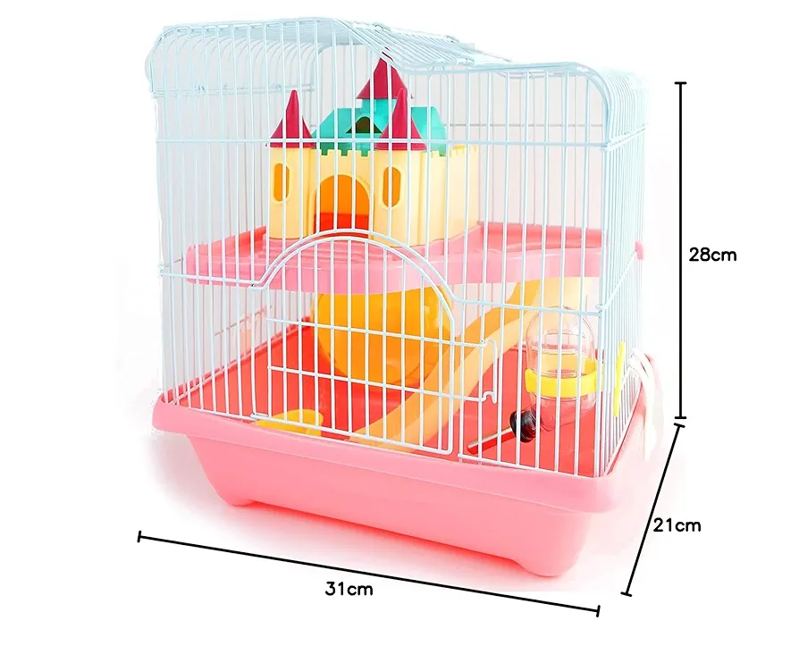Una jaula de dos pisos para hámster en Chile. Incluye accesorios como rueda y tobogán para la diversión. Es un hogar espacioso y completo para tu pequeño roedor.