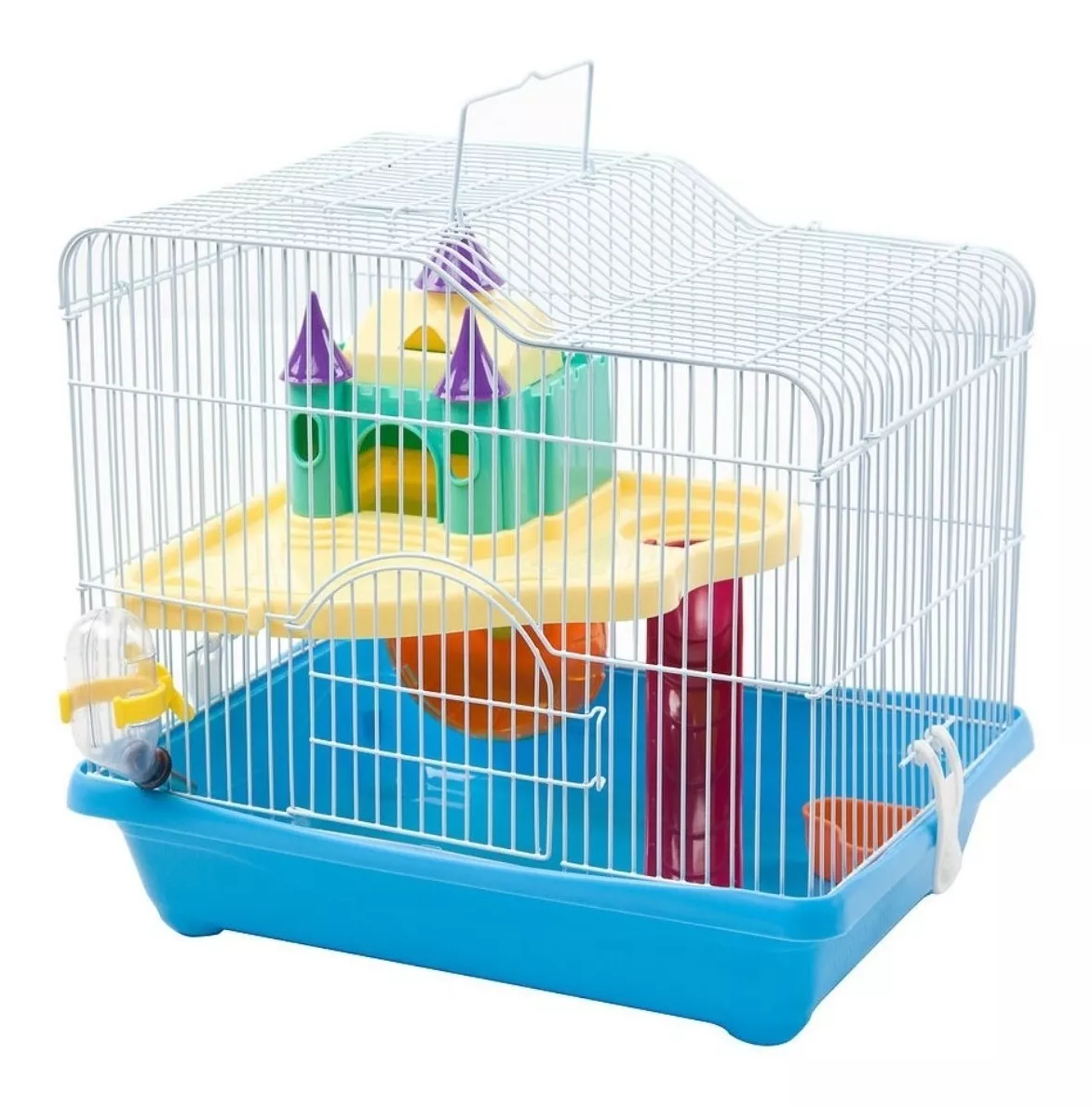 Una jaula de dos pisos para hámster en Chile. Incluye accesorios como rueda y tobogán para la diversión. Es un hogar espacioso y completo para tu pequeño roedor.