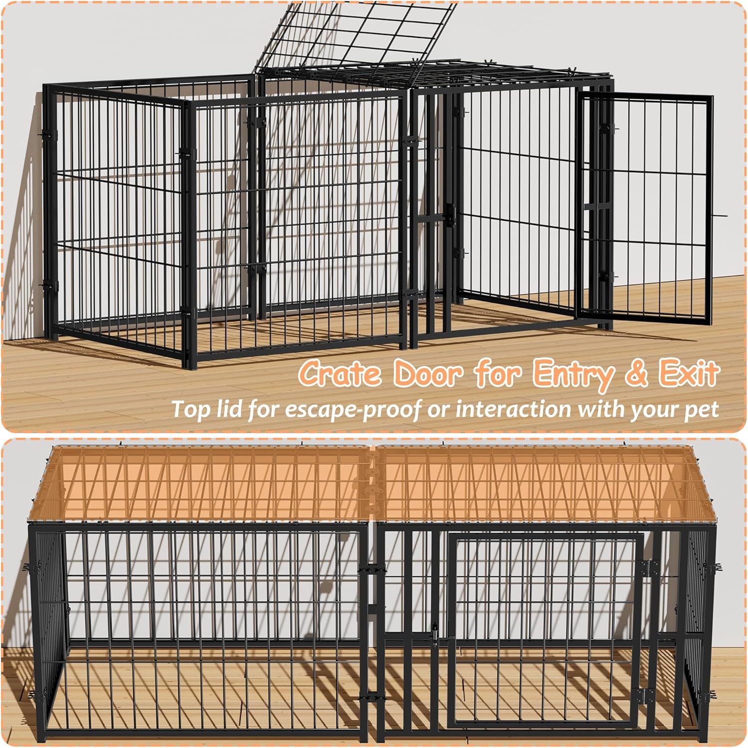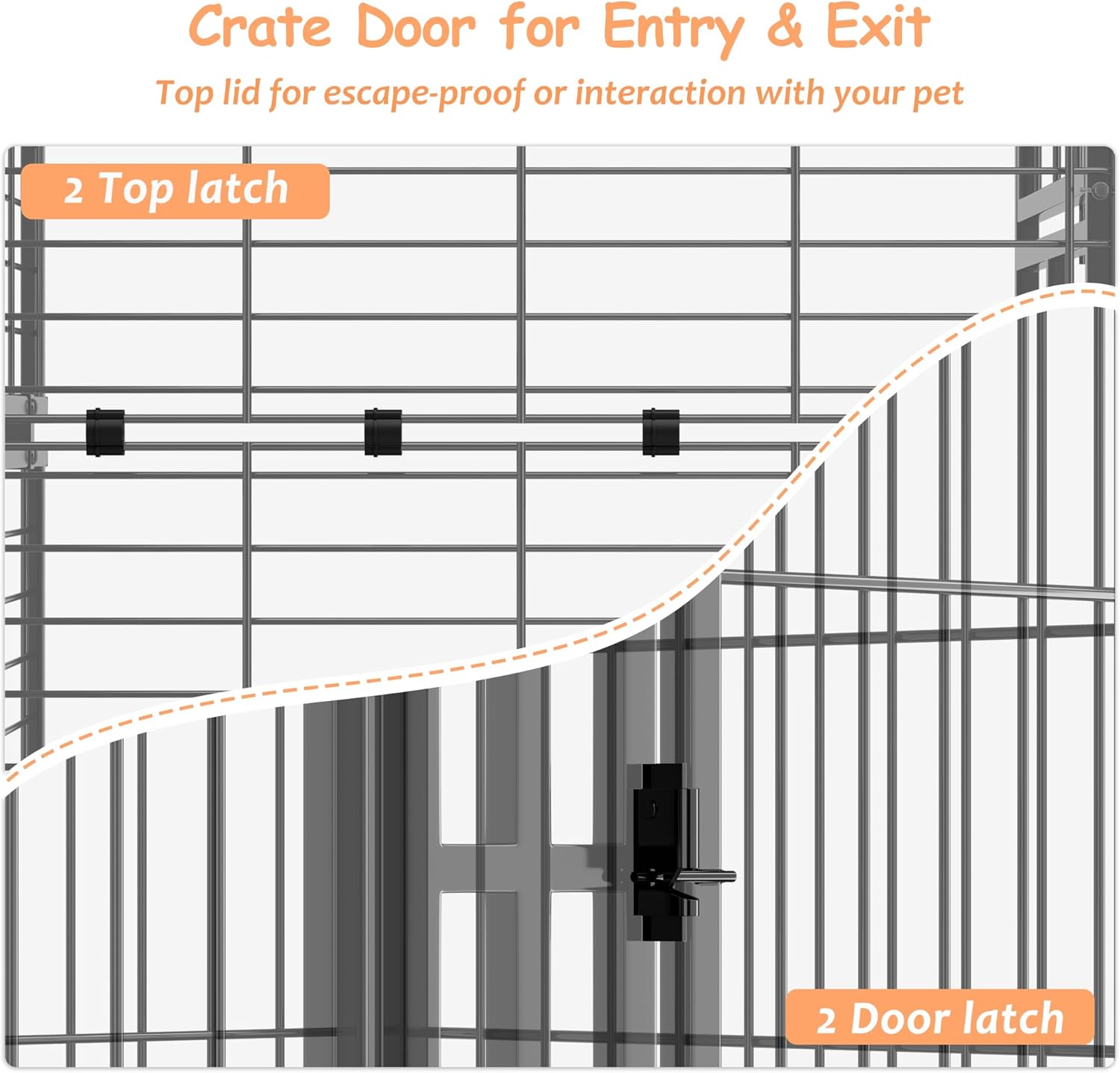 Fácil acceso para mayor comodidad Esta jaula básica para perros con pestillos de puerta permite que tu perro entre y salga fácilmente. Las tapas superiores plegables simplifican la alimentación y el tiempo de juego. Con un umbral bajo, es perfecto para perros de patas cortas, protegiendo sus rodillas mientras pisan.
