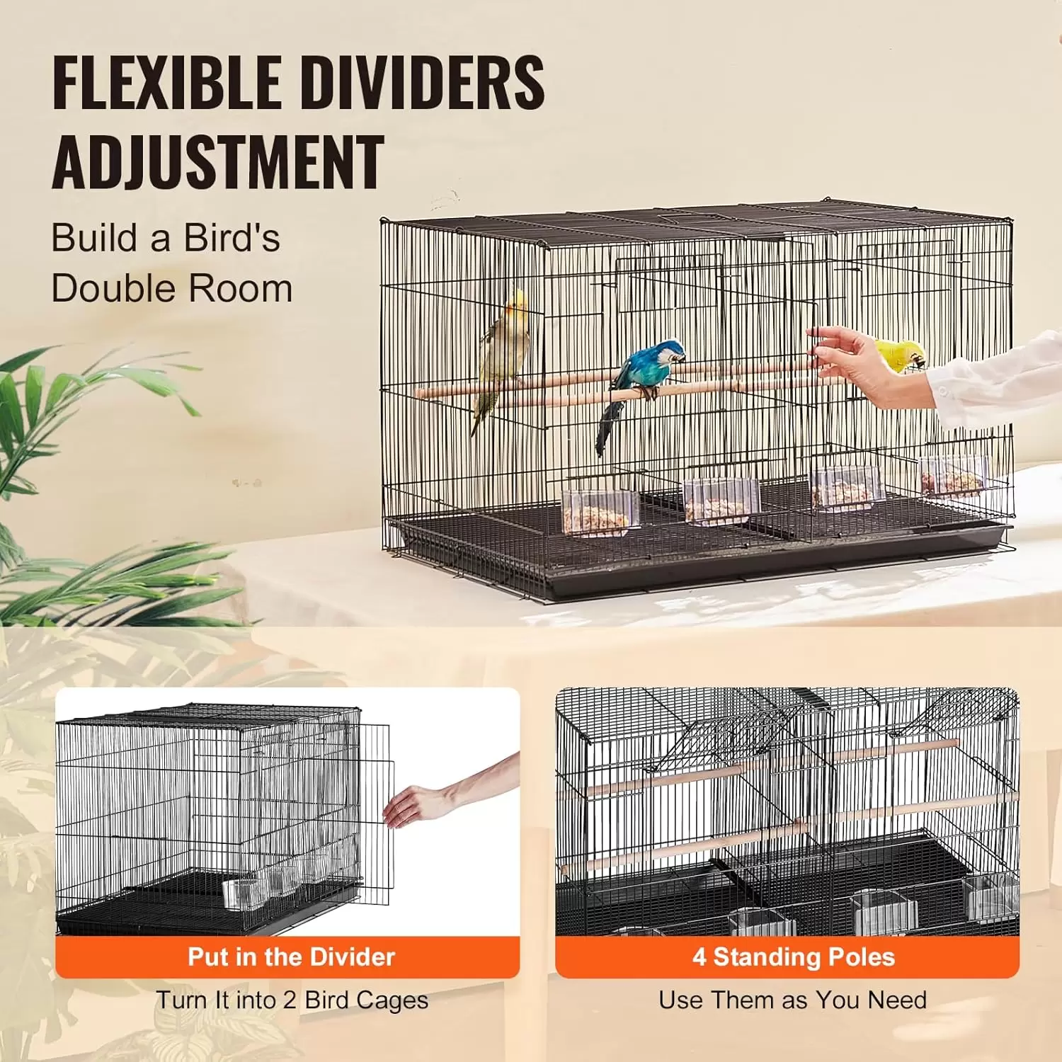 Diseño de divisor flexible: inserte el estante y la jaula para pájaros se puede dividir en dos espacios de vida independientes, especialmente adecuados para mantener diferentes especies de aves.