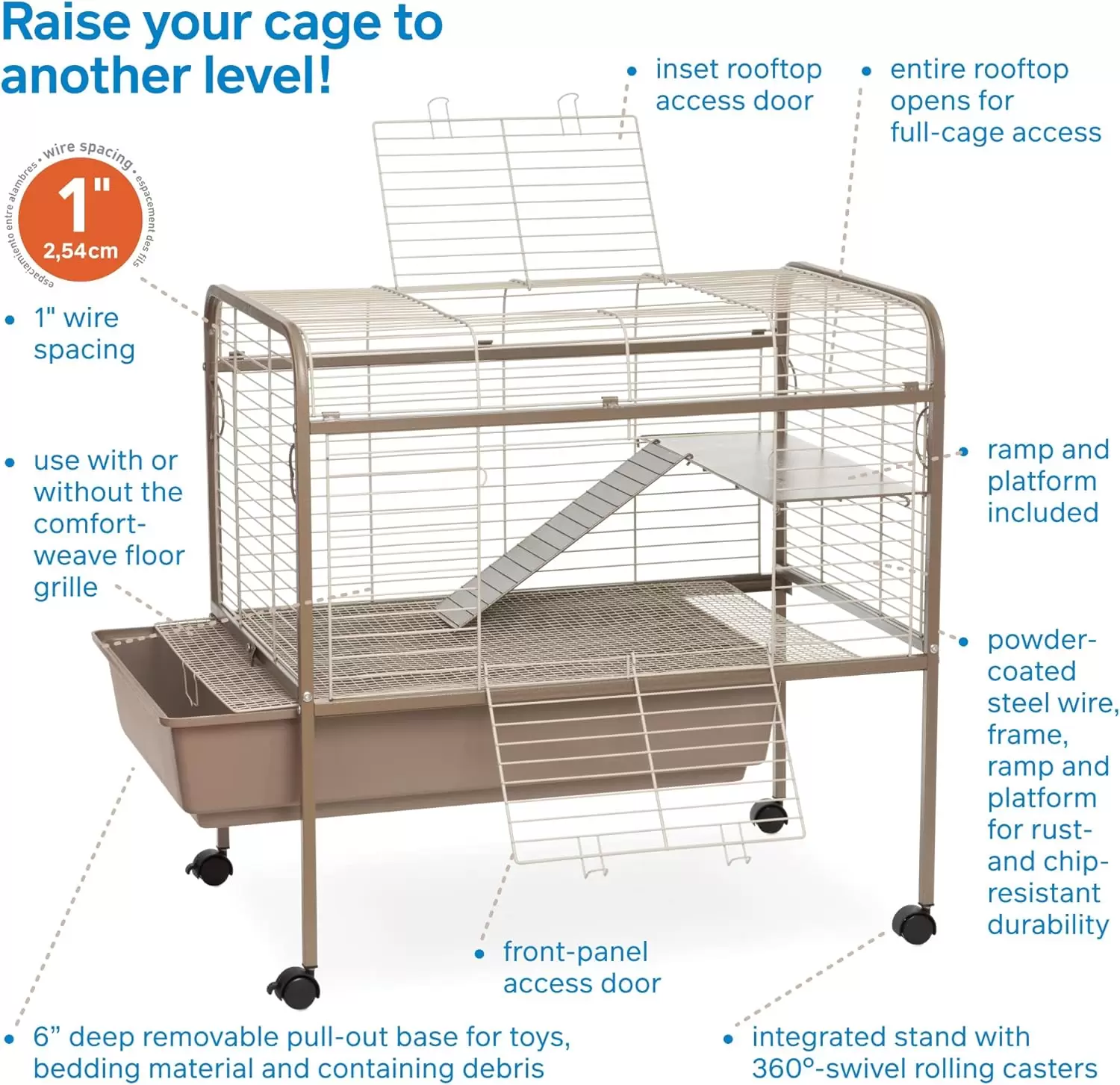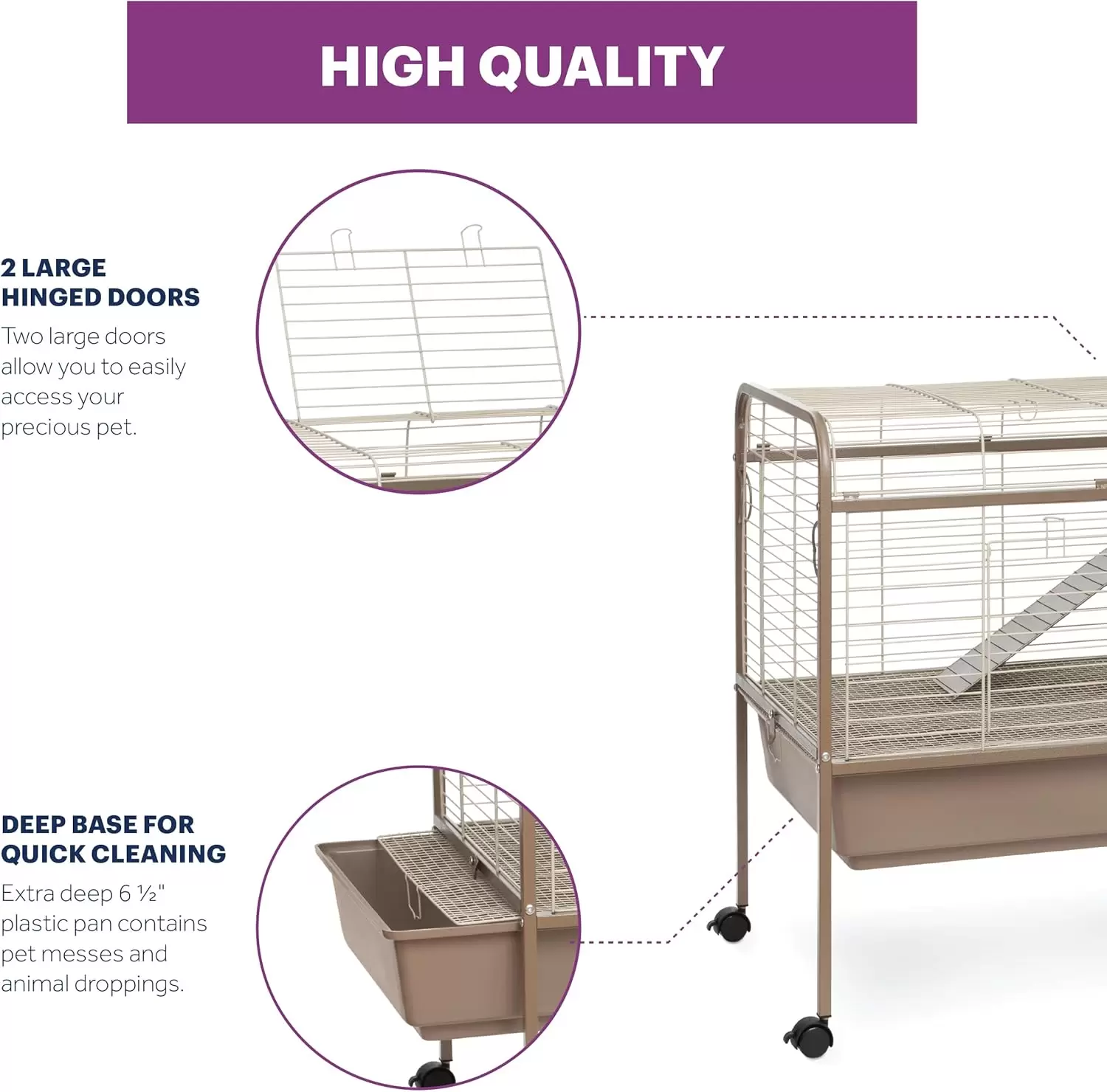 Construida con materiales resistentes y un soporte de acero, esta jaula garantiza una larga vida útil y la seguridad de su mascota.