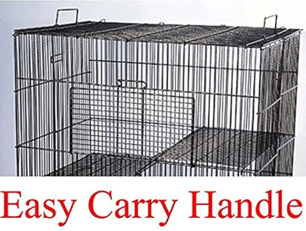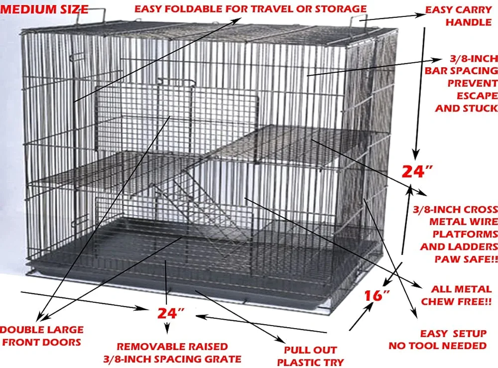 Tamaño mediano de la jaula: 24 pulgadas de largo x 16 pulgadas de ancho x 24 pulgadas de alto. Todo metal, sin masticar. 3 niveles, jaula de alambre con barras transversales apretadas de 3/8 pulgadas de ancho y escaleras, seguro para patas