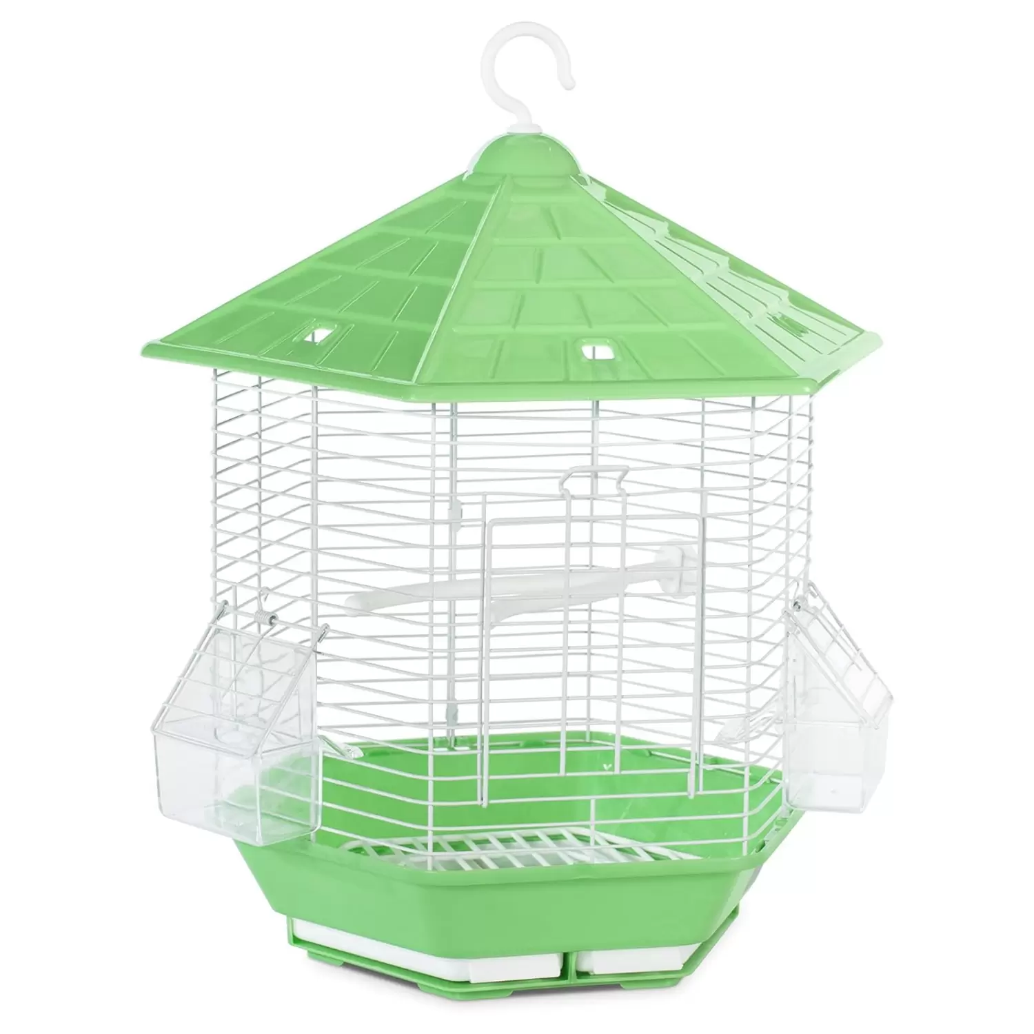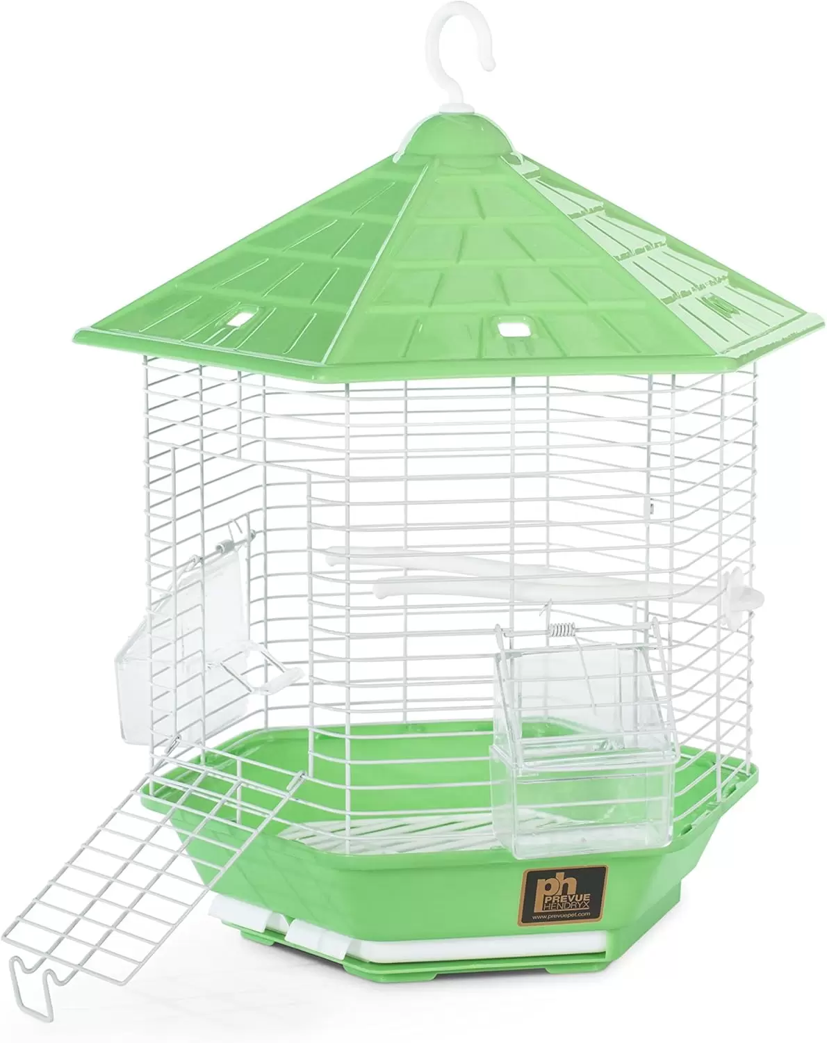 La jaula incluye una percha en forma de rama y dos copas con capucha