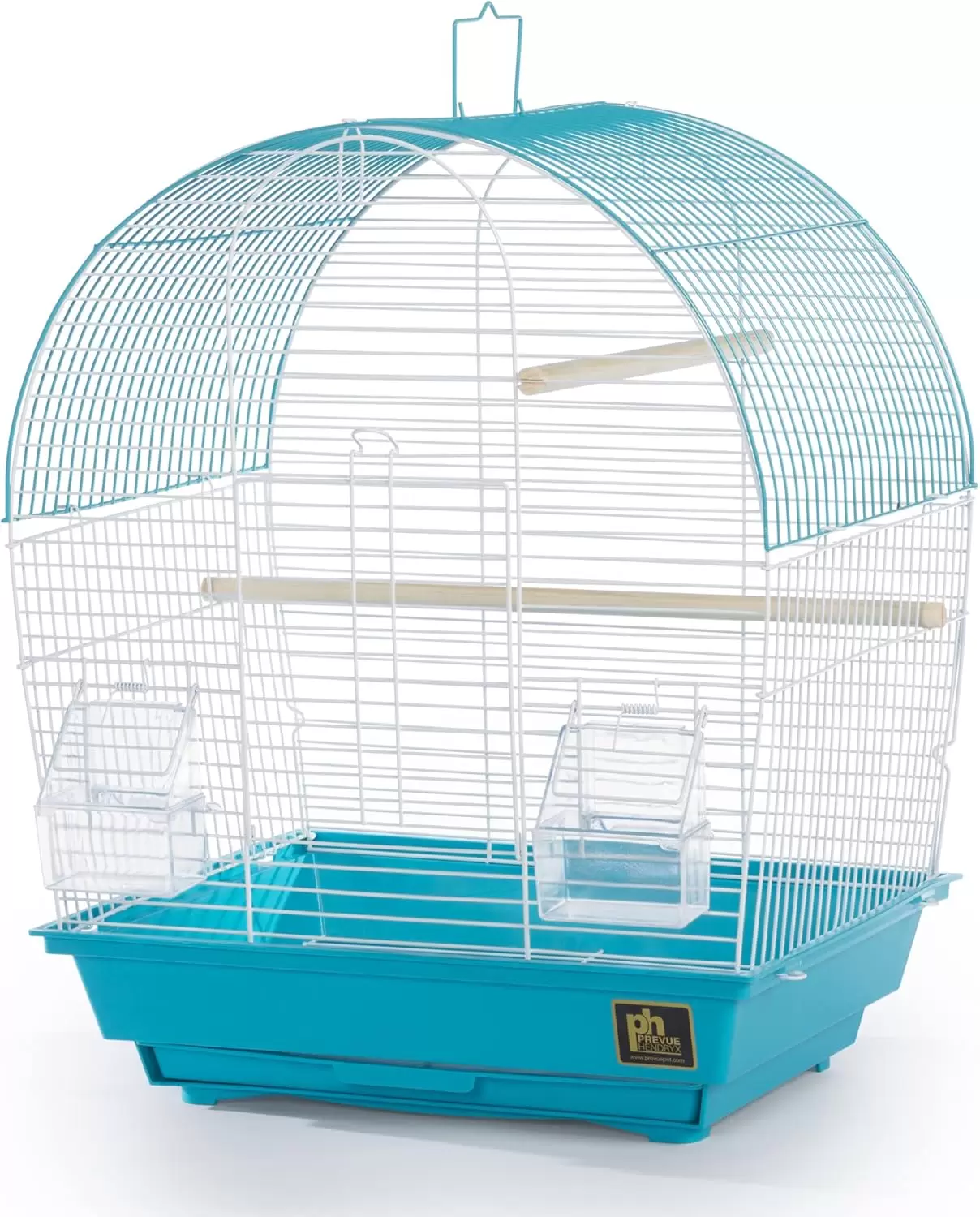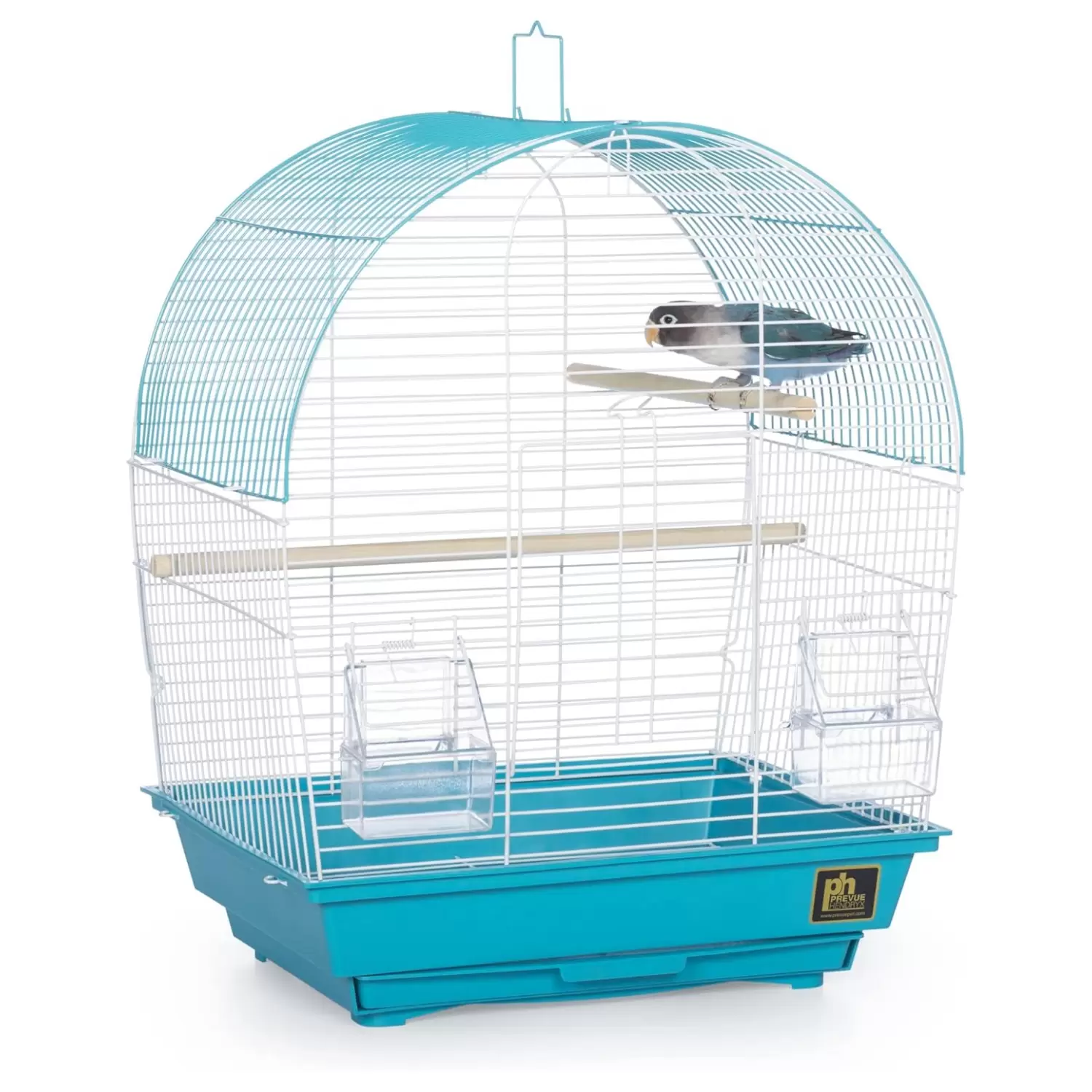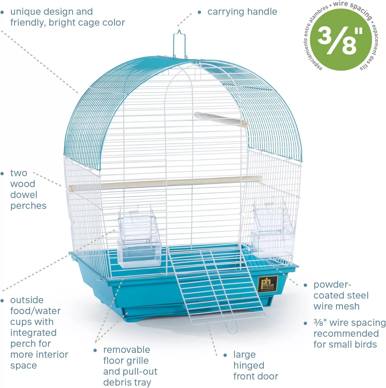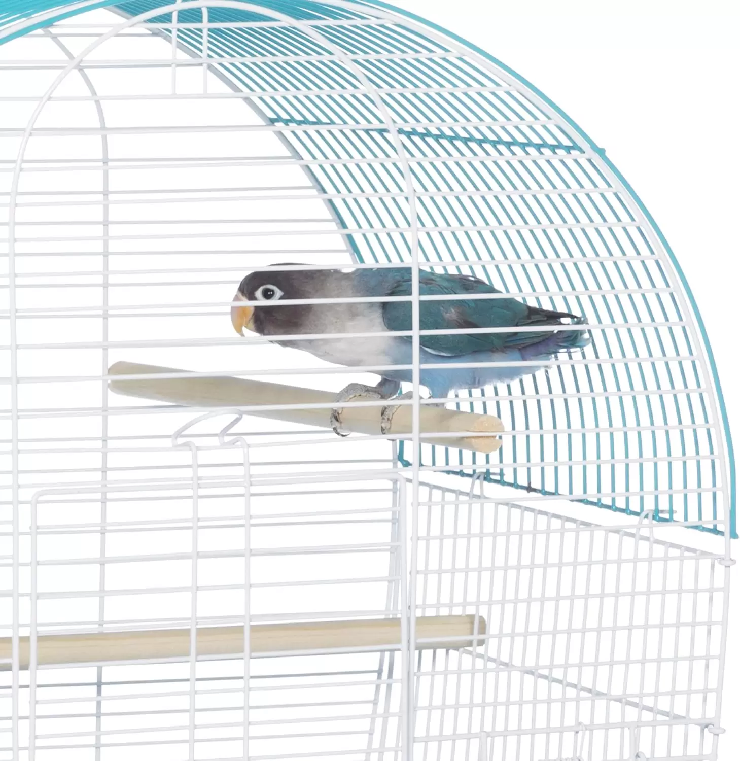 Jaula compacta para periquitos y canarios. Su diseño moderno y color verde azulado se adapta a cualquier hogar. El espacio perfecto para aves pequeñas.