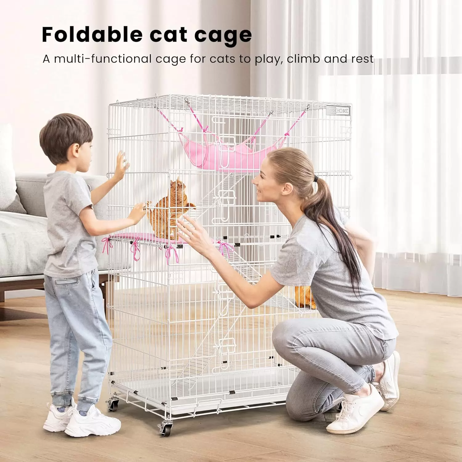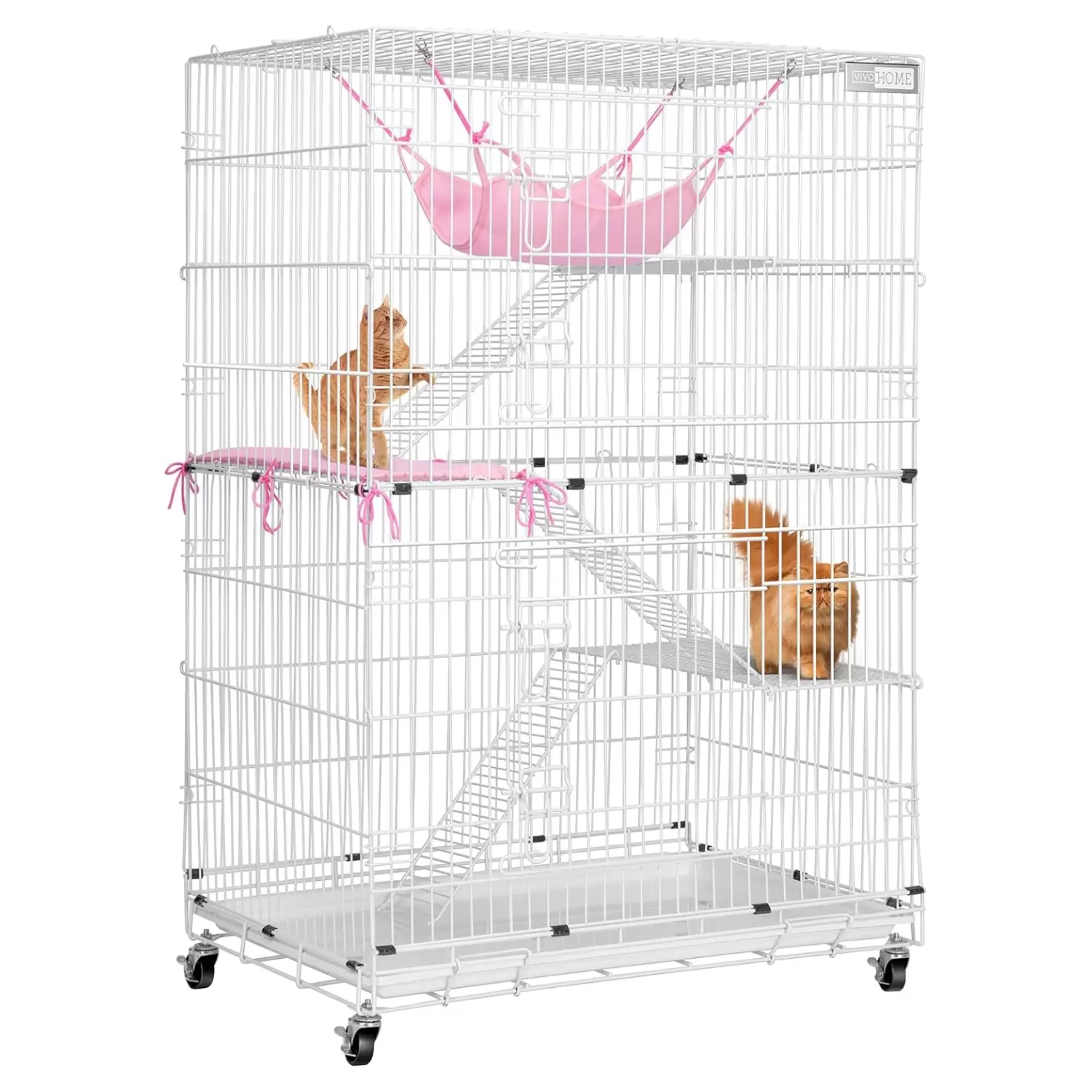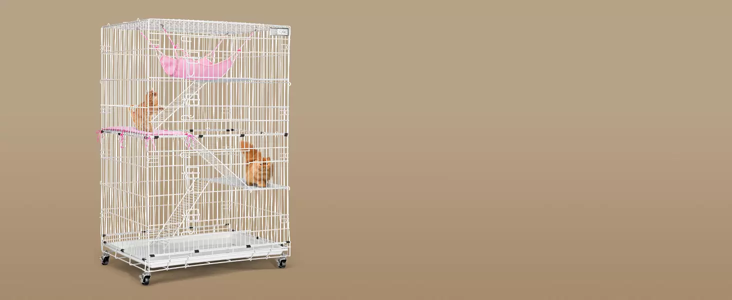 Jaula plegable de 4 niveles para gatos (81x56x124 cm). Móvil con ruedas y 2 puertas de fácil acceso. Incluye hamaca y alfombrilla. Armado y guardado rápido.