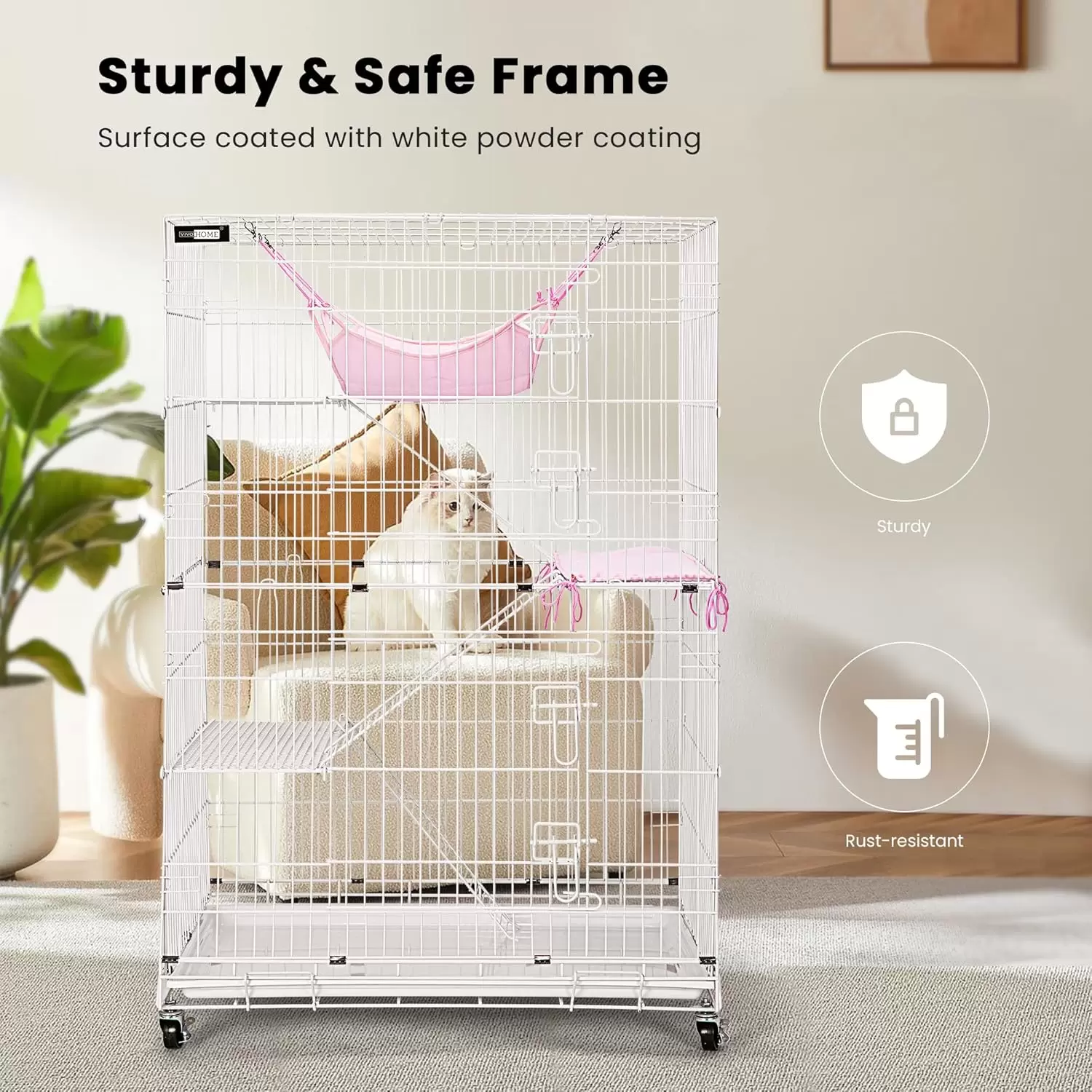Marco resistente y seguro: hecho de acero grueso de alta calidad con bajo contenido de carbono cubierto con un revestimiento de polvo blanco, el marco es muy resistente, bien resistente al óxido y resistente al desgaste, asegurando la estabilidad y durabilidad de la jaula; el intervalo de 1 pulgada (0.945 in) entre cada cable es lo suficientemente pequeño para que el gato trepe o salte sin lesiones y evita que el gatito salga de la jaula, manteniendo la seguridad de tus mascotas