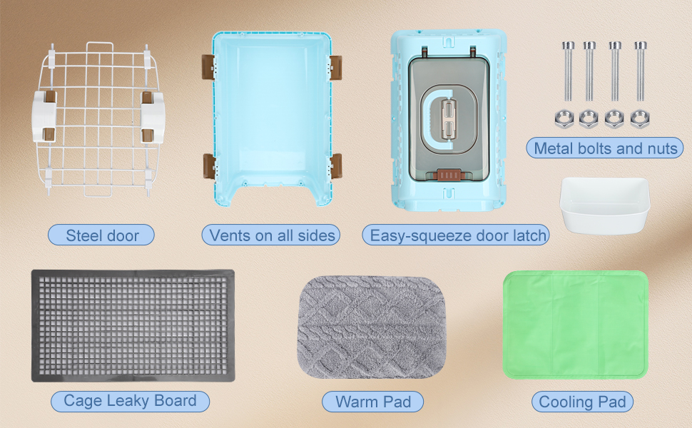 Paquete completo: Se proporciona una cama cómoda y una almohadilla de enfriamiento que encajan perfectamente dentro de la perrera y la hacen más acogedora. El tazón de comida se puede conectar de forma segura a puertas de alambre y proporciona una solución de alimentación conveniente.