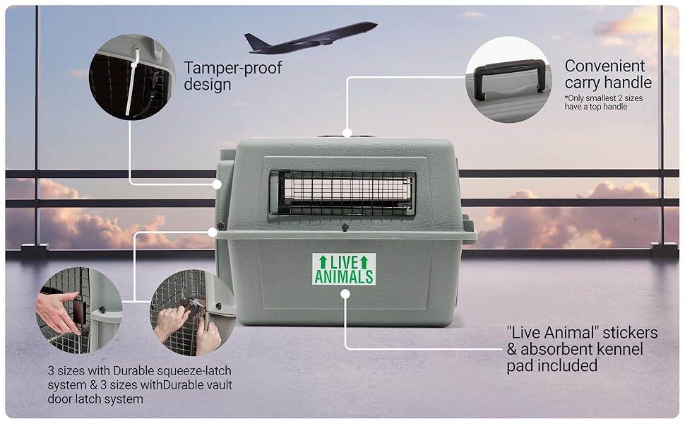 Comodidad de primera clase para mascotas: los Petmate Sky Kenne cumplen con los estándares IATA y la mayoría de las especificaciones de carga de aerolíneas, proporcionando un viaje aéreo seguro para mascotas; incluye ventilación de 360 grados y agujeros para correa de amarre