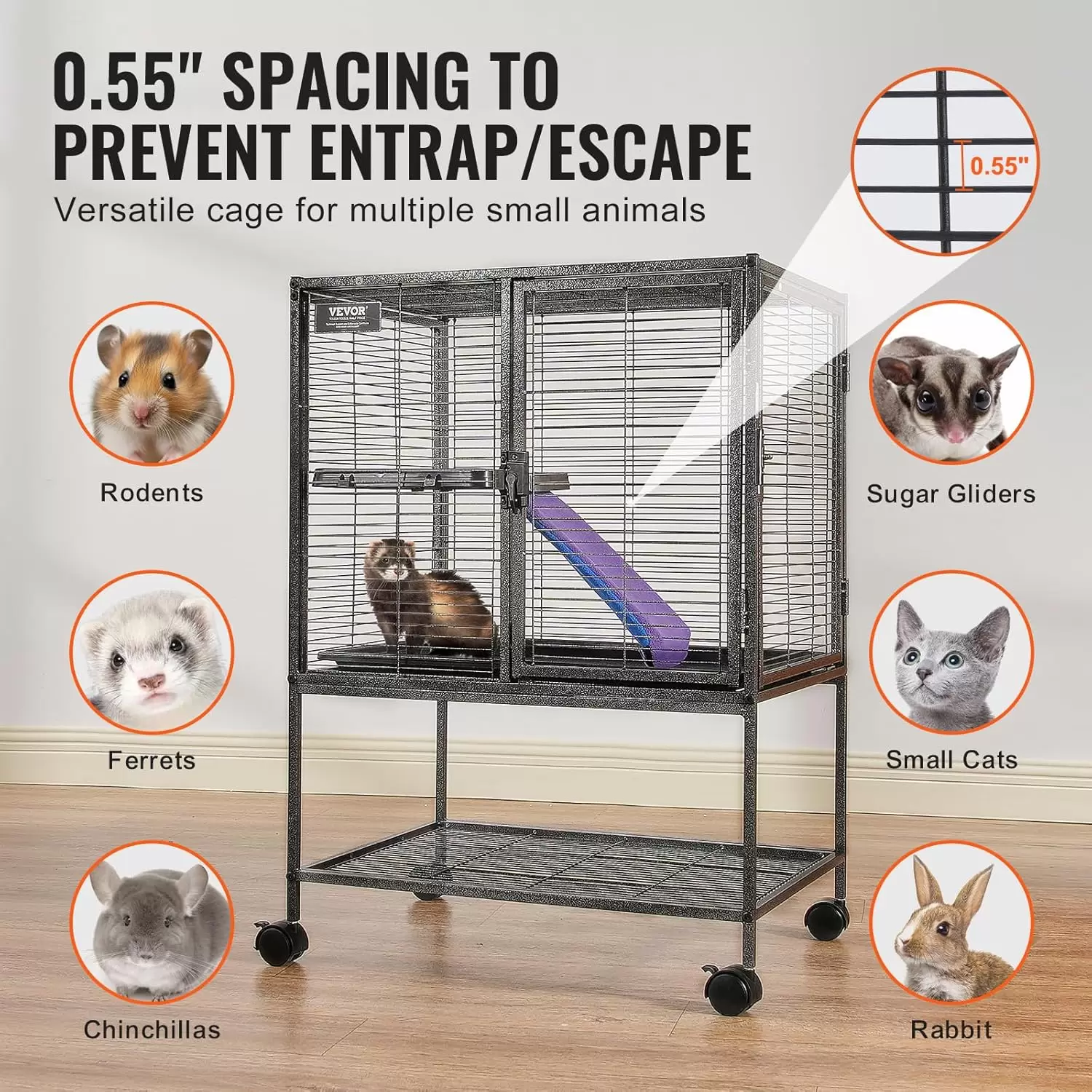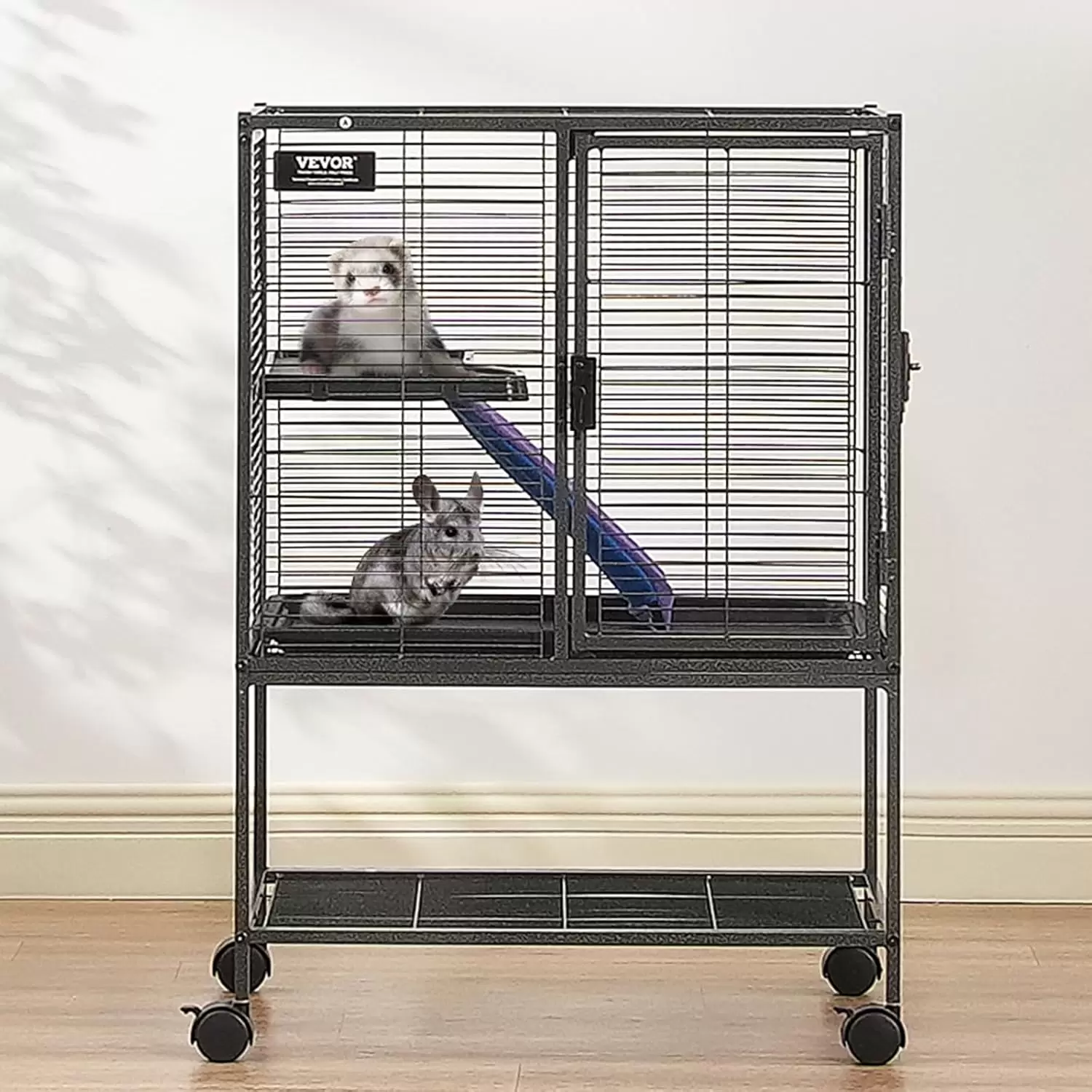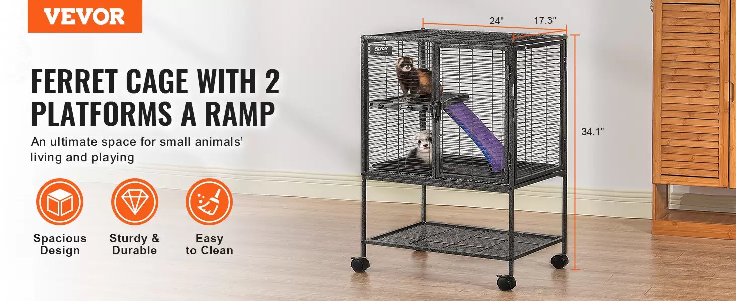 Espaciosa área de estar: esta jaula de hurones proporciona a su mascota un área de actividad espaciosa de 24″x17.3″x34.1″/610x440x865 mm. Nuestra jaula para hurones incluye una rampa antideslizante cubierta de tela para apoyar las necesidades de juego y ejercicio de tu mascota. Obtén la jaula de chinchilla de metal VEVOR para obtener un amplio espacio tanto para la vida como para las actividades