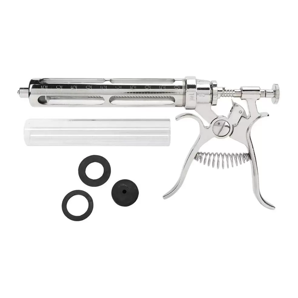 Jeringa continua semiautomática de 50 mL, fabricada en acero inoxidable. Es ideal para la vacunación y dosificación de medicamentos en ganado y mascotas en todo Chile.