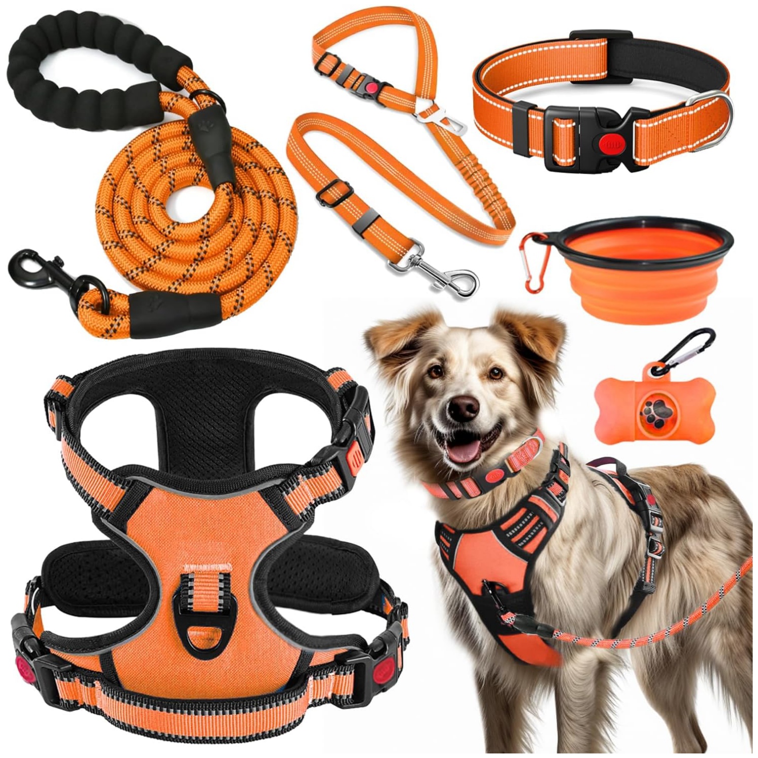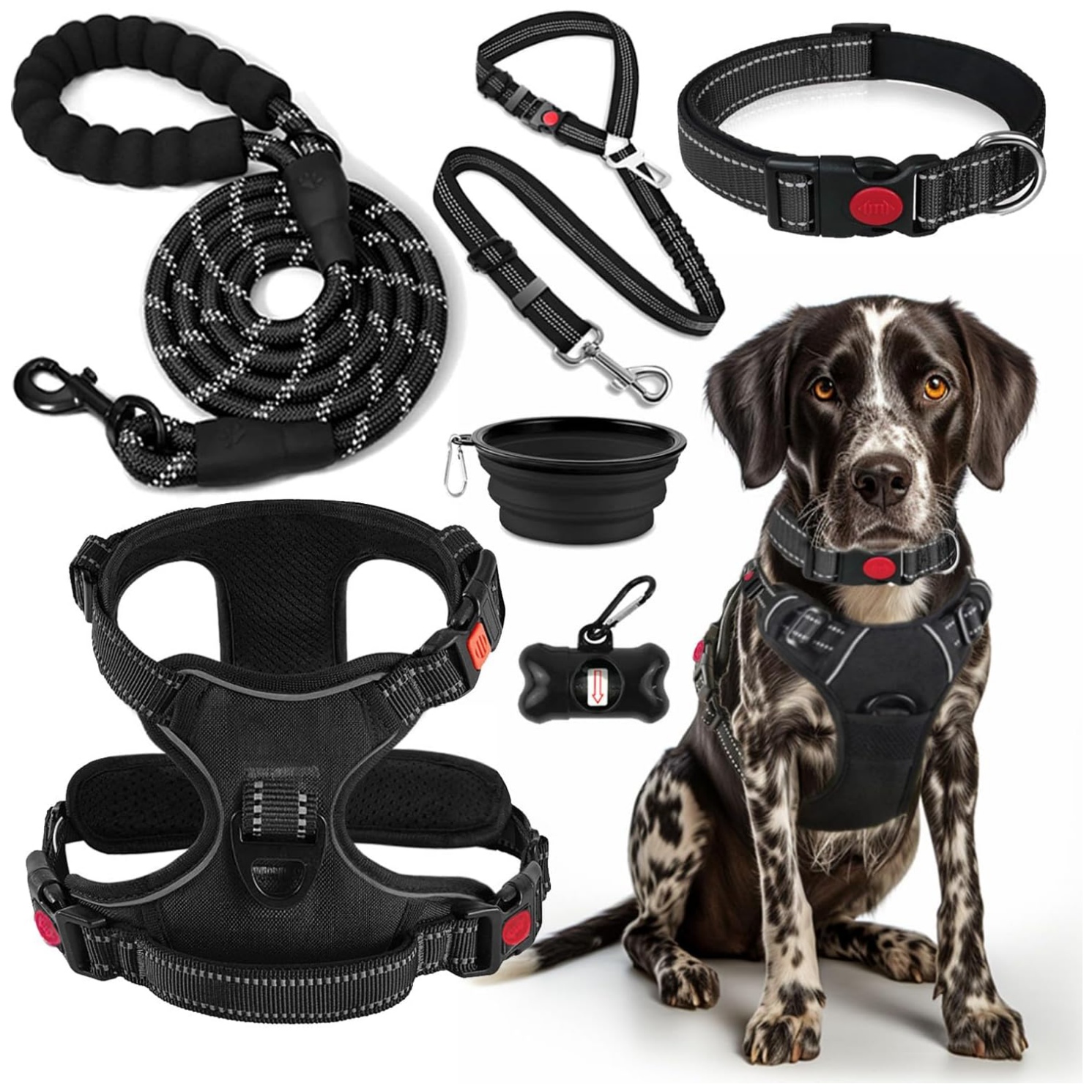 | Componentes incluidos | Arnés para perros, Collar de perro, Arnés para perro., Correa para perro, Cinturón de seguridad para perros, Collar para perro., Correa para perro., Tazón de viaje portátil, bolsas y dispensador de residuos para perros |