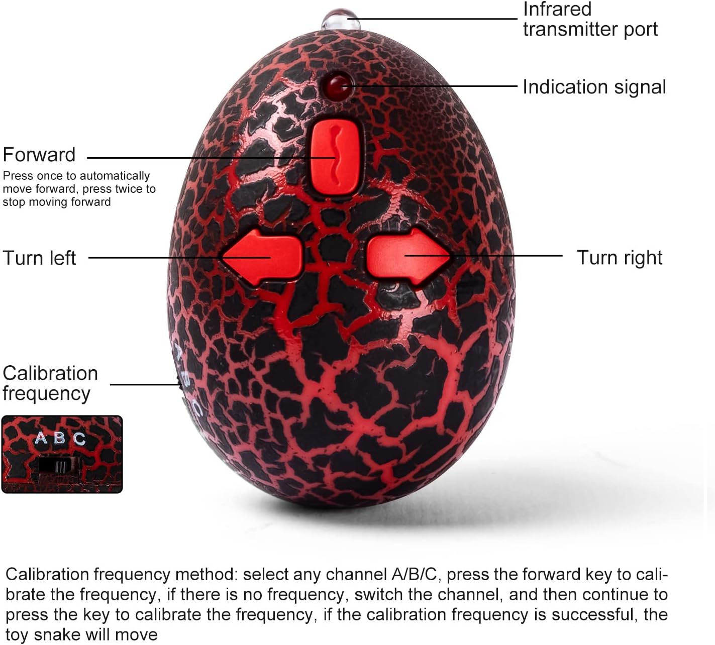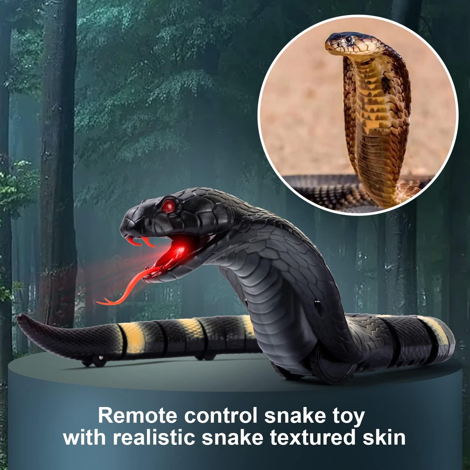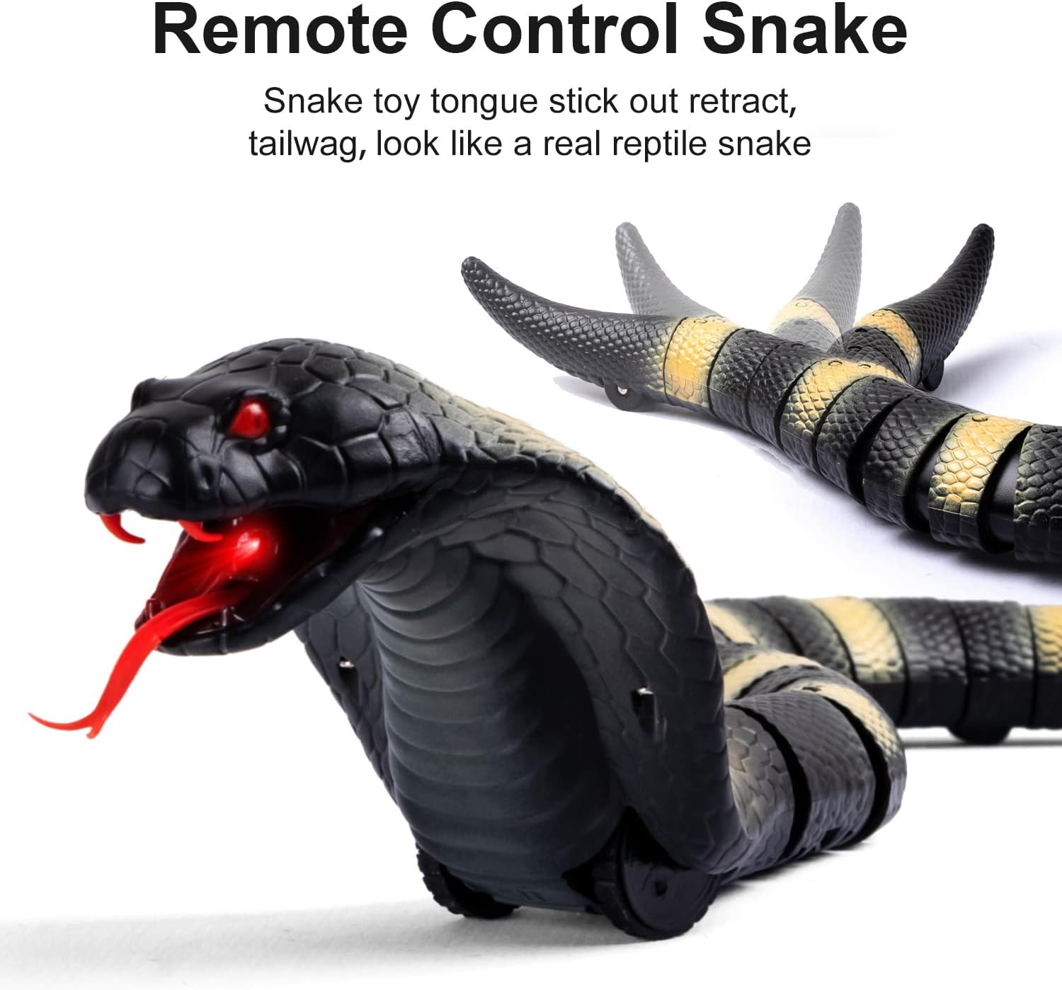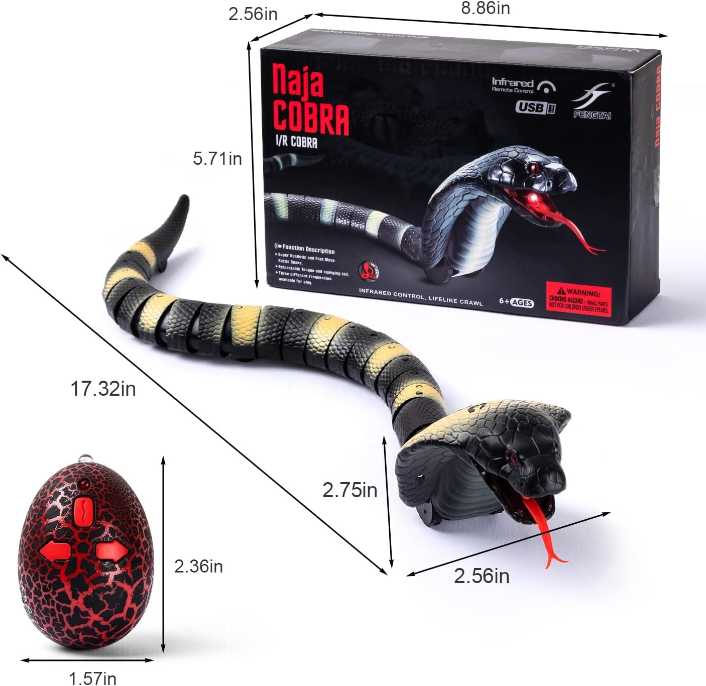 El paquete incluye una serpiente cobra de simulación ultra real de aproximadamente 17 pulgadas de largo con lengüeta retráctil y cola oscilante, 1 huevo de serpiente infrarrojo RC y 1 cable de carga USB