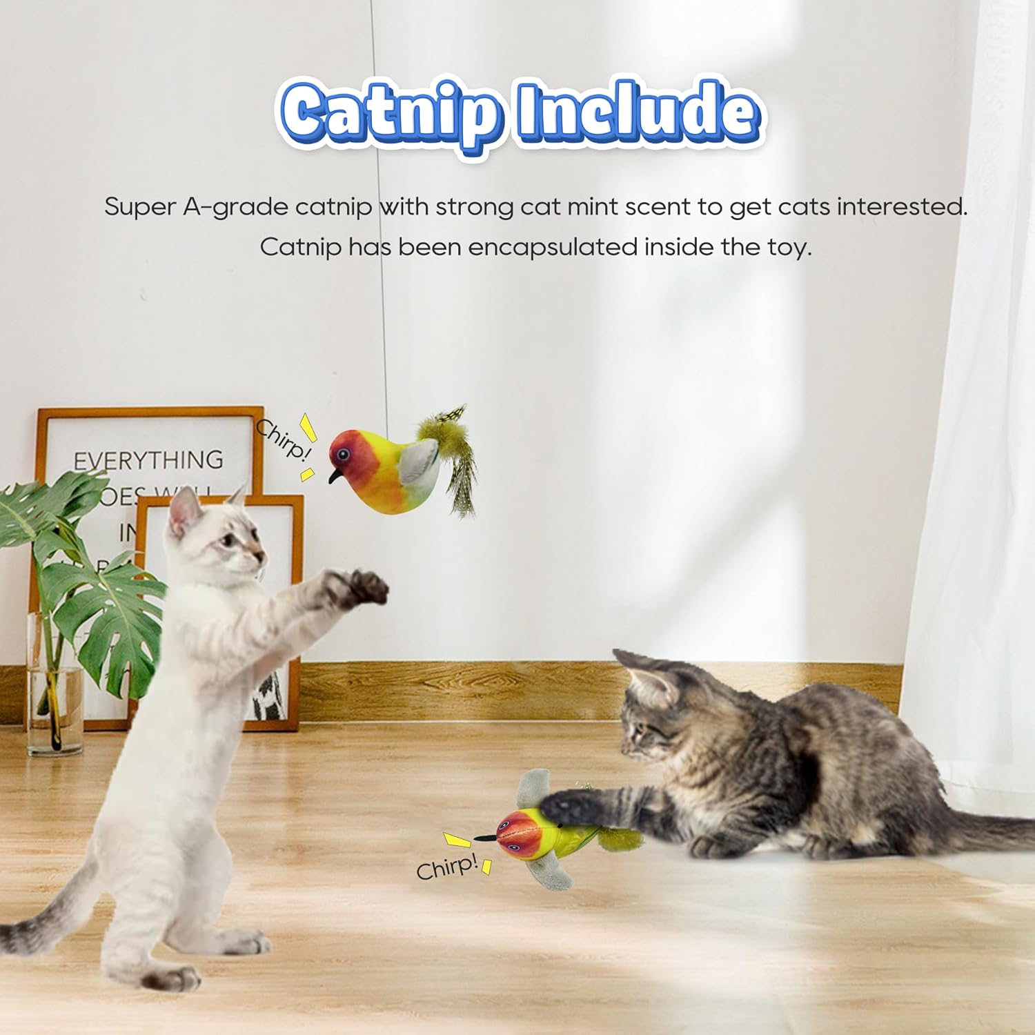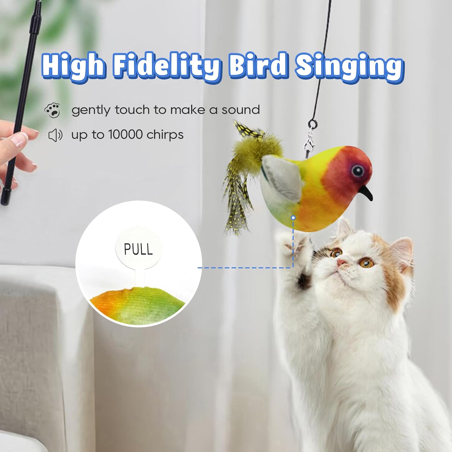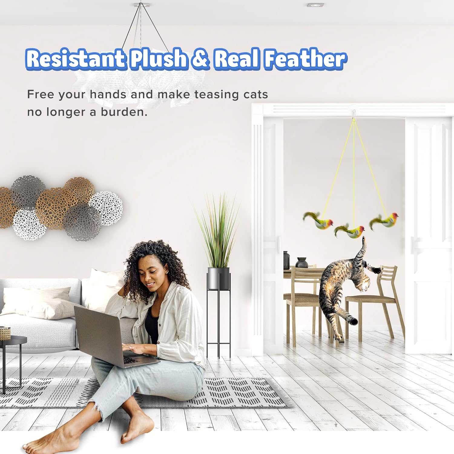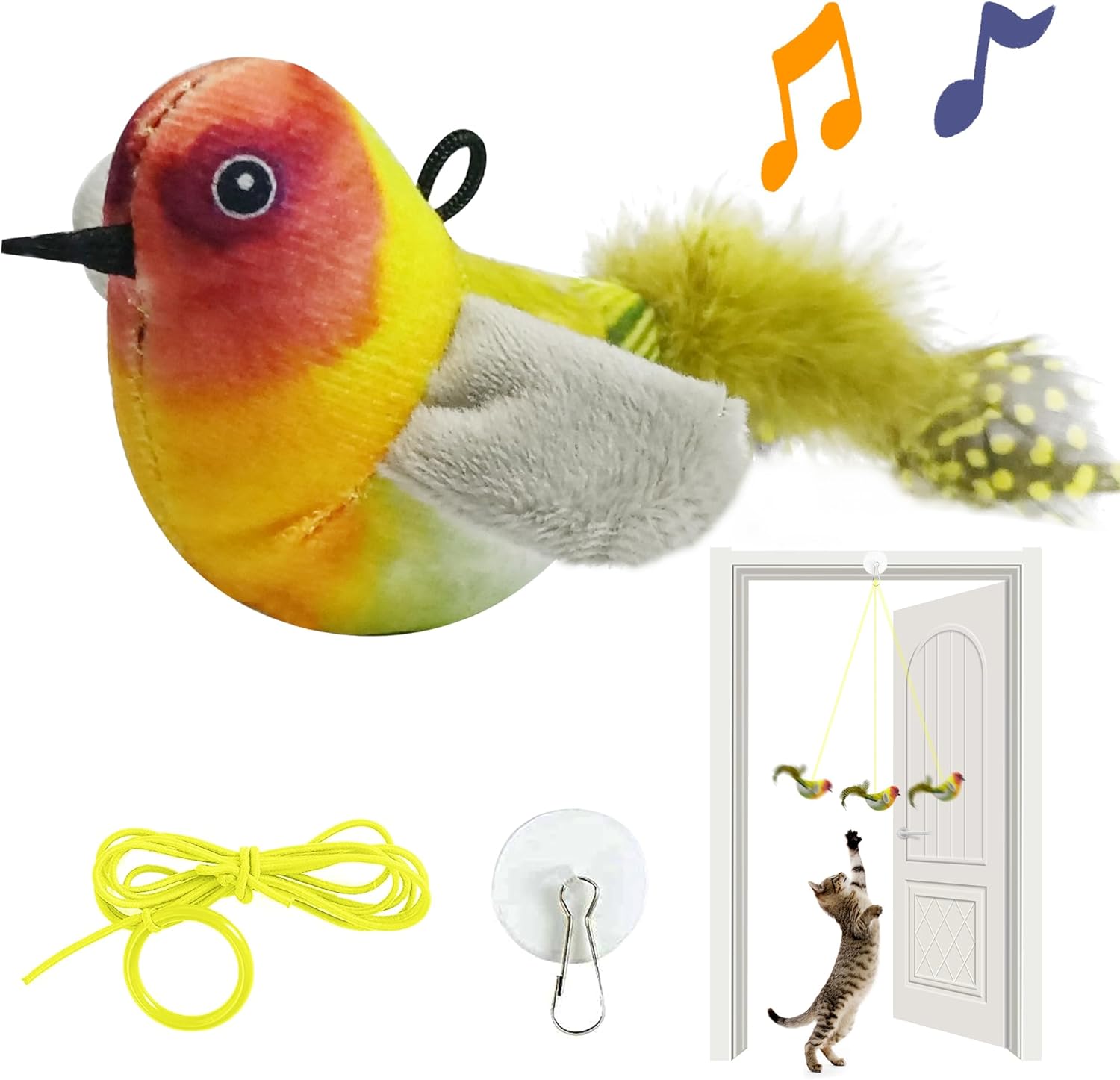 Juguete colgante para gatos: cuelga los juguetes interactivos para gatos de interior en marcos de puertas u otras áreas lisas a través de un gancho adhesivo. Cuando tu gato lo toque, volará hacia adelante y hacia atrás, y el mecanismo integrado emite canciones realistas de pájaros, haciendo que tu gato se vuelva loco