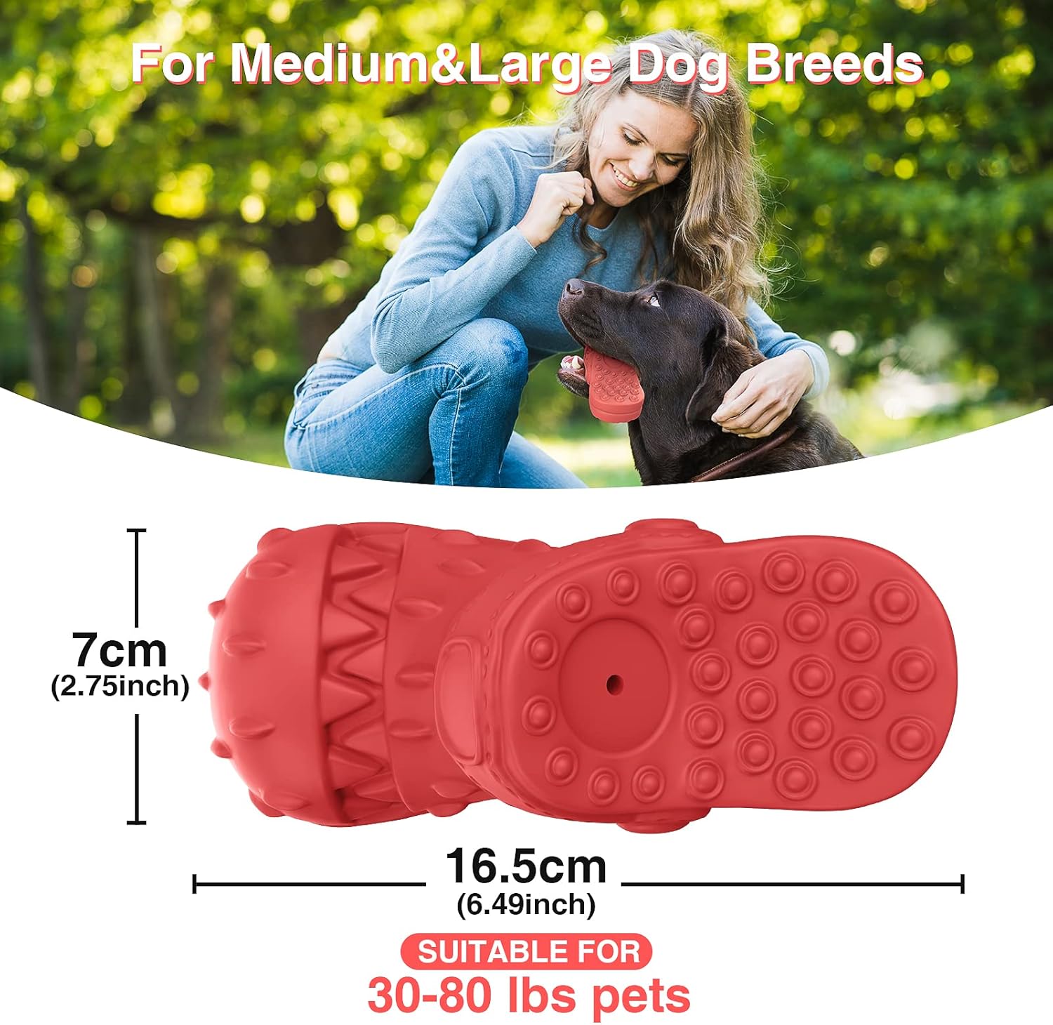 Seguro de masticar: Tamaño 6.7 x 3 x 2.6 pulgadas. Nuestro juguete masticable para perros está hecho de goma natural no tóxica e inofensiva que garantiza el entretenimiento y la seguridad de tu cachorro. Este juguete interactivo para perros ha sido probado innumerables veces por perros grandes agresivos.