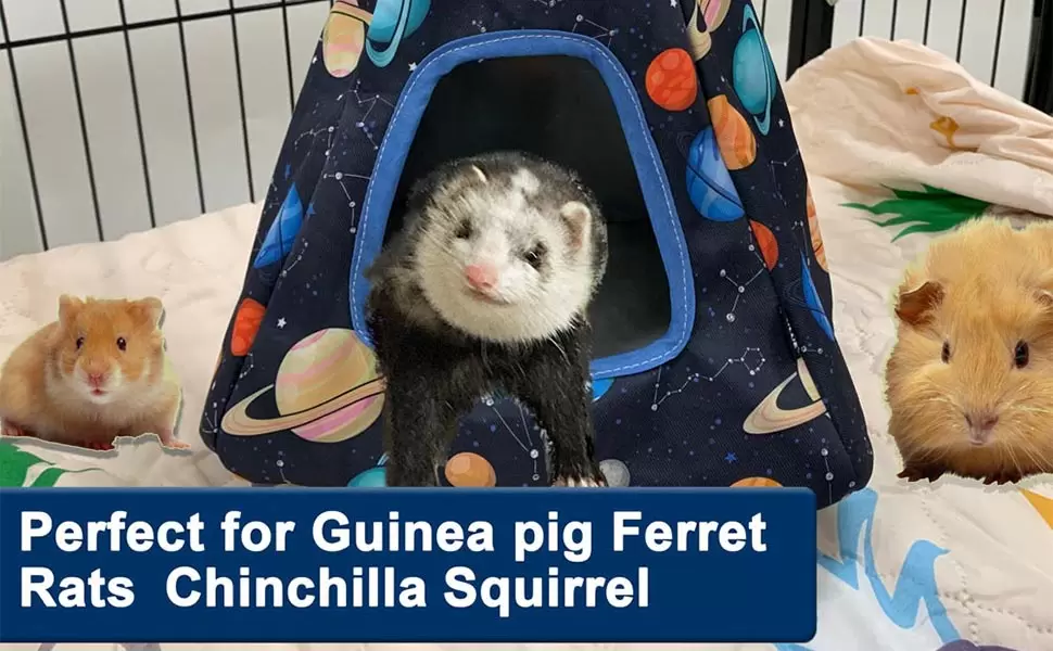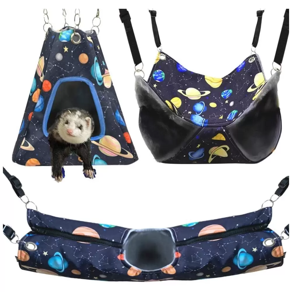 Kit 3-en-1 esencial para hurones y ratas. Incluye túnel, litera y tienda de descanso. Construcción de doble capa, resistente a mordeduras y lavable a máquina para higiene total.