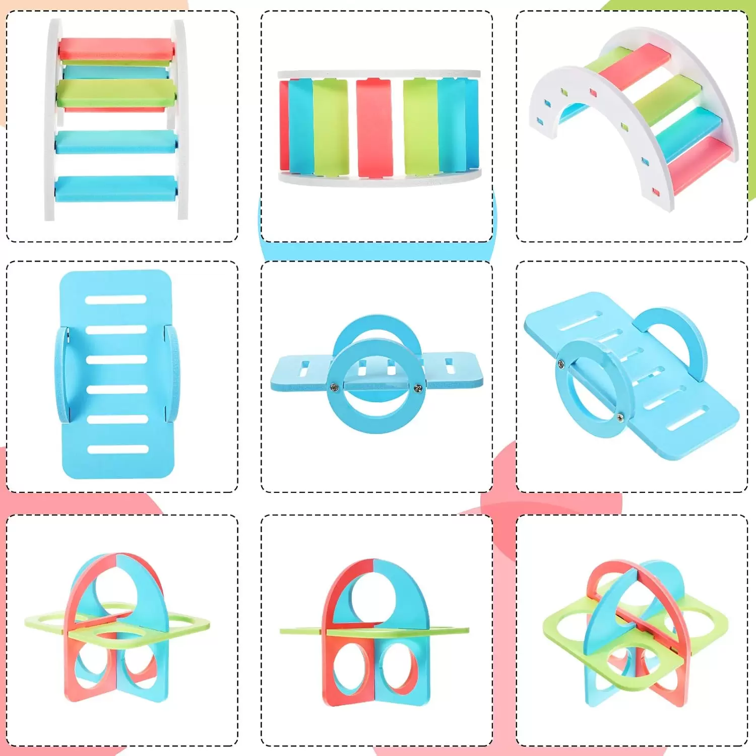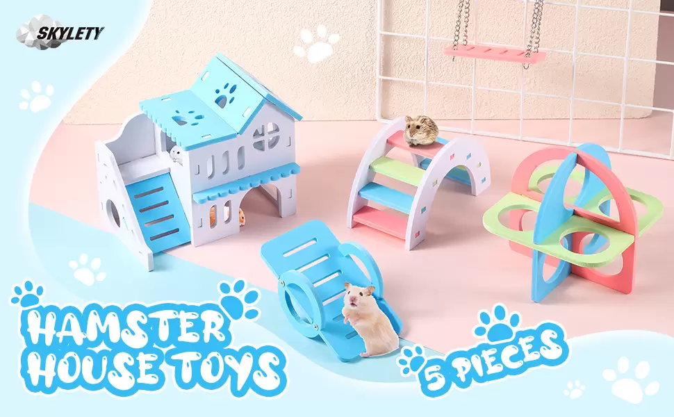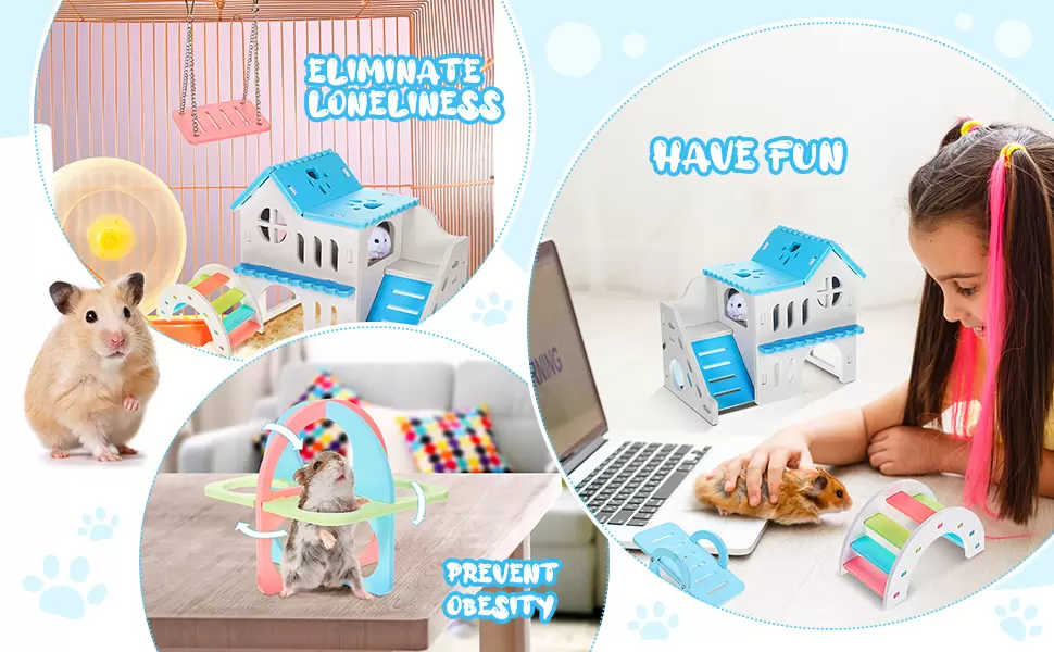Recibirás: viene con 5 piezas de juguete para hámster, incluyendo 1 casa de hámster de doble capa, 1 balancín, 1 puente arcoíris, 1 columpio y 1 juguete de círculo de ejercicio para hámster; este juego de juguetes para hámster es adecuado para accesorios de jaula; diferentes juguetes harán que los hámsters se diviertan