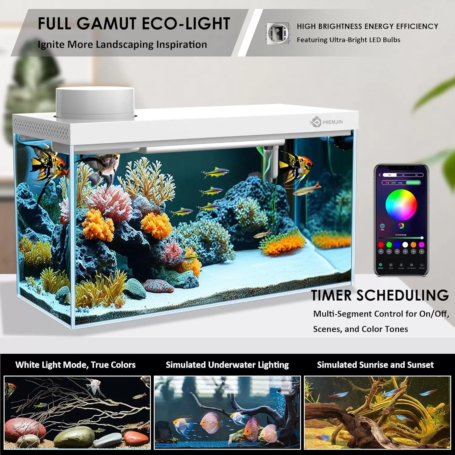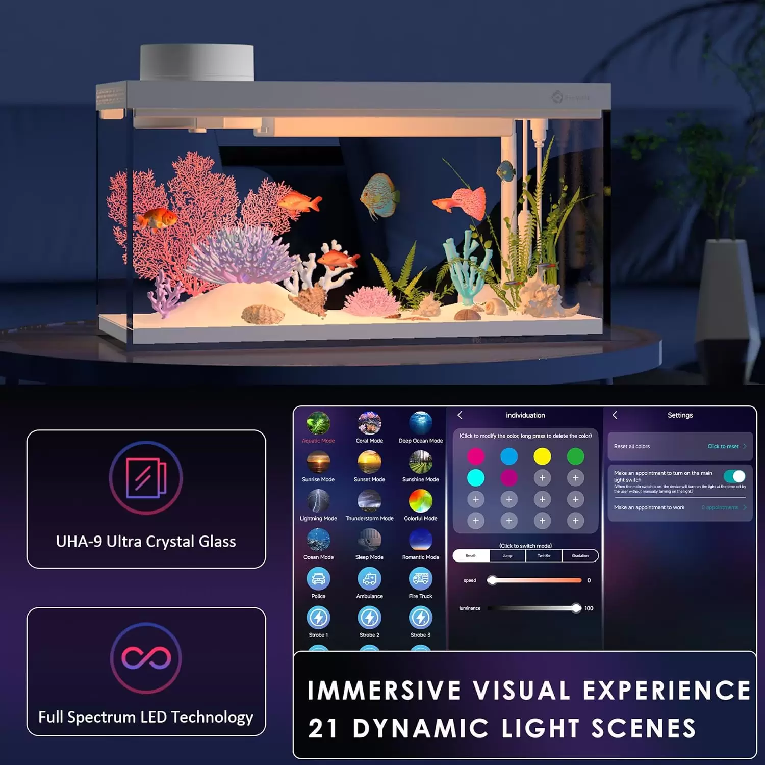 Experiencia visual mejorada: nuestro acuario de peces con el fascinante sistema de iluminación LED de gama completa, puede diseñar su propio color a través de la aplicación. Y hay 21 escenas para elegir. El vidrio Ultra HD con clasificación UHA con transmisión de luz del 91.3% mejora el color, mientras que los LED de alto brillo promueven la salud de los peces y el crecimiento de las plantas. Dale vida a la belleza del acuario ante tus ojos con colores personalizados o sincroniza con el ciclo día/noche, mucho más allá de las luces básicas de acuario para peceras.