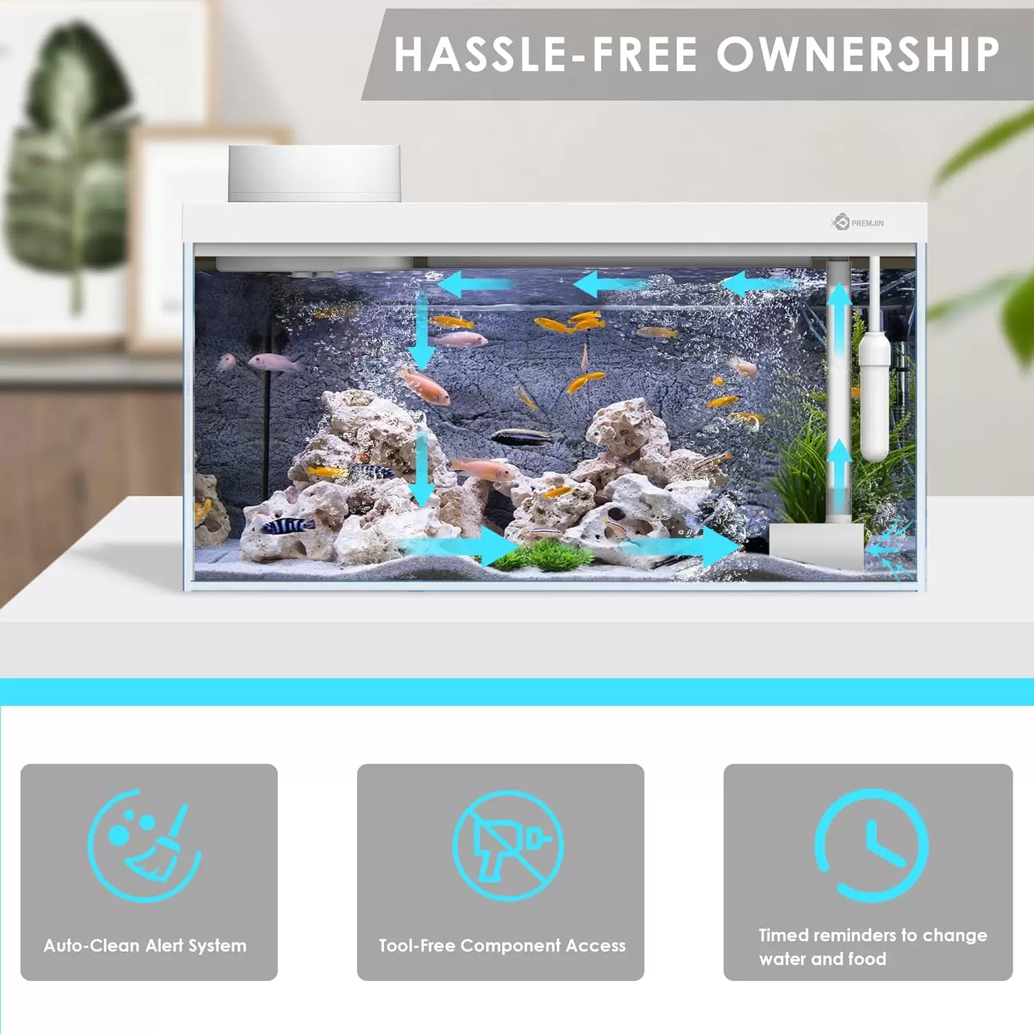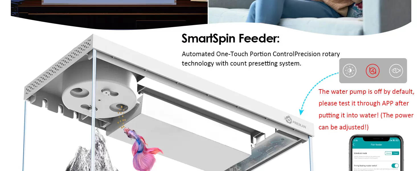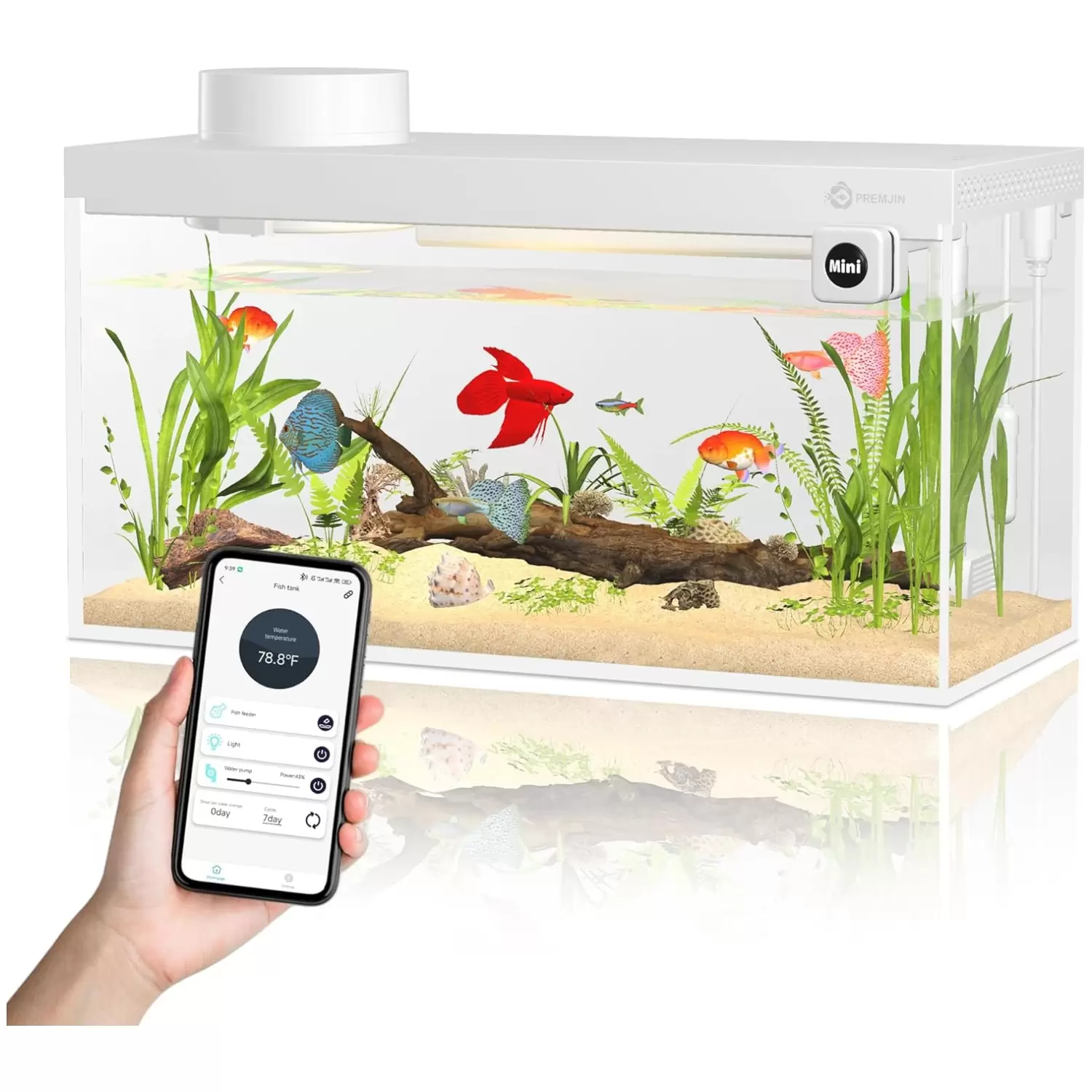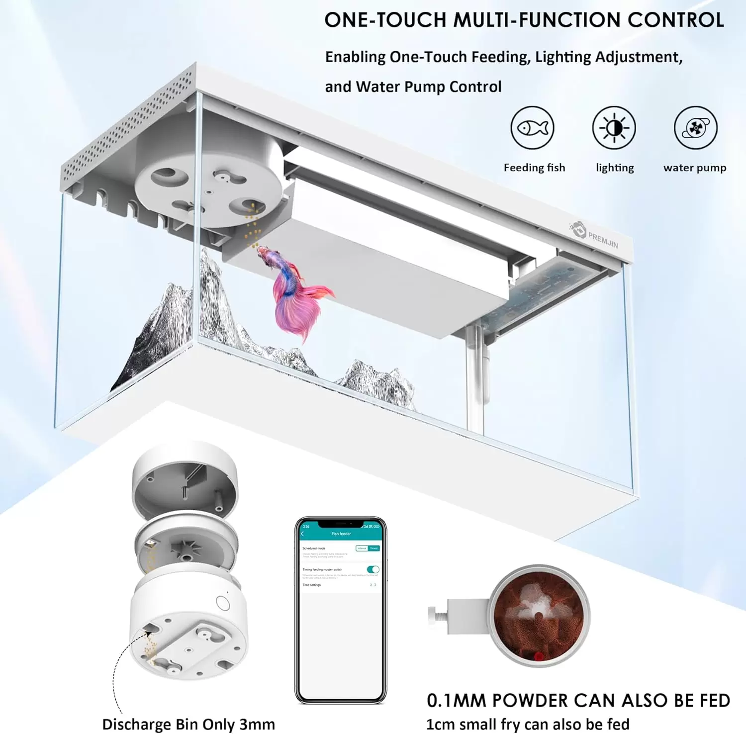 Alimentador automático inteligente: pecera PREMJIN equipada con un alimentador automático que te permite programar horarios precisos de comidas a través de una aplicación, perfecto para vacaciones o estilos de vida ocupados. Capacidad para hasta 3 meses de comida y el diseño a prueba de humedad evita que los alimentos se aglomeren. Imprescindible para los propietarios de tanques que desean cuidar sus peces betta sin preocupaciones.
