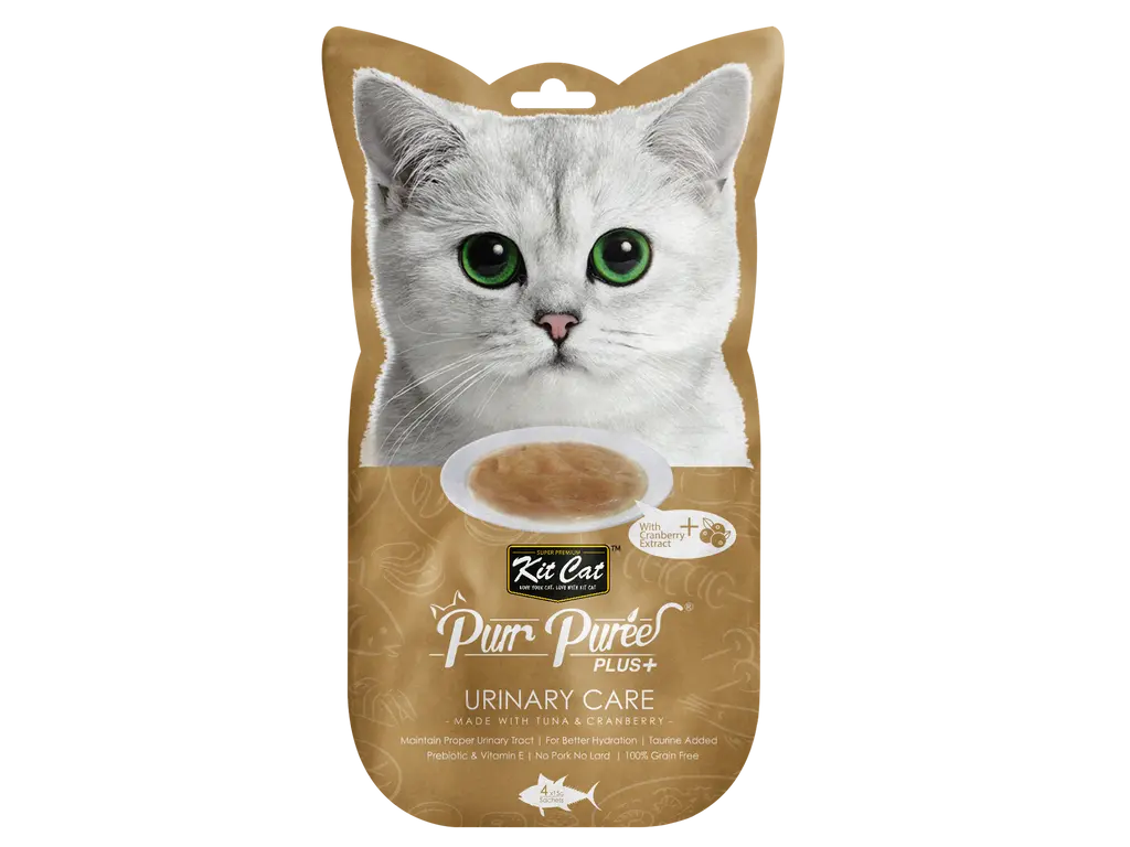 KIT CAT PURR PUREE PLUS URINARY CARE es un snack para gatos cremoso y funcional ideal para premiar a tu gato y complementar su alimentación.