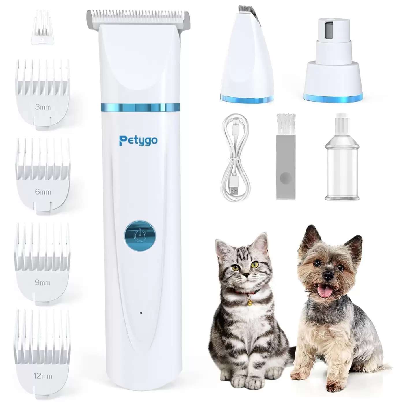 Kit de cortadora de mascotas todo en uno: el kit de recortadora para mascotas PETYGO viene con 2 cabezales de corte intercambiables y 1 cabezal de molinillo de uñas, un cable de carga USB y un cepillo pequeño. Ideal para perros, gatos y otras mascotas peludas. Perfecto para el aseo de cuerpo completo y el corte de uñas.