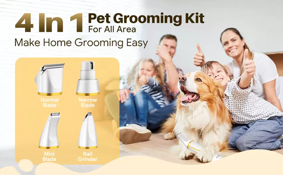 Juego de aseo para mascotas pequeñas 4 en 1: recortadores de perros únicos para perros pequeños con 3 cabezales de corte y 1 cabezal de pulido de uñas reemplazable, pueden recortar de forma precisa y eficiente el pelo del cuerpo, cara, orejas, uñas, patas y glúteos de perros, gatos y otros animales. Satisface todas las necesidades de corte de cuerpo completo y pulido de uñas. Ahorra el problema y el gasto de comprar múltiples herramientas. Peina fácilmente a tu gato en casa