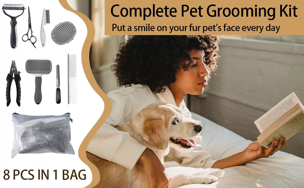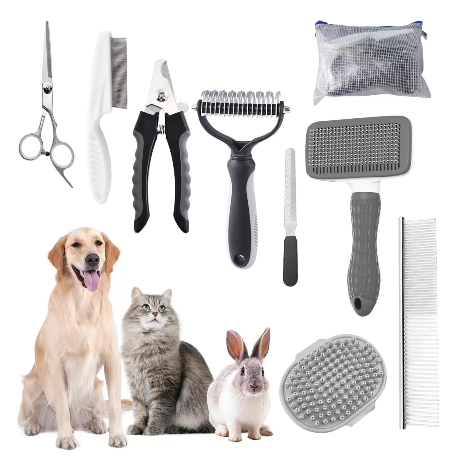 Kit de aseo profesional 9 en 1 para perros y gatos. Herramientas completas para eliminar el pelo, desenredar, cortar uñas y masajear, dejando a tu mascota feliz.