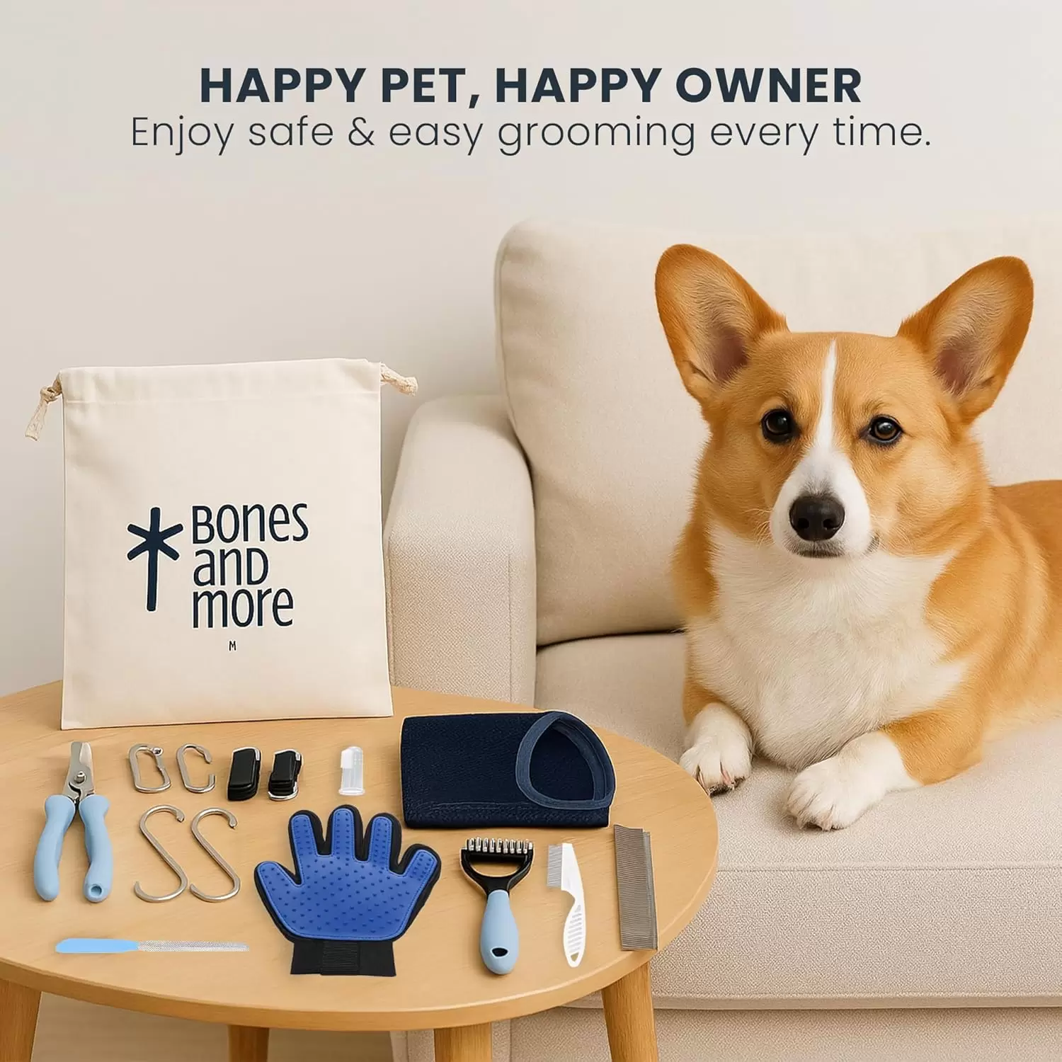 Cortador de uñas resistente y lima para recortar con precisión, peine de metal y rastrillo de desenmascaramiento para desenredar, y guante de aseo para eliminar el cabello suelto y promover la unión.