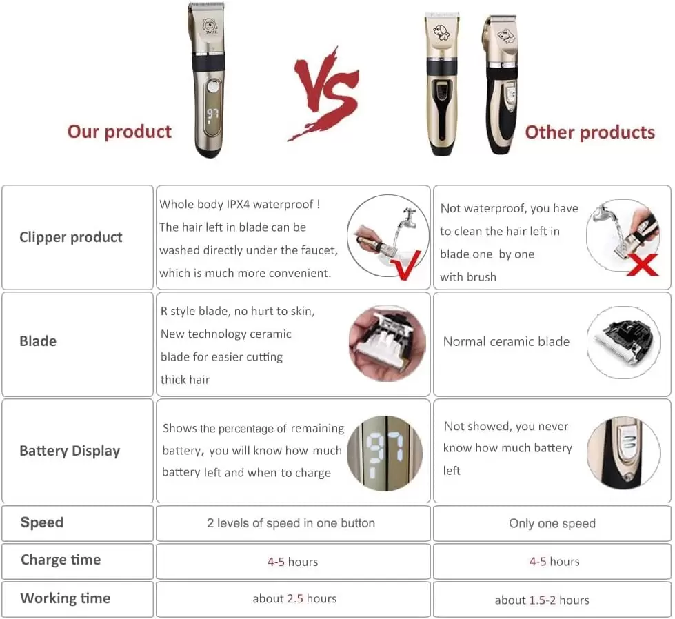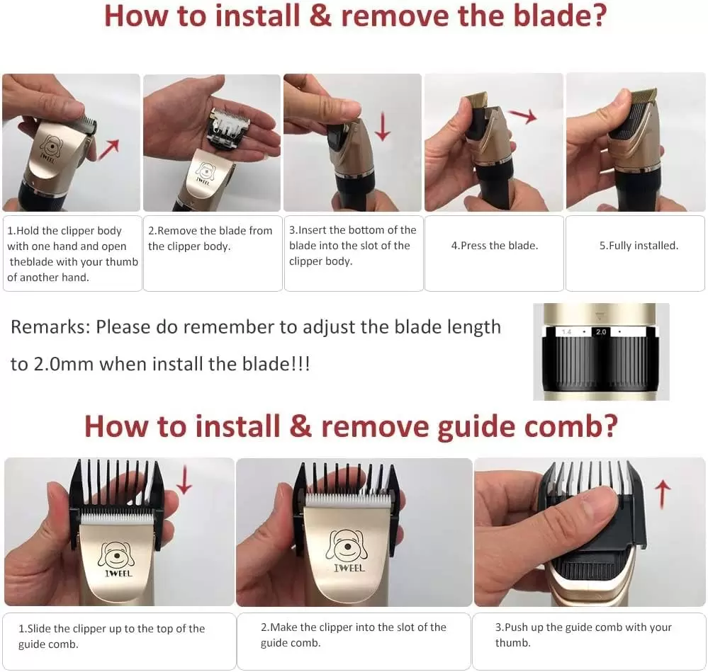 6 peines guía que satisfacen todas tus necesidades: proporcionamos 0.118 pulgadas, 0.157 pulgadas, 0.315 pulgadas. Peines izquierdo y derecho de 0.472 in. El pelo de tu mascota se recortará perfectamente en la misma longitud con los peines guía. Puede recortar a su mascota de forma segura incluso si nunca lo ha hecho antes sin temor a cortar el pelo.