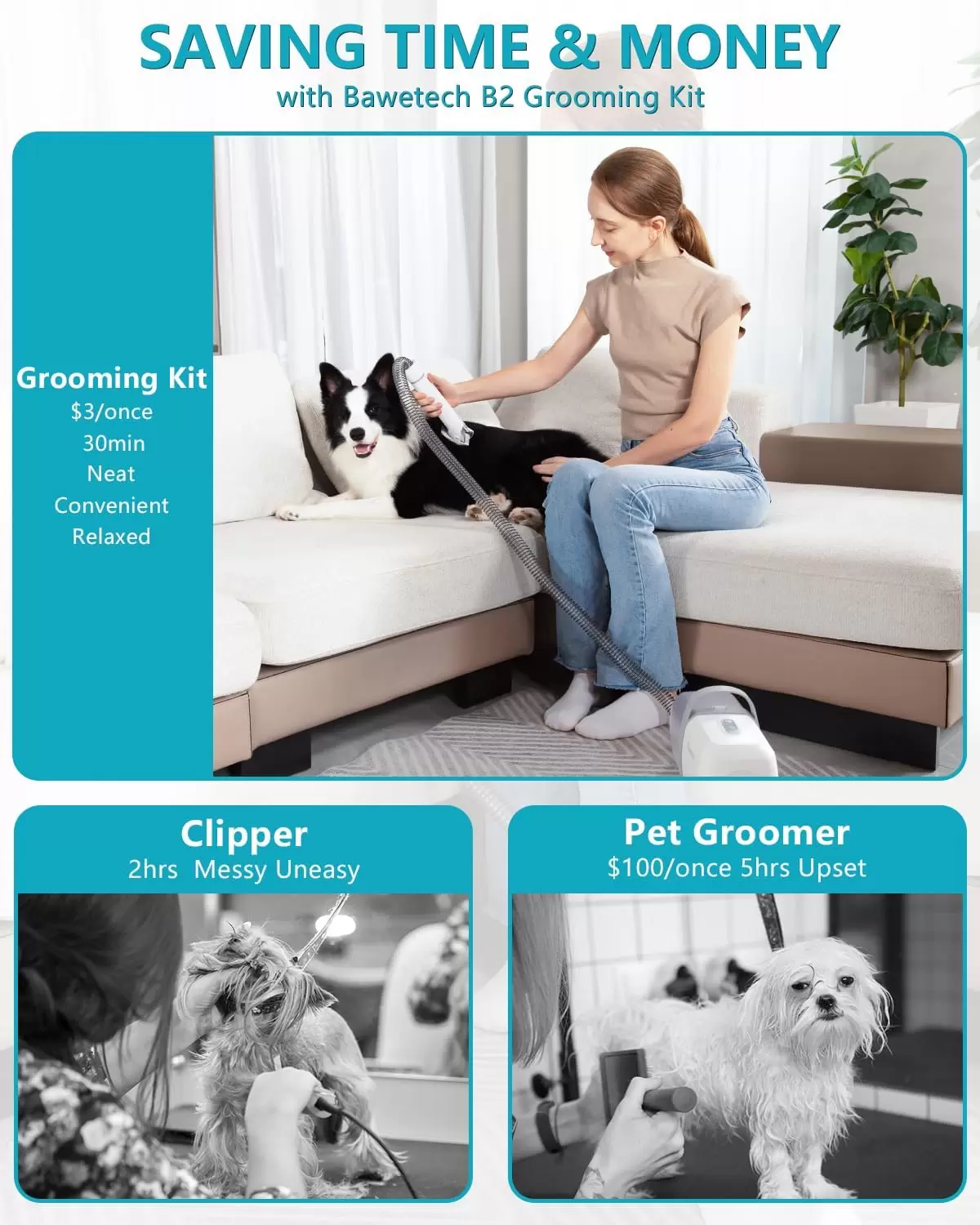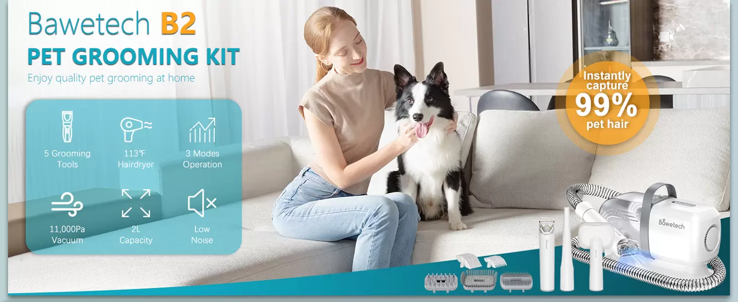 Nueva aspiradora de aseo para perros 2025: di adiós al cabello disperso para siempre y haz que tu hogar se mantenga limpio y cómodo mientras te acicalas. La aspiradora de aseo para perros Bawetech B2 te permite cepillar y recortar el pelo de tu perro y recogerlo en la caja de polvo de una vez, evitando que se caiga en otro lugar. Cuenta con una impresionante potencia de succión de hasta 11000Pa, lo que le permite atrapar eficientemente el 99% del cabello en el recipiente.