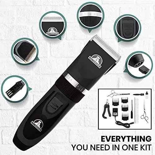 Kit de aseo profesional recargable e inalámbrico. Su diseño silencioso y sus herramientas de calidad son ideales para un corte de pelo completo y sin estrés en tu mascota.