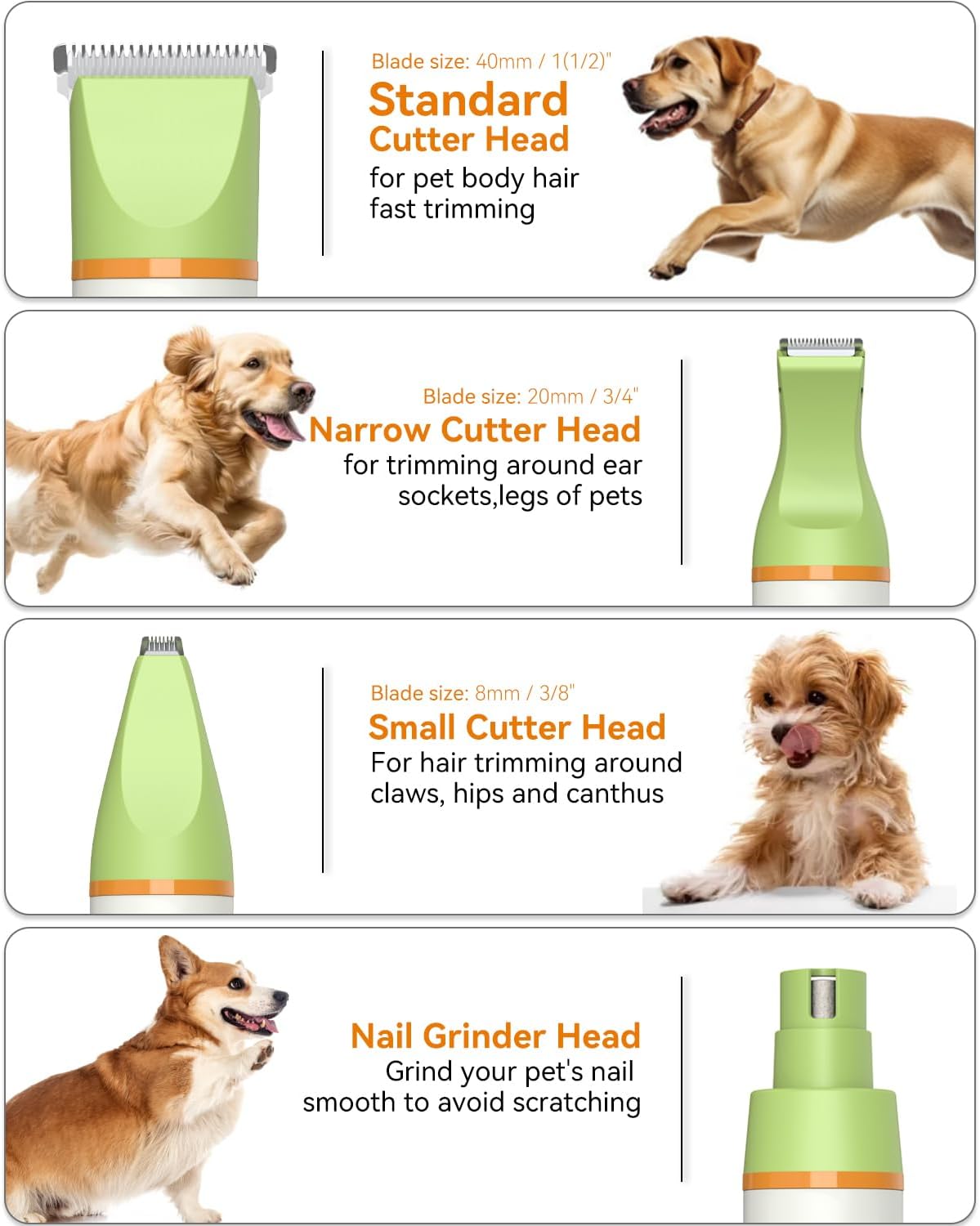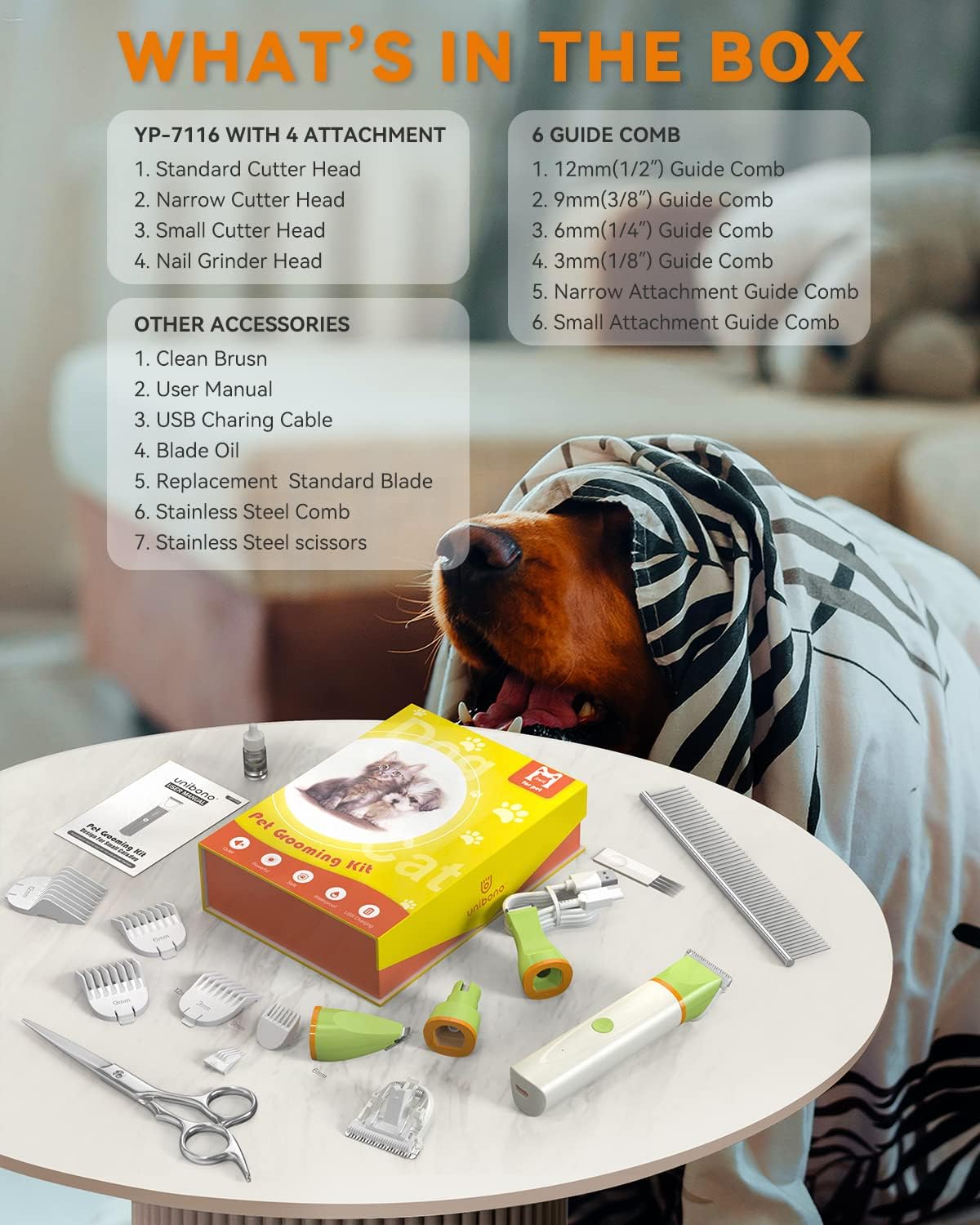 El mismo dinero para obtener cuatro: el kit de aseo para perros y gatos 7116 adopta un diseño de cabezal de corte desmontable con 4 accesorios de cabezal de corte reemplazables: cabezal de corte estándar, cabezal de corte estrecho, cabezal de corte pequeño y cabezal de molinillo de uñas, que se puede reemplazar rápidamente con un solo tirón y un empuje para satisfacer las necesidades de corte corporal de perro y gato. ¡Ahorra tu dinero ahora!