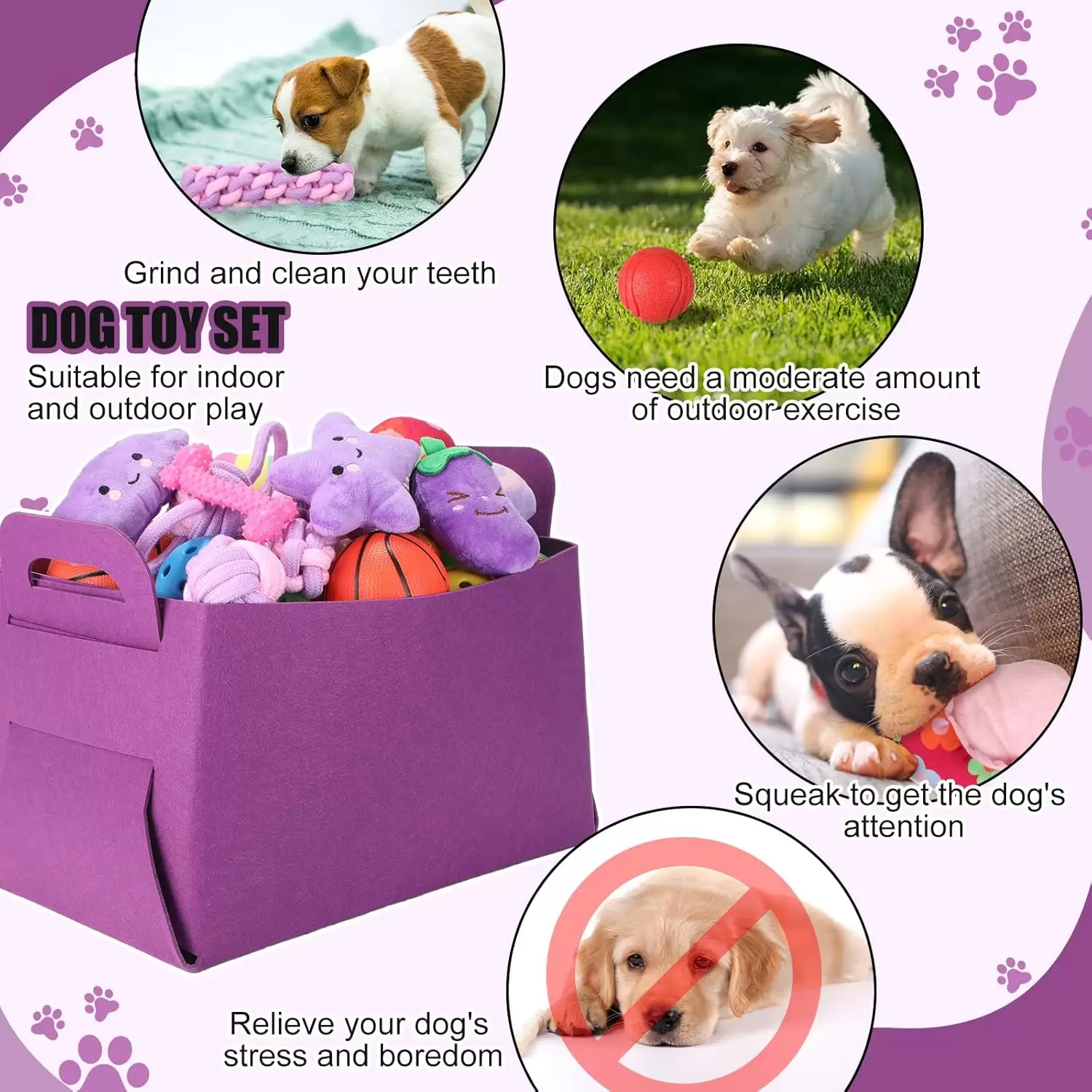 Bonito y esencial kit de iniciación para cachorros: nuestro kit de inicio esencial para cachorros con temática púrpura está bellamente diseñado para satisfacer necesidades funcionales y estética pintoresca; el paquete completo incluye 1 cesta de almacenamiento de fieltro, 12 juguetes para masticar, 1 bolsa de entrenamiento, 1 correa para perro, 1 cepillo de dedos TPR con estuche, 2 cuencos de acero inoxidable, 1 toalla de algodón suave, 1 manta morada, 1 almohadilla para mascotas y más, ideal para perras