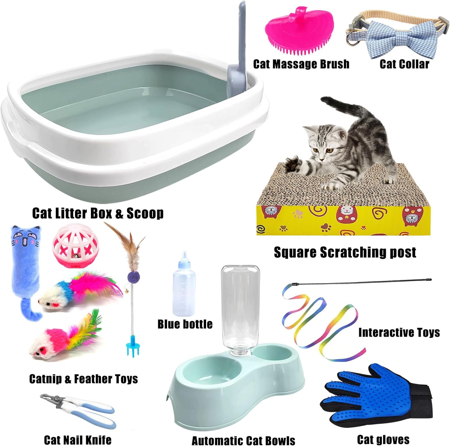 Kit de iniciación para gatos de 15 piezas: el kit de iniciación de caja de arena incluye 1 caja de arena para gatos, 1 cuchara de arena, 1 cuencos automáticos para gatos (agua y alimentos), 1 tabla de rascar para gatos, 1 juguete de tabla de rascar para gatos, 1 peine para gatos, 1 botella de leche para gatos, 1 lima de uñas para gatos, 1 guante de aseo para gatos, 1 collar para gatos, 4 juguetes para gatos. Este kit de inicio para gatos es perfecto para nuevos padres.