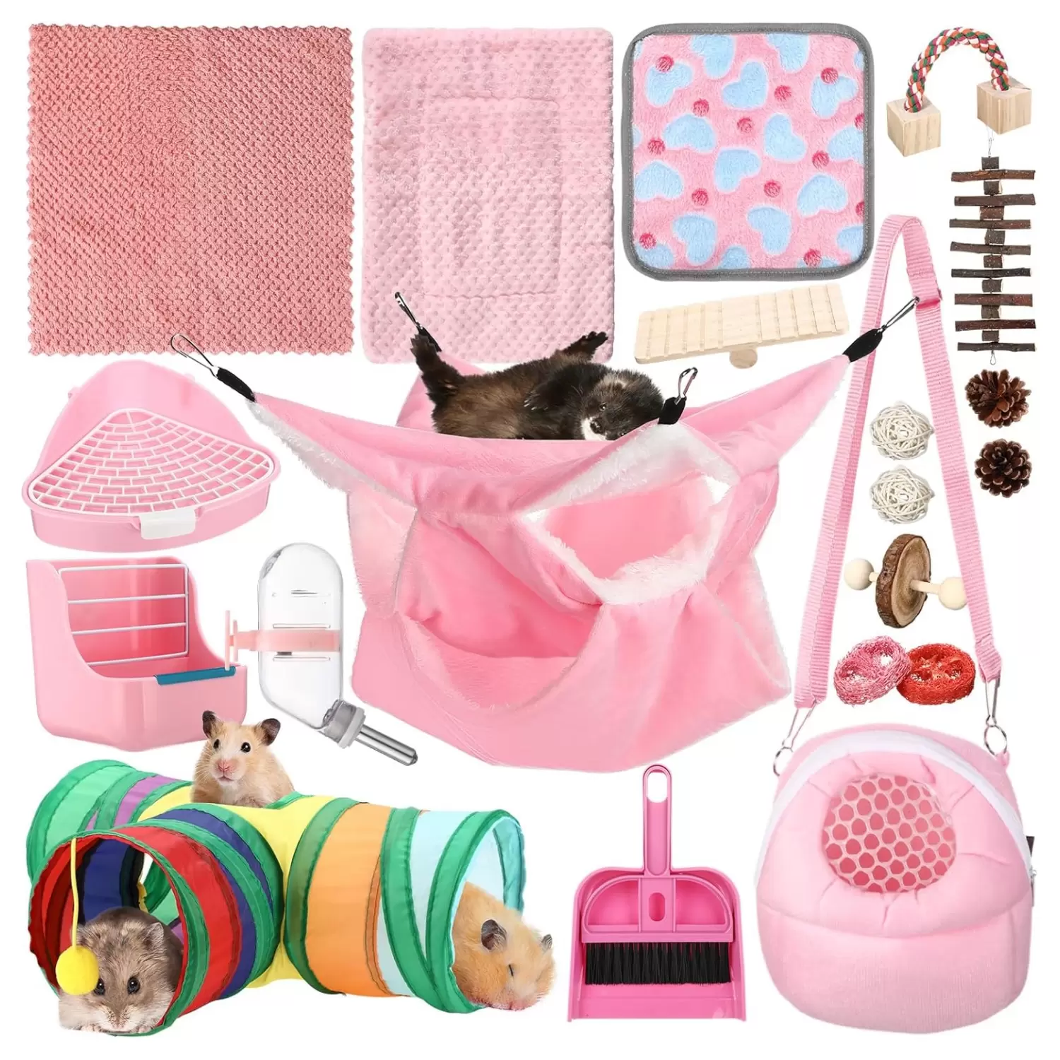 Juego de hámster: recibirás un juego de hámster de 20 piezas que incluye una manta, alfombra, toalla, inodoro pequeño, cuenco de alimentación, juego de limpieza, regada, hamaca pequeña para mascotas, bolsa pequeña para salir, canal de juego y un juego de 10 piezas de juguetes pequeños para mascotas, que es muy adecuado para hámsters, hámsters y otras mascotas pequeñas