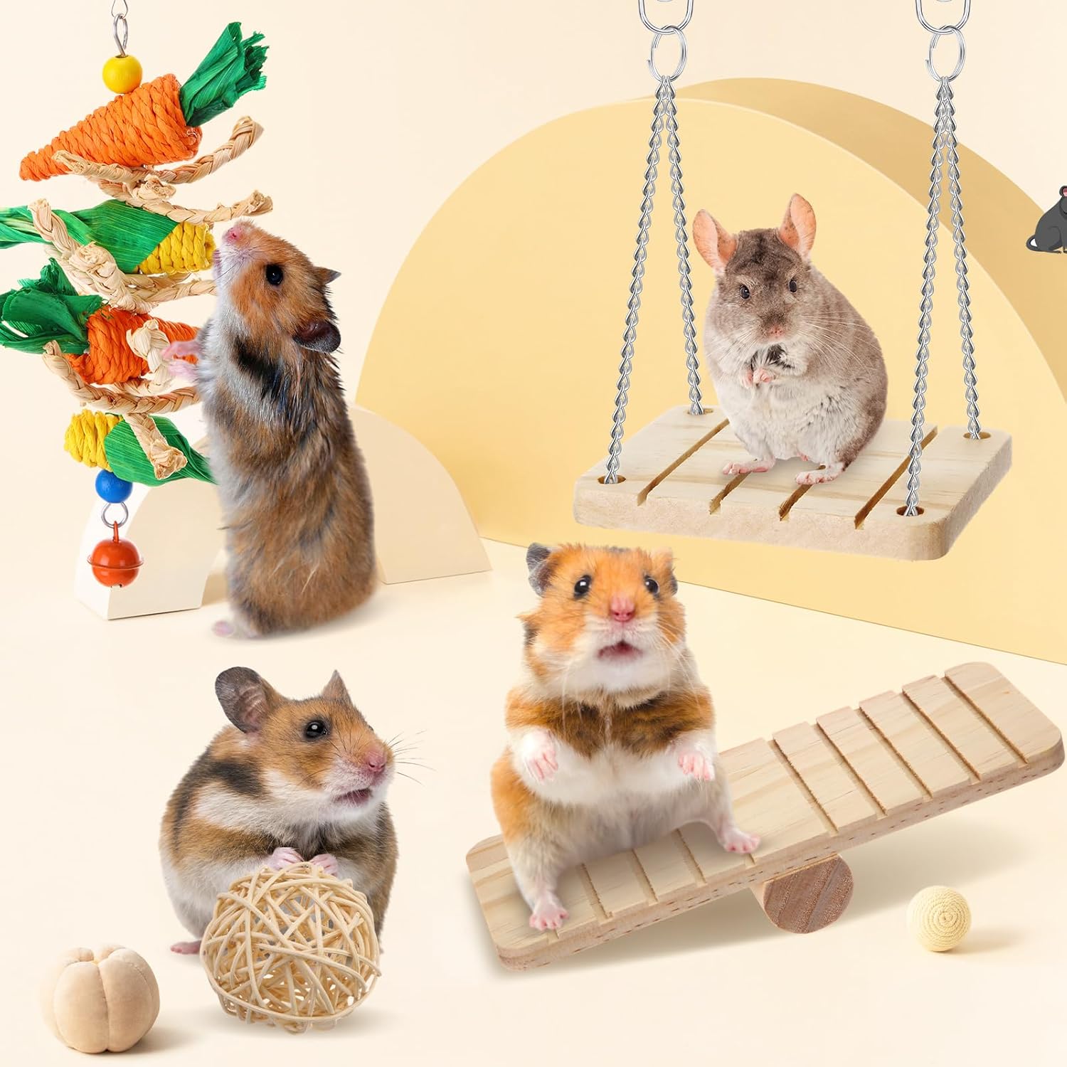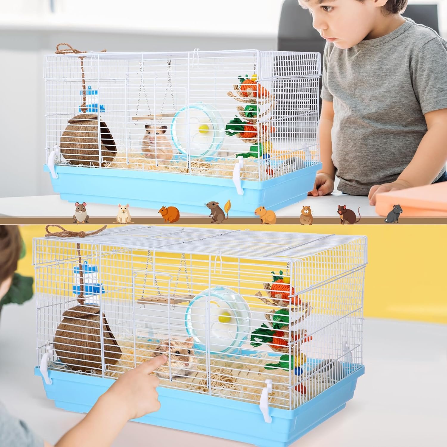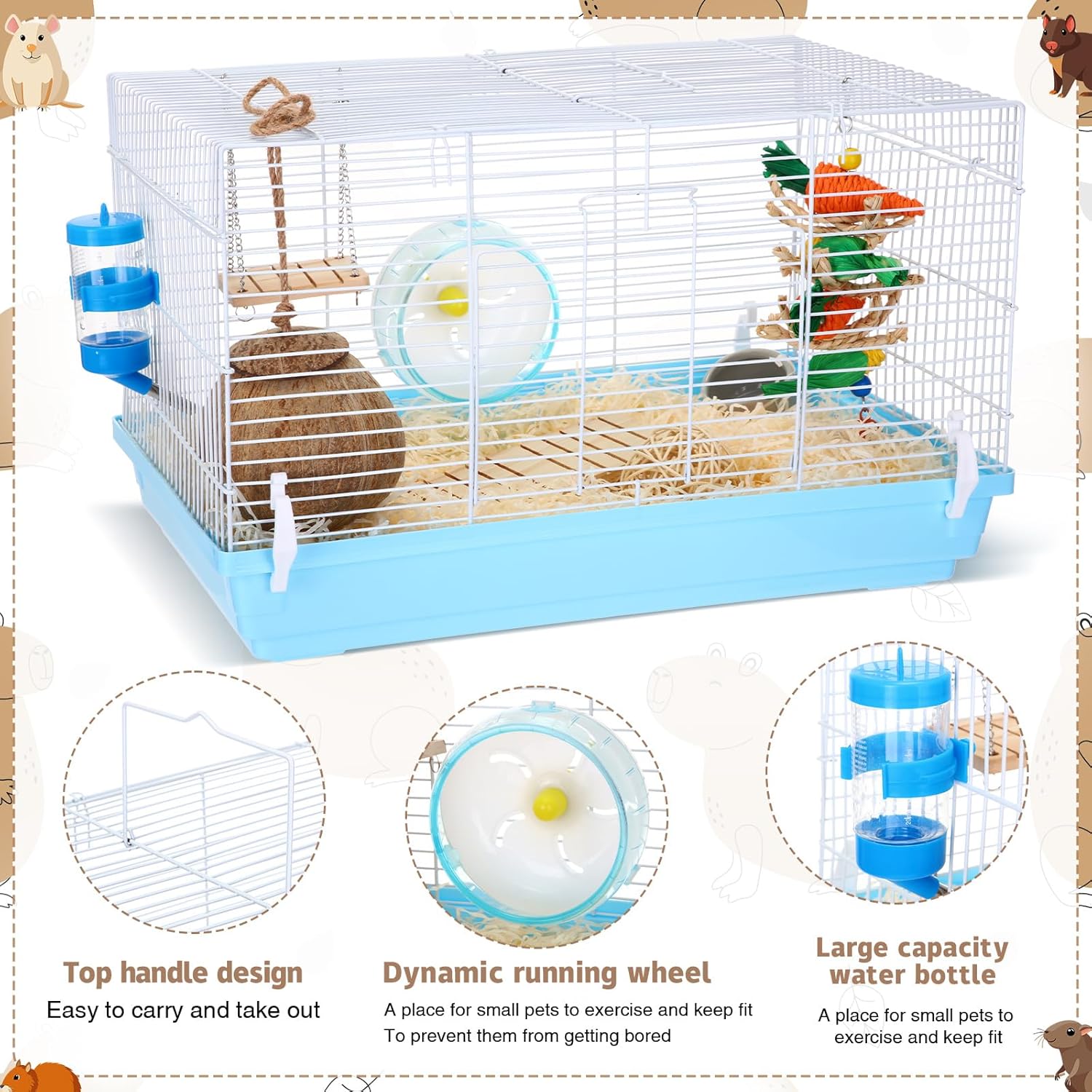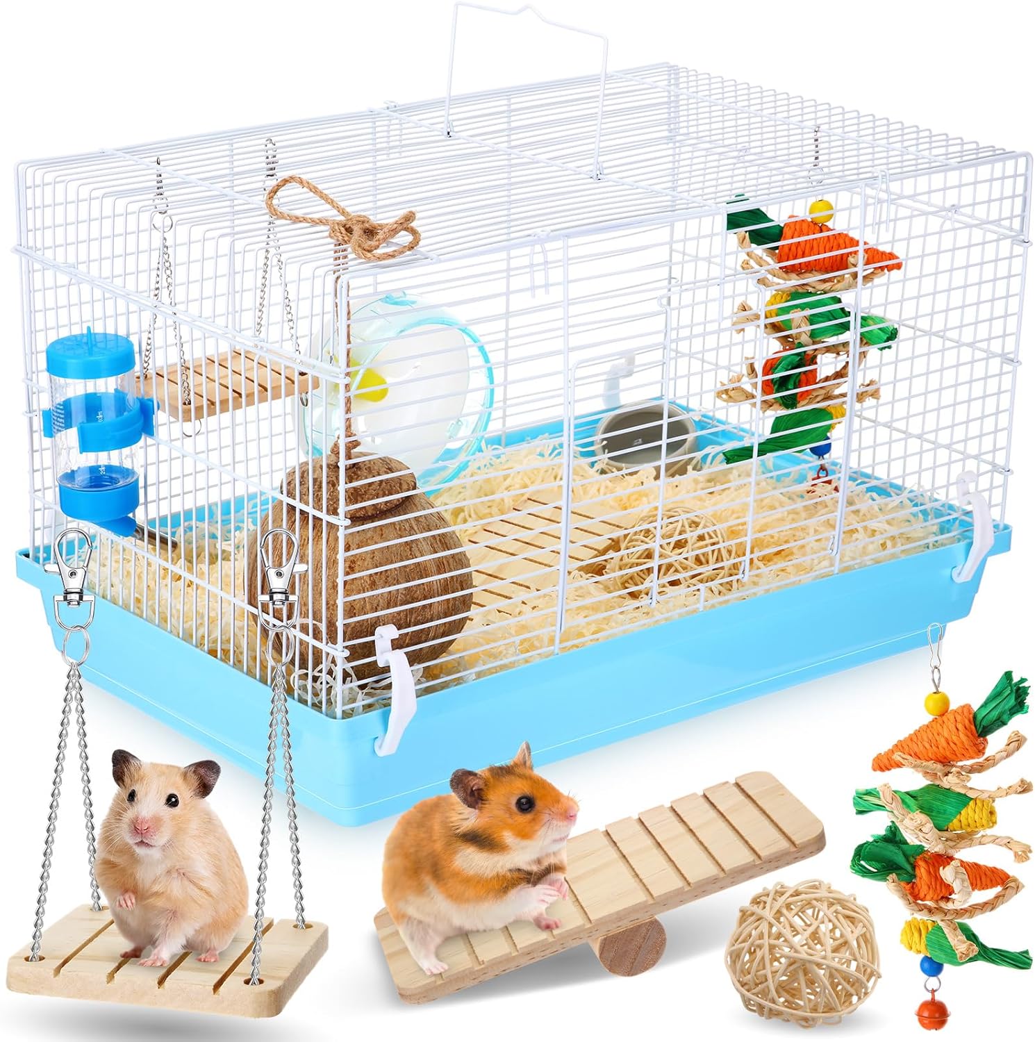 Juego de kit de inicio de hámster: obtendrás todo lo que necesitas para criar un pequeño hámster en el kit de iniciación de hámster: 1 jaula grande para hámster, 1 botella para beber, 1 rueda de ejercicio, 1 cuenco de comida de cerámica, 1 cama de casa de hámster de coco y 4 juguetes para masticar hámster, incluyendo todo lo que necesitas para empezar