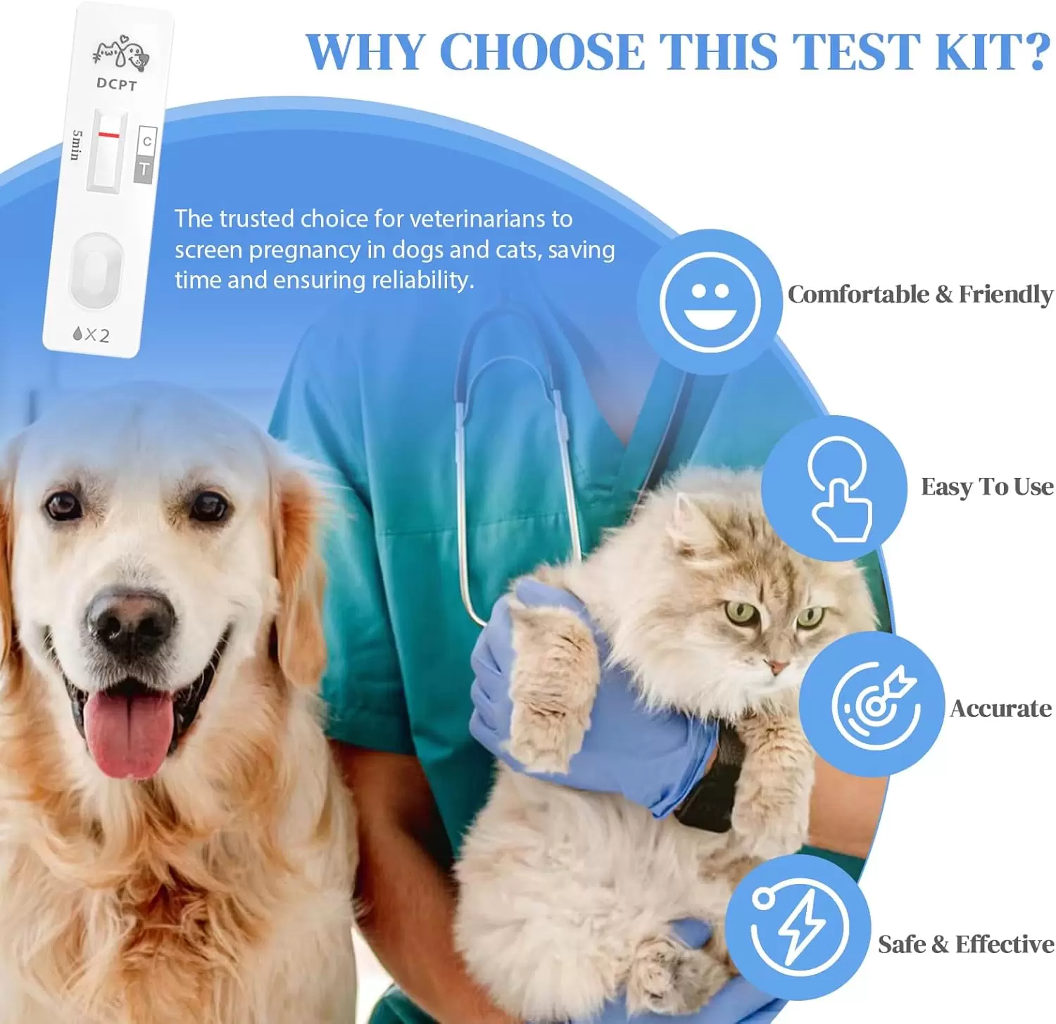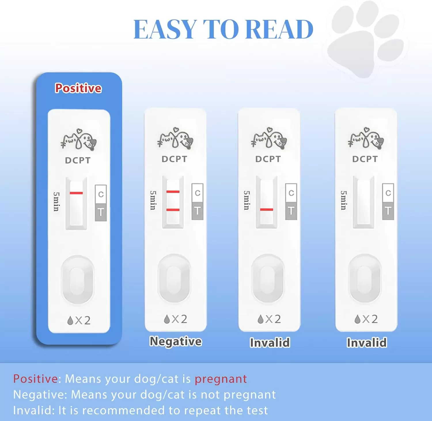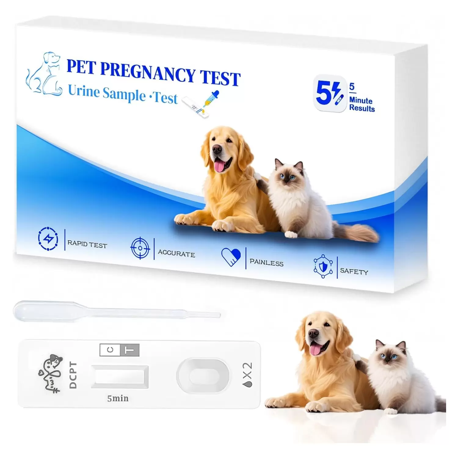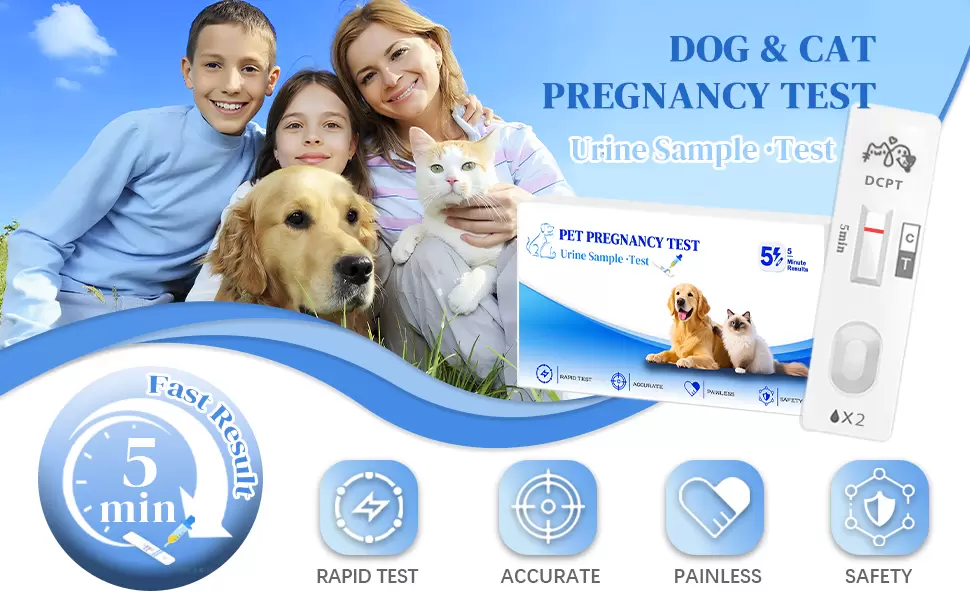 Prueba de embarazo para perros y gatos: Esta prueba de embarazo es adecuada para todas las razas y tamaños de perros y gatos, incluidas las variedades pequeñas, medianas y grandes. Es una solución ideal para la detección temprana del embarazo, dando tranquilidad a los dueños de mascotas.