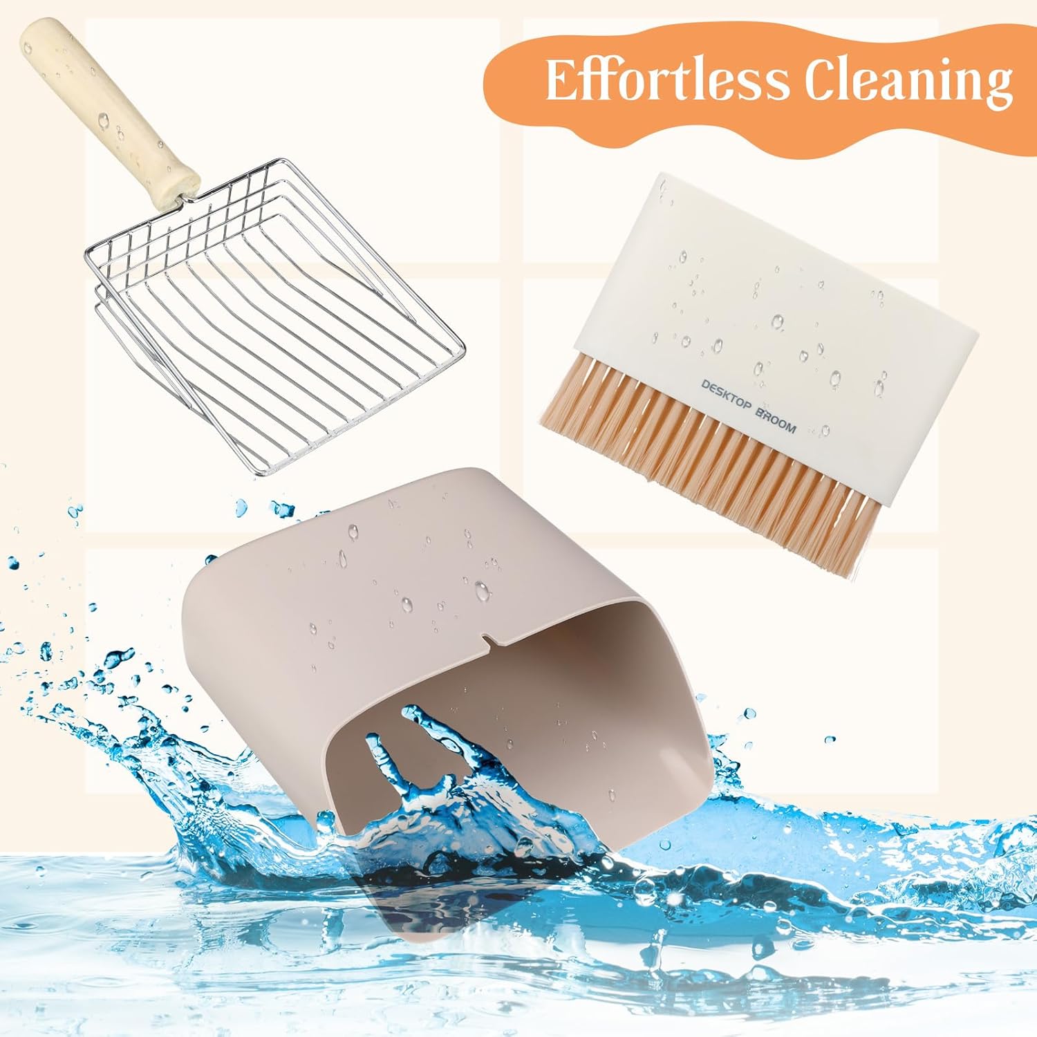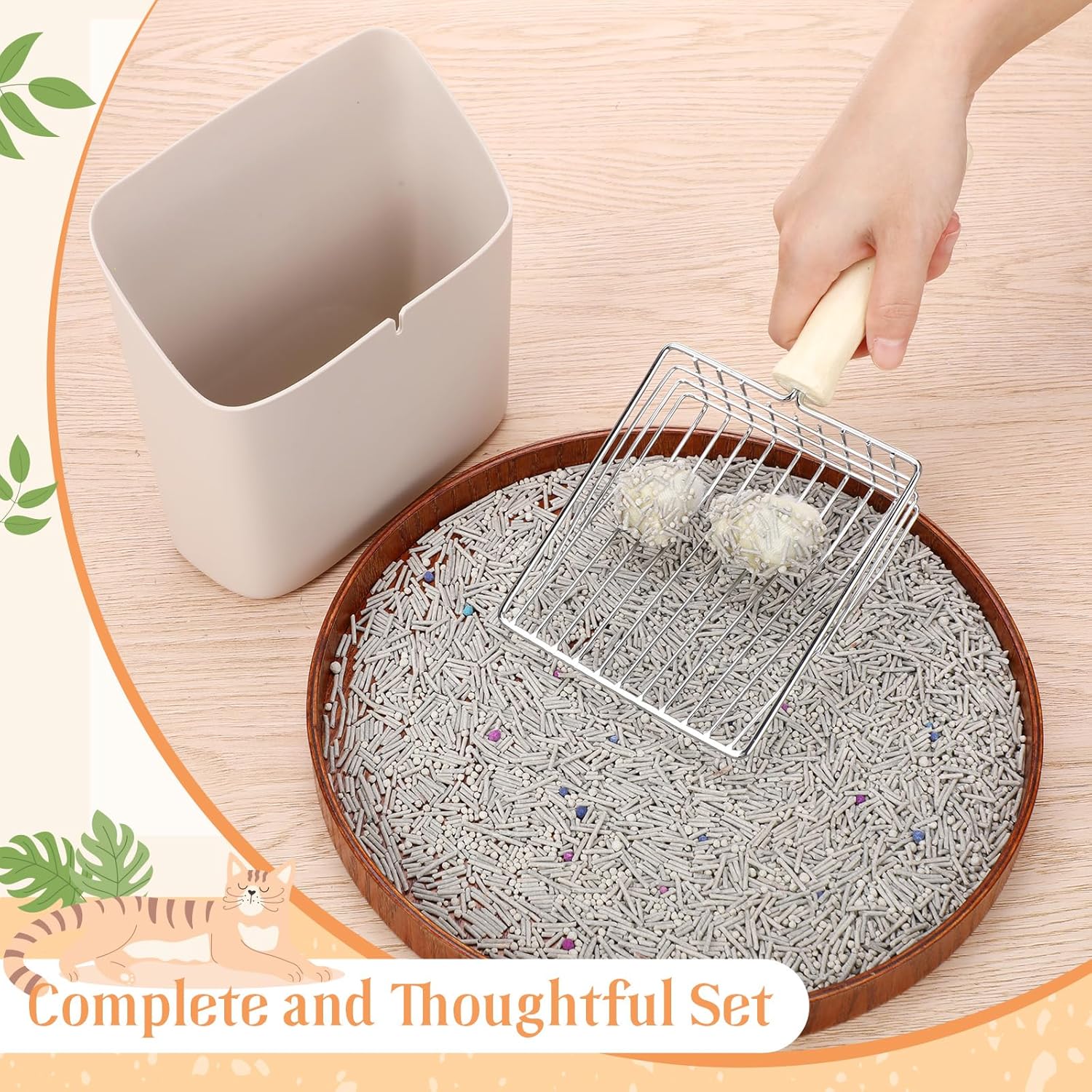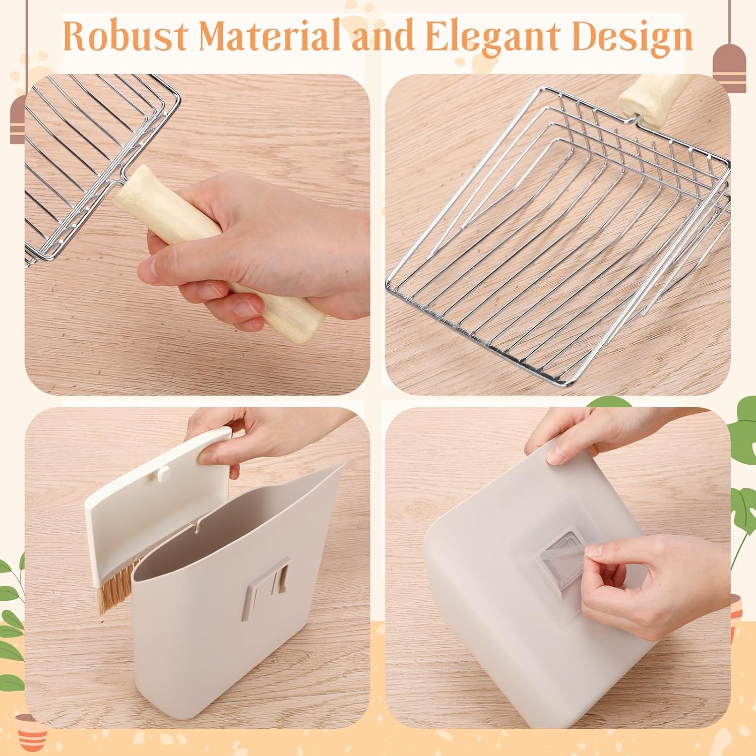 Material robusto y diseño elegante: la pala de arena para gatos está hecha de acero inoxidable resistente para soportar el uso diario con el tiempo; el mango proporciona un agarre firme con su acabado de madera, añadiendo un toque de elegancia; el recogedor, gancho y cepillo, hecho de plástico duradero, complementan la pala con su color gris, añadiendo un toque cómodo a las herramientas de limpieza de tus mascotas