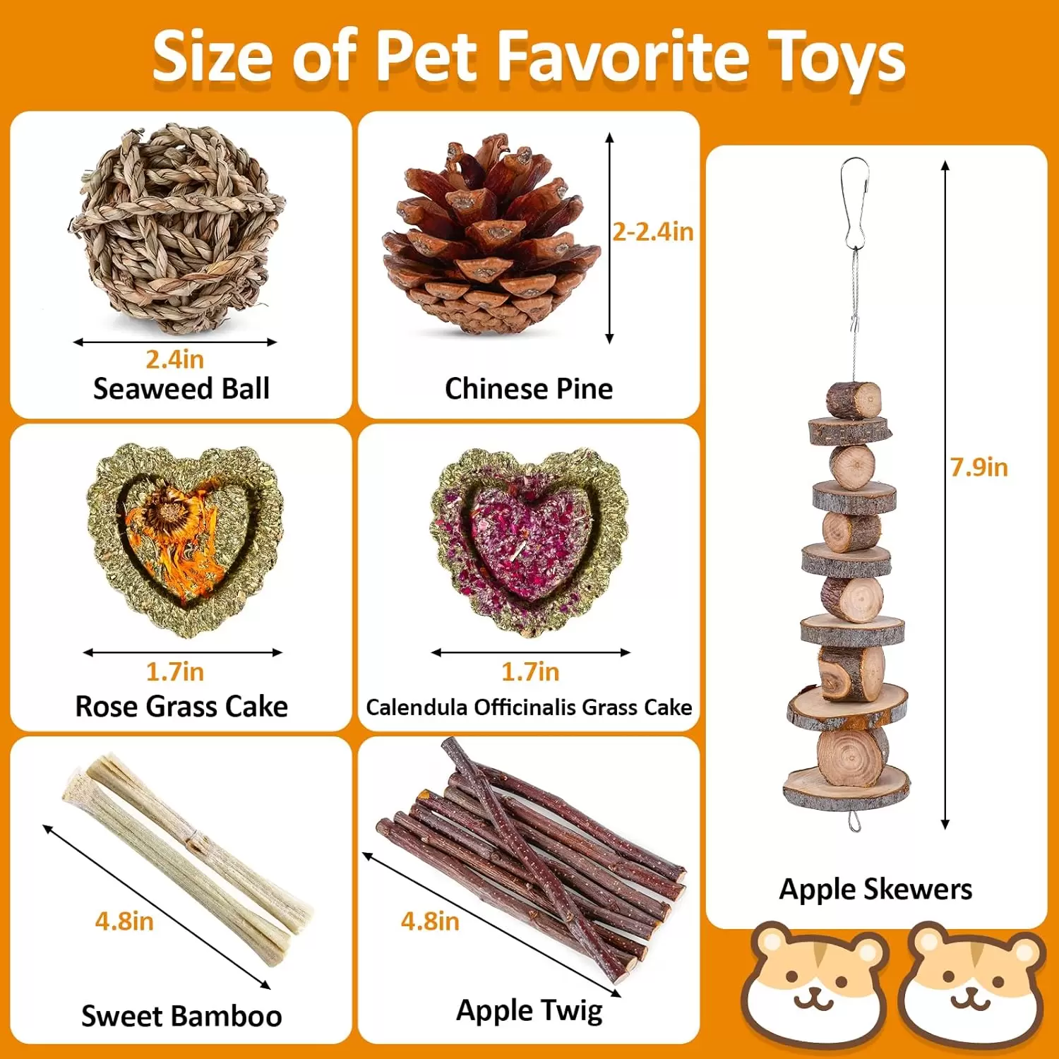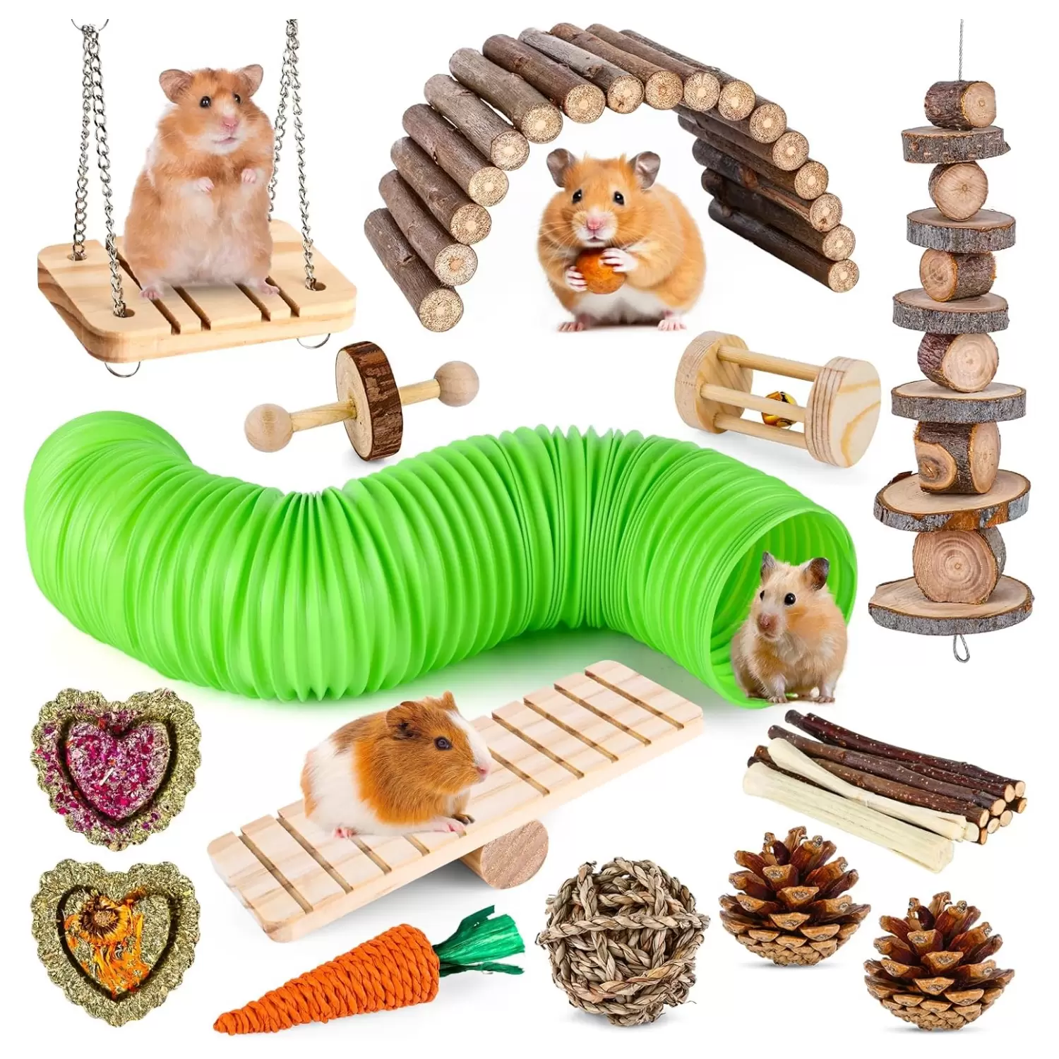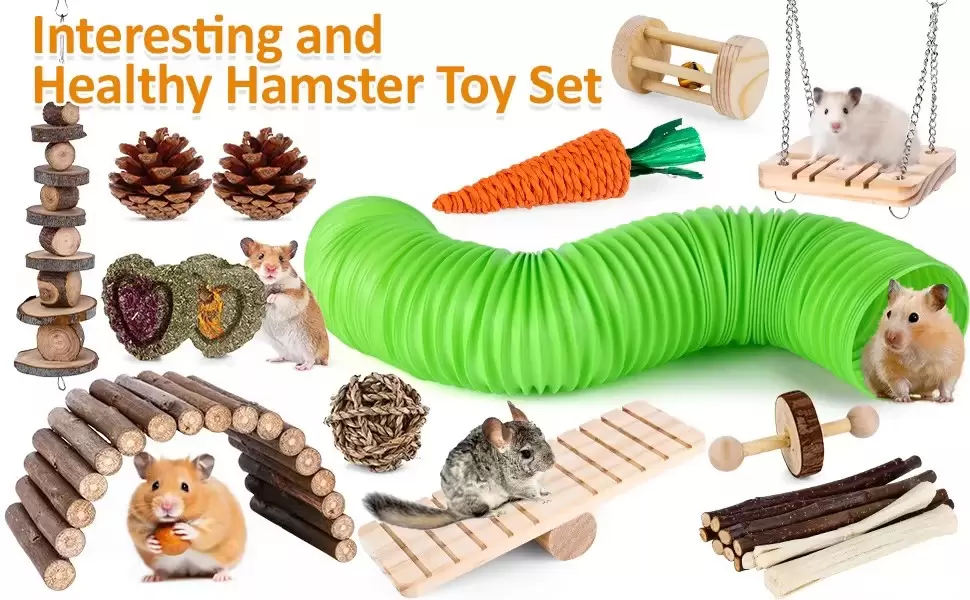 Juguetes de diferentes variedades Nuestro juego de juguetes masticables para hámster incluye: 1 tubería con una longitud de 20 pulgadas después de estirar, 1 puente de madera flexible, 1 columpio de campana, 1 balancín, 1 monociclo, 1 rodillo de campana, 1 brocheta molar de rama de manzana, 2 pasteles de heno timoty, 1 bola de algas, 1 zanahoria, 2 pinos chinos. 0.71 oz* dulce bambú, 0.71 oz* ramita de manzana.