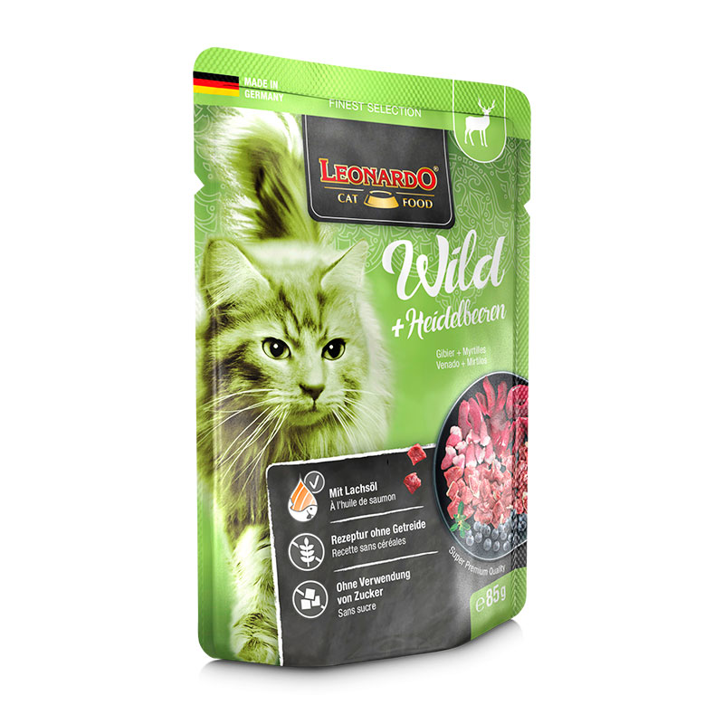 Composición: corazón, hígado y mollejas de ave (37 %); carne de caza (30 %); caldo de carne (29,8 %); arándanos (2 %); cáscaras de huevo, secas (0,5 %); minerales (0,5 %); aceite de salmón (0,2 %)