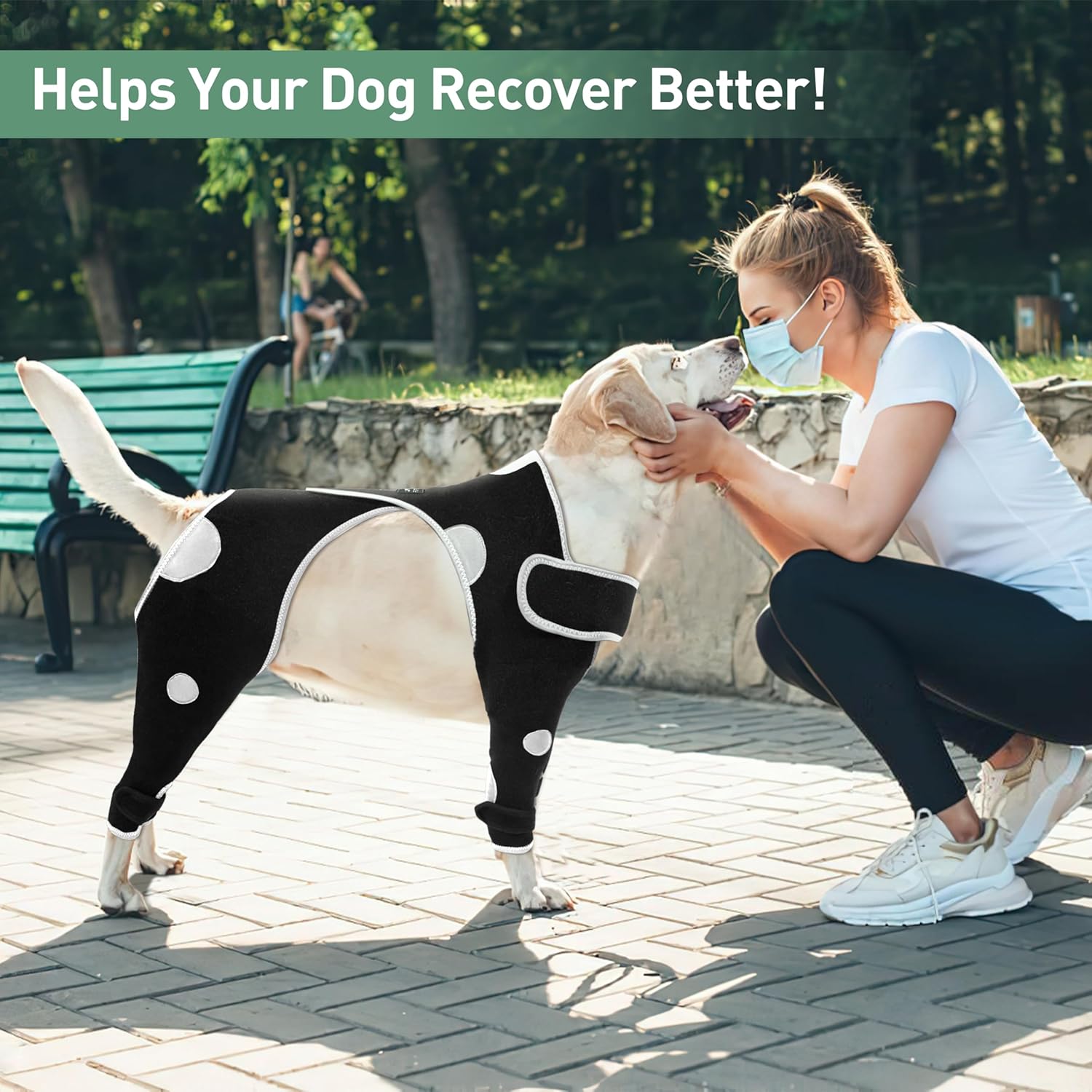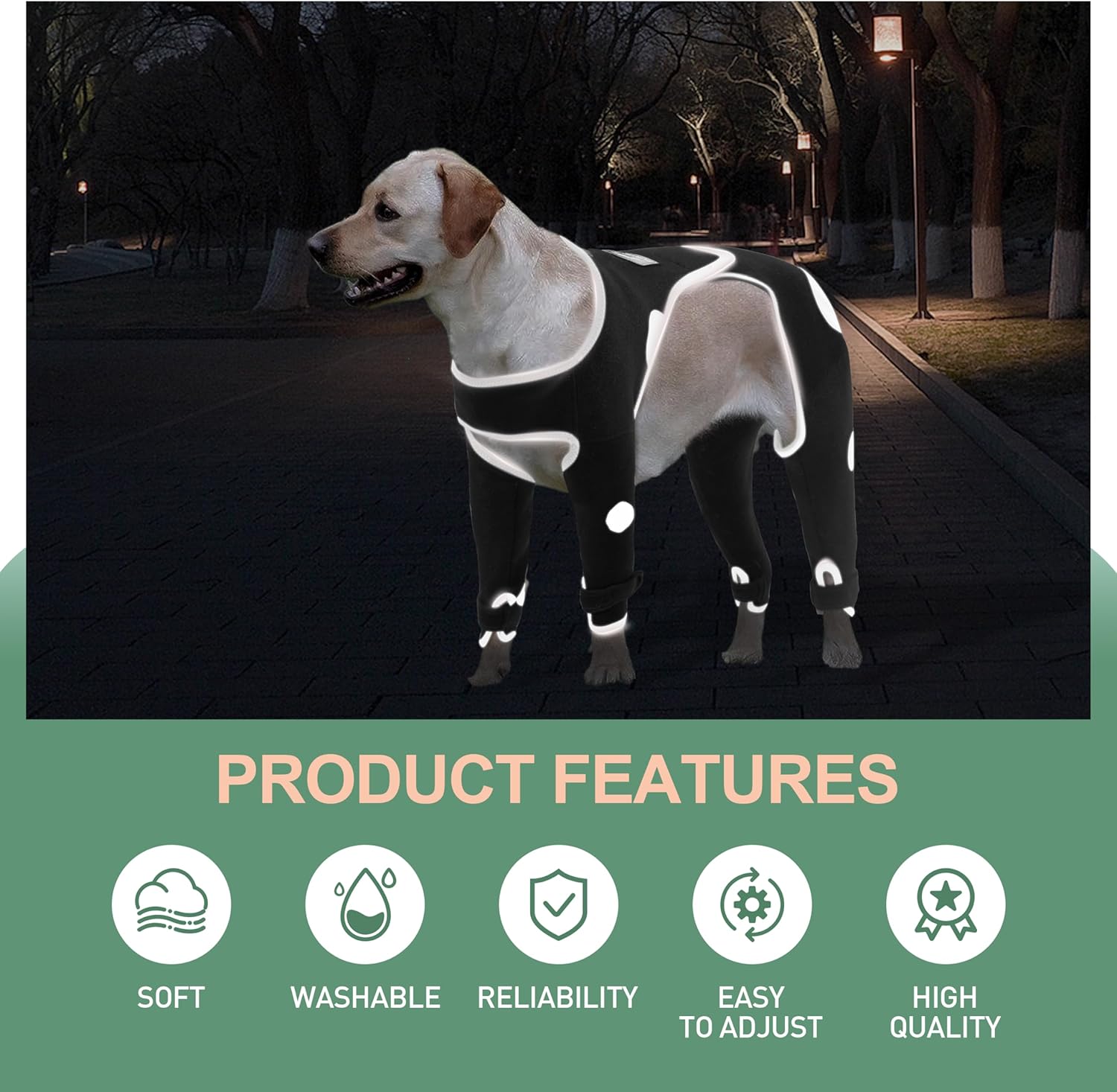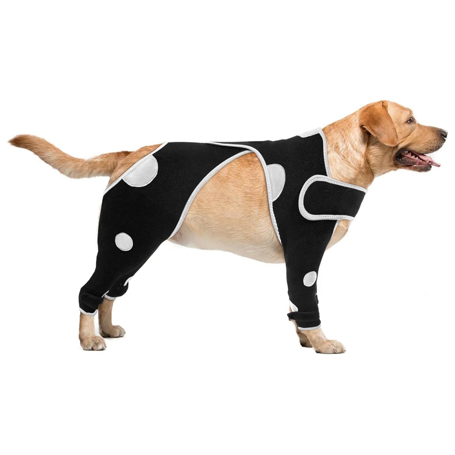 Nuevo diseño: nuestro traje de recuperación para perros proporciona protección completa para las cuatro patas de tu perro y actúa como una armadura resistente cuando juegas al aire libre, reduciendo la ansiedad de tu perro. La capacidad de ajuste de la tela adhesiva elástica hace que las mangas de las piernas delanteras y traseras se conecten para un mejor ajuste y comodidad. El material reflectante mejora la visibilidad y aumenta la seguridad durante los paseos nocturnos, mientras que el diseño de lunares es visualmente más elegante y único.