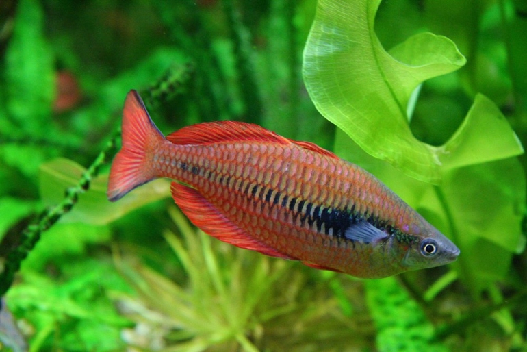 ESTE ARCO IRIS, ES LA MELANOTAENIA MAS APRECIADA POR SU COLOR , ORIGINARIO DE NUEVA GUINEA, LLEGARA A 7 CM EN ACUARIO.