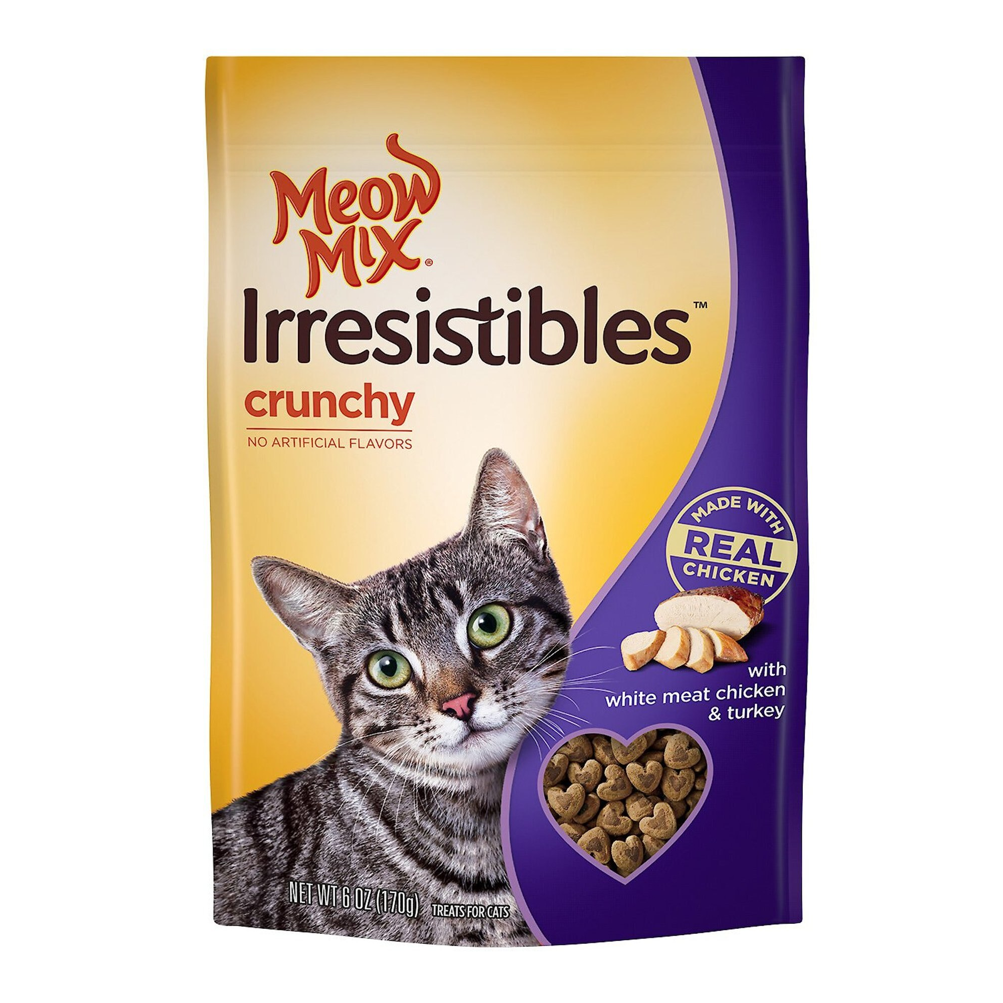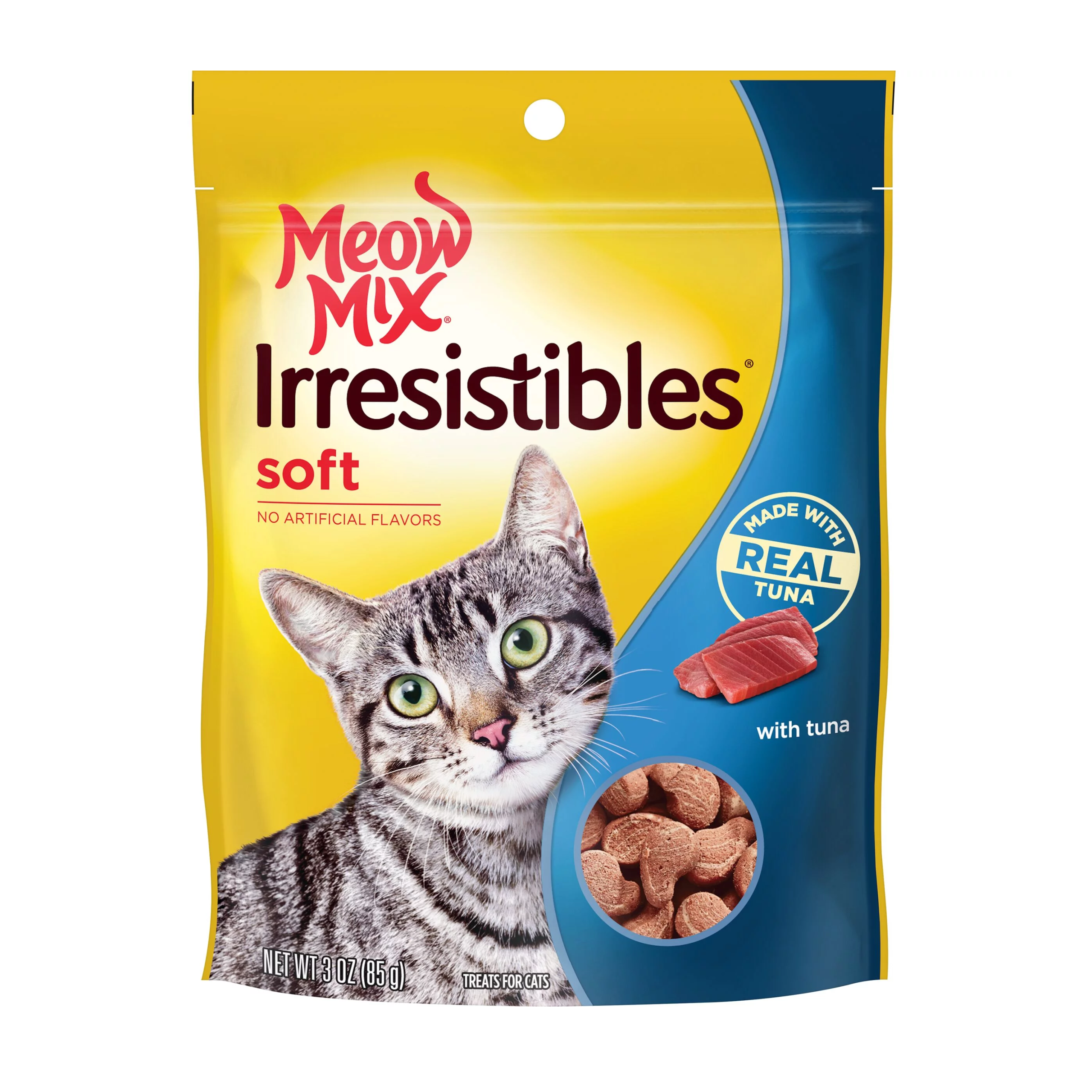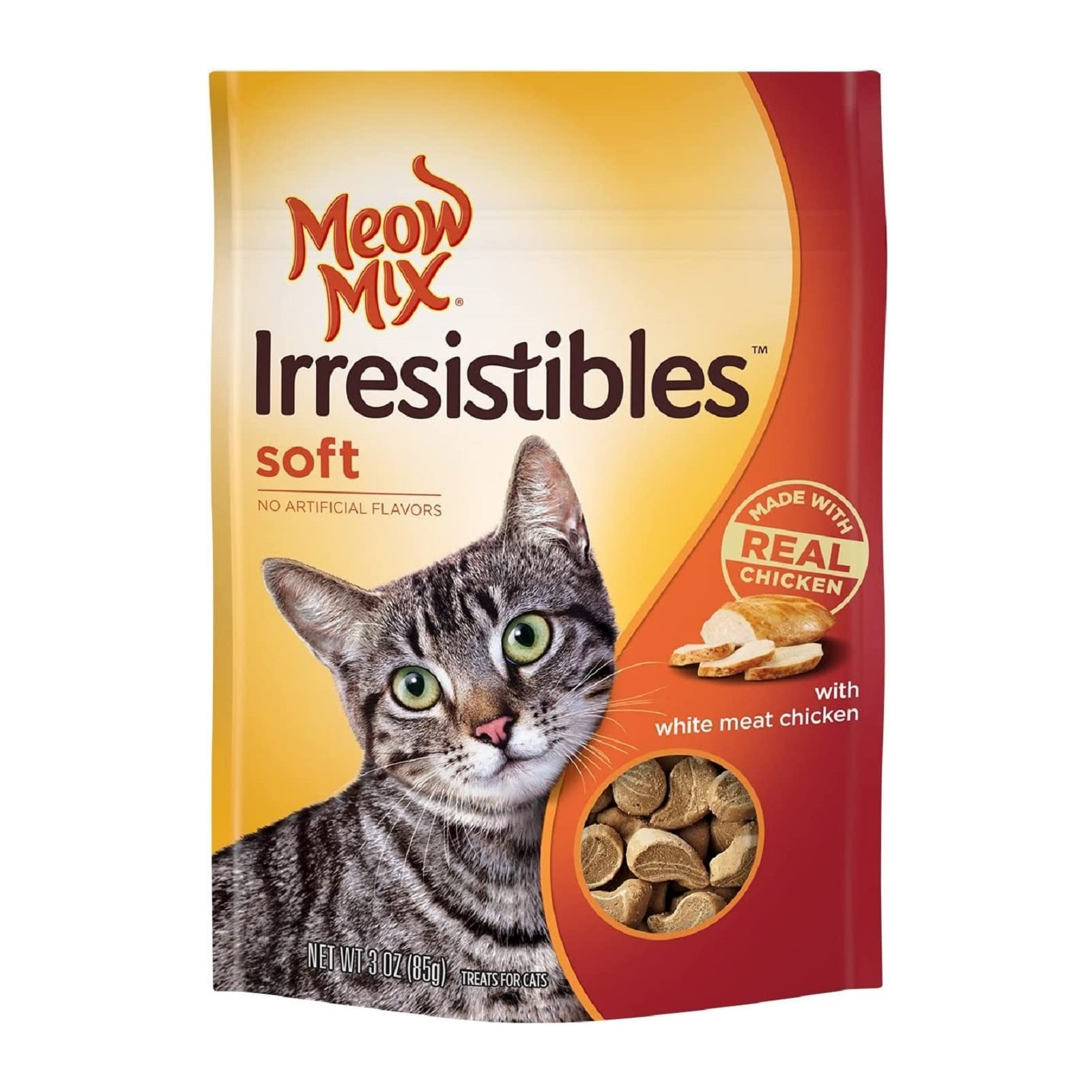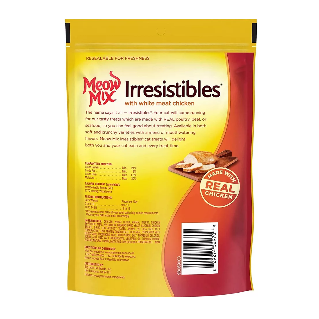 Ahora puedes estar más cerca de tu gato en cualquier momento con un sabroso y pequeño regalo! Meow Mix Irresistibles® está hecho con pollo REAL y sin sabores artificiales para que te sientas bien con el tratamiento. ¡Estas golosinas para gatos tienen un sabor delicioso y una textura suave que a tu gato le encantará, lo que las hace perfectas para compartir más momentos especiales juntos!