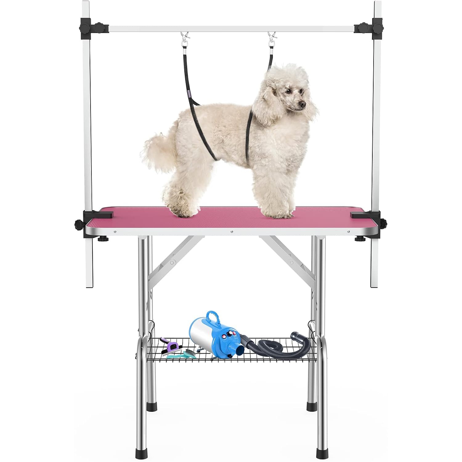Almacenamiento práctico: nuestra mesa de aseo viene con una cesta de almacenamiento, lo que te permite almacenar fácilmente herramientas de aseo, peines y tijeras. Mantén el área de aseo de tu mascota limpia y ordenada, mejorando la eficiencia de tu trabajo.